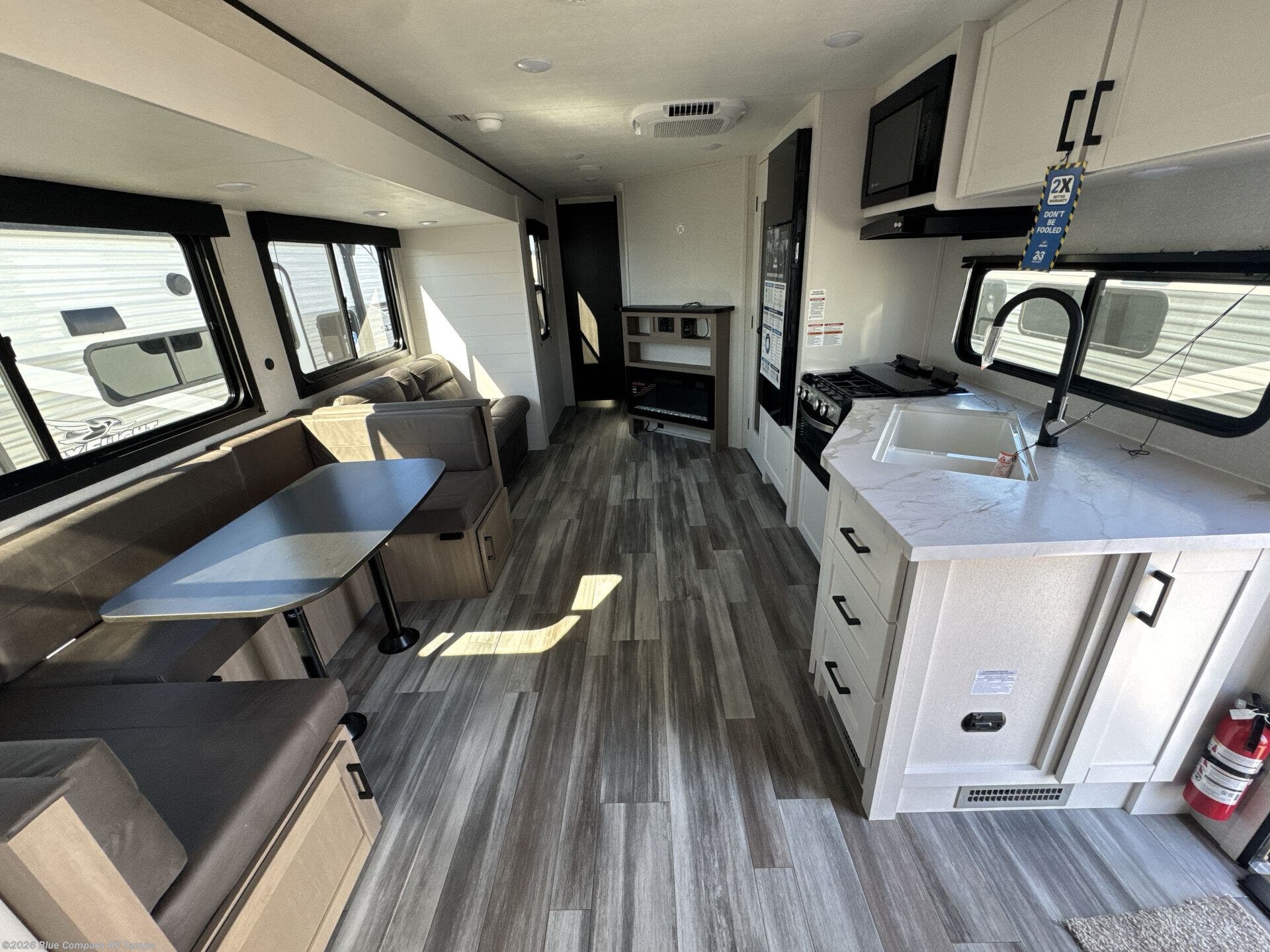 It's time to ditch that old tent and upgrade to this spacious travel trailer! There is a rear private bunkhouse includes a flip-up bunk over a 28" x 76" bunk, plus a bunk across the room and a wardrobe. You'll enjoy the front private bedroom all to yourselves with a queen bed and dual wardrobes, and the full bath is close by for easy nighttime use. A U-shaped dinette slide and sofa in the main living area provide your crew with space to relax and dine together, and the fully equipped kitchen lets you cook up your best meals. Outside, you'll find exterior storage, an 18' power awning, plus an outdoor refrigerator, shelf, and TV prep!