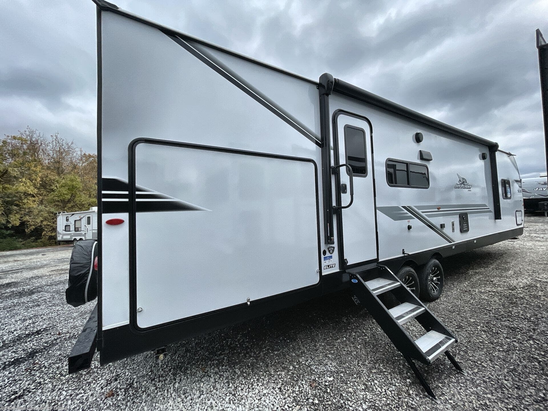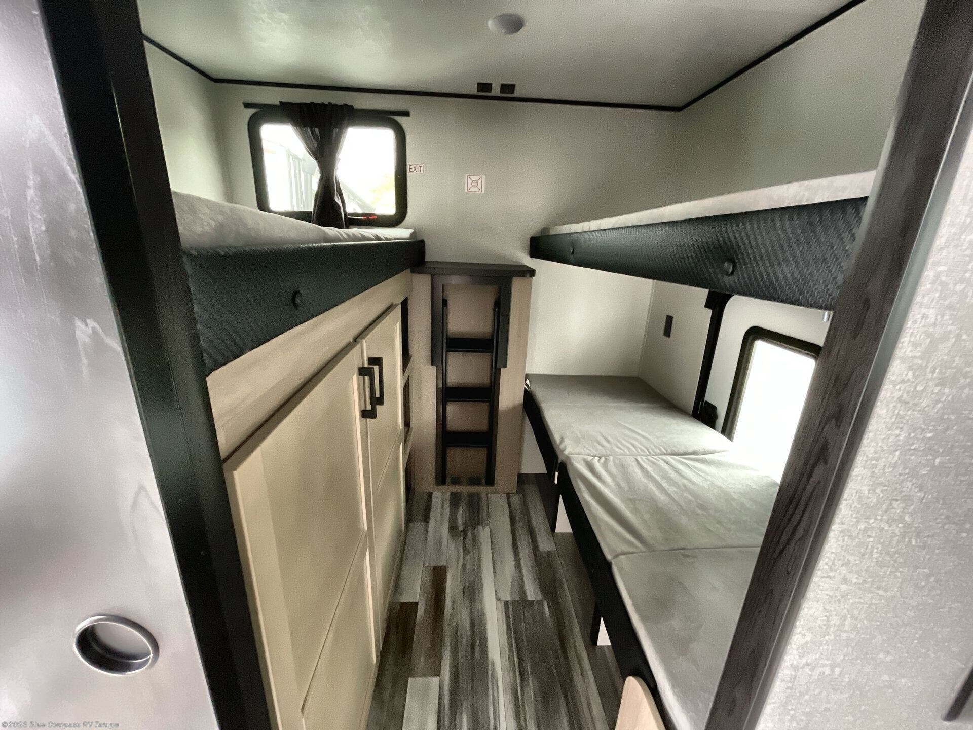 It's time to ditch that old tent and upgrade to this spacious travel trailer! There is a rear private bunkhouse includes a flip-up bunk over a 28" x 76" bunk, plus a bunk across the room and a wardrobe. You'll enjoy the front private bedroom all to yourselves with a queen bed and dual wardrobes, and the full bath is close by for easy nighttime use. A U-shaped dinette slide and sofa in the main living area provide your crew with space to relax and dine together, and the fully equipped kitchen lets you cook up your best meals. Outside, you'll find exterior storage, an 18' power awning, plus an outdoor refrigerator, shelf, and TV prep!