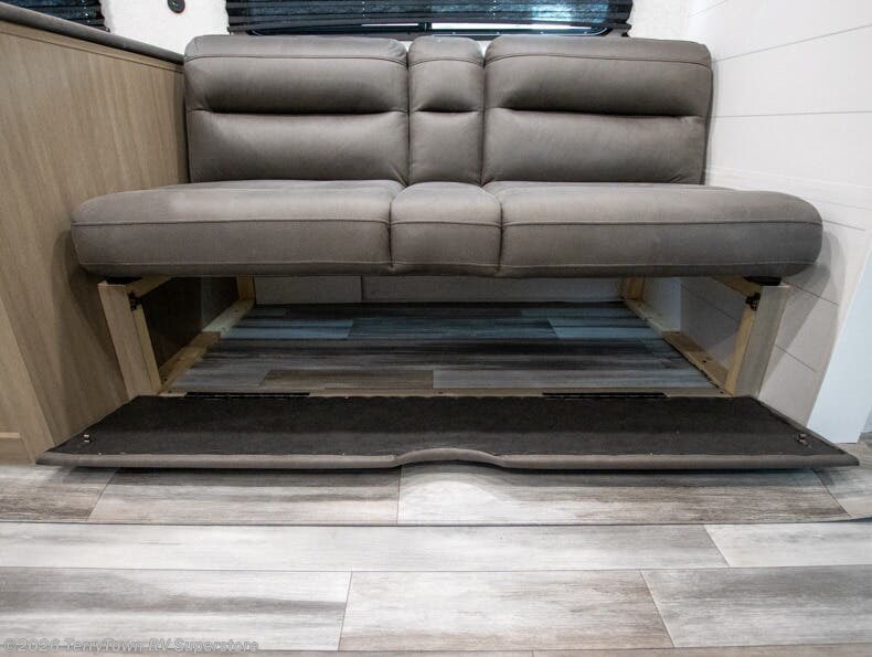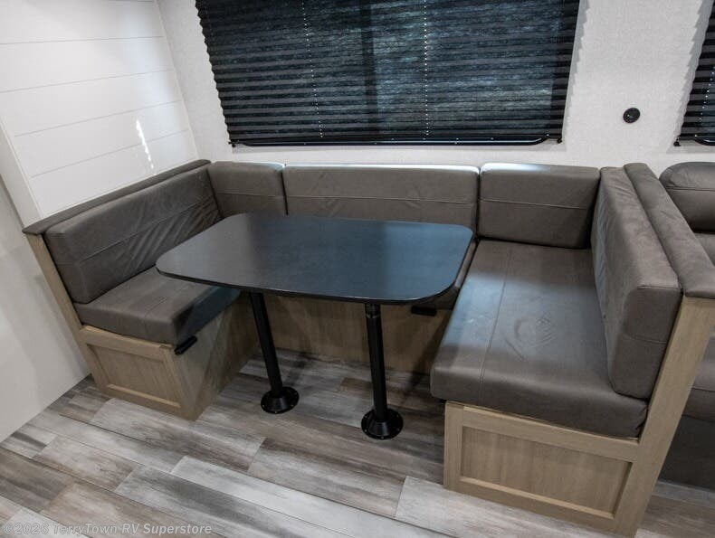 The whole gang can join along on camping trips in this double slide out travel trailer! There is a rear private bunkhouse with a bunk bed and J-cube futon sofa below plus two additional bunks across the room. You'll find your own space in the front private bedroom, which also includes an RV queen bed and dual wardrobes. The middle kitchen and living room will be a favorite place to come together since there is a jack-knife sofa and U-shaped dinette plus a fully-equipped kitchen to make meals each day. This model also includes a full bath with one of the dual entry doors for added convenience!