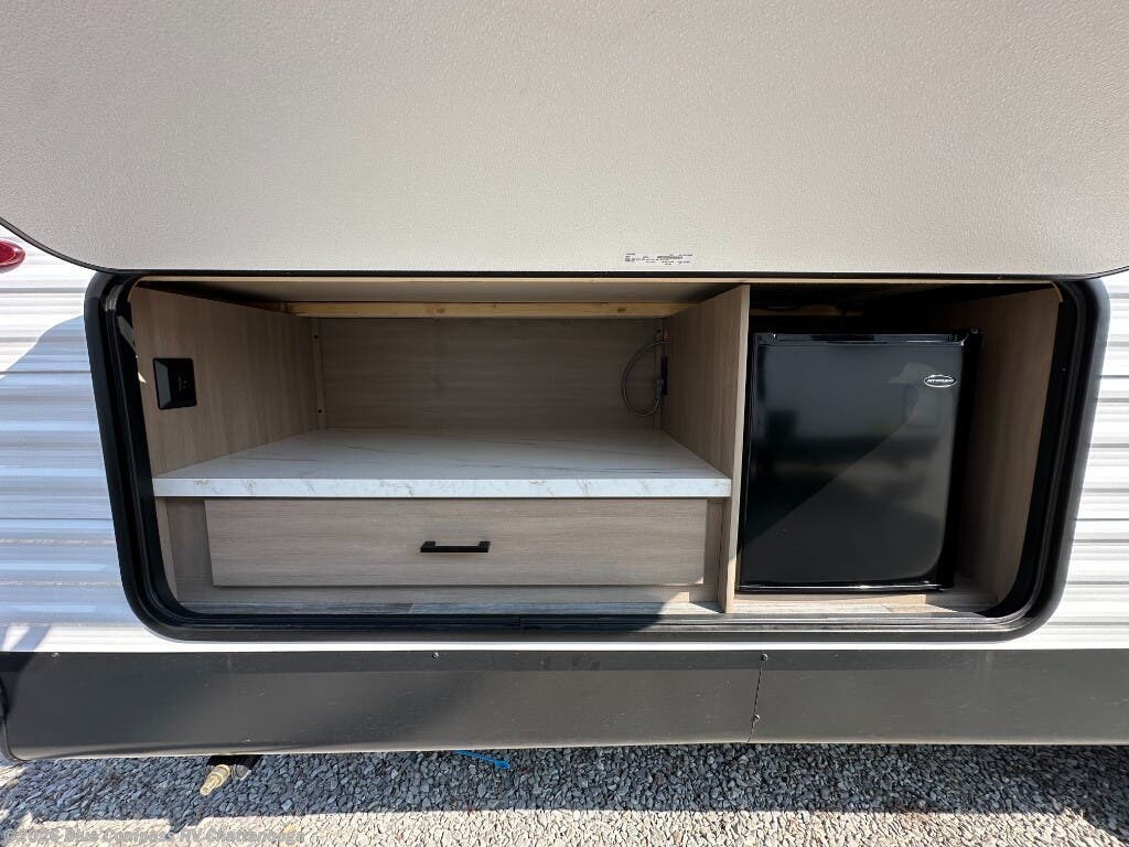 It's time to ditch that old tent and upgrade to this spacious travel trailer! The little ones or your guests will love the double-size bunks in the rear bunkhouse, along with a half bath and storage space for their things. You'll enjoy the front private bedroom all to yourselves with a queen bed and dual wardrobes, and the full bath is close by for easy nighttime use. A U-shaped dinette slide and sofa in the main living area provide your crew with space to relax and dine together, and the fully equipped kitchen lets you cook up your best meals. Outside, you'll find exterior storage, a 20' power awning, plus an outdoor kitchen to enjoy a sunrise breakfast!