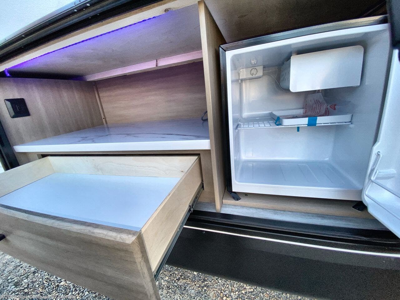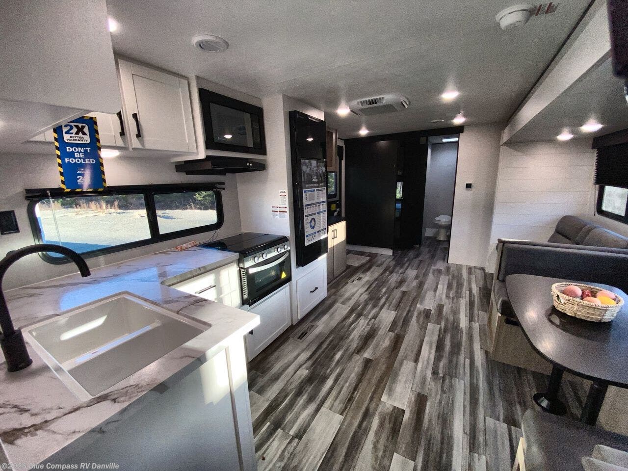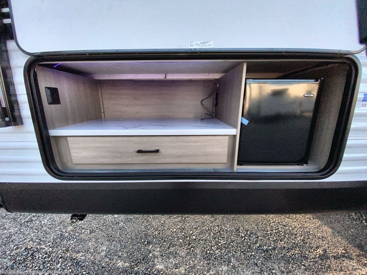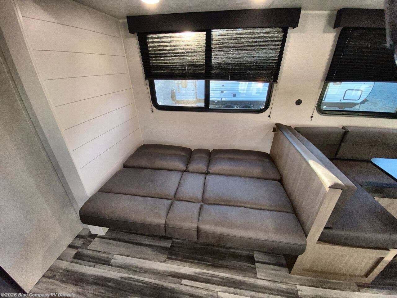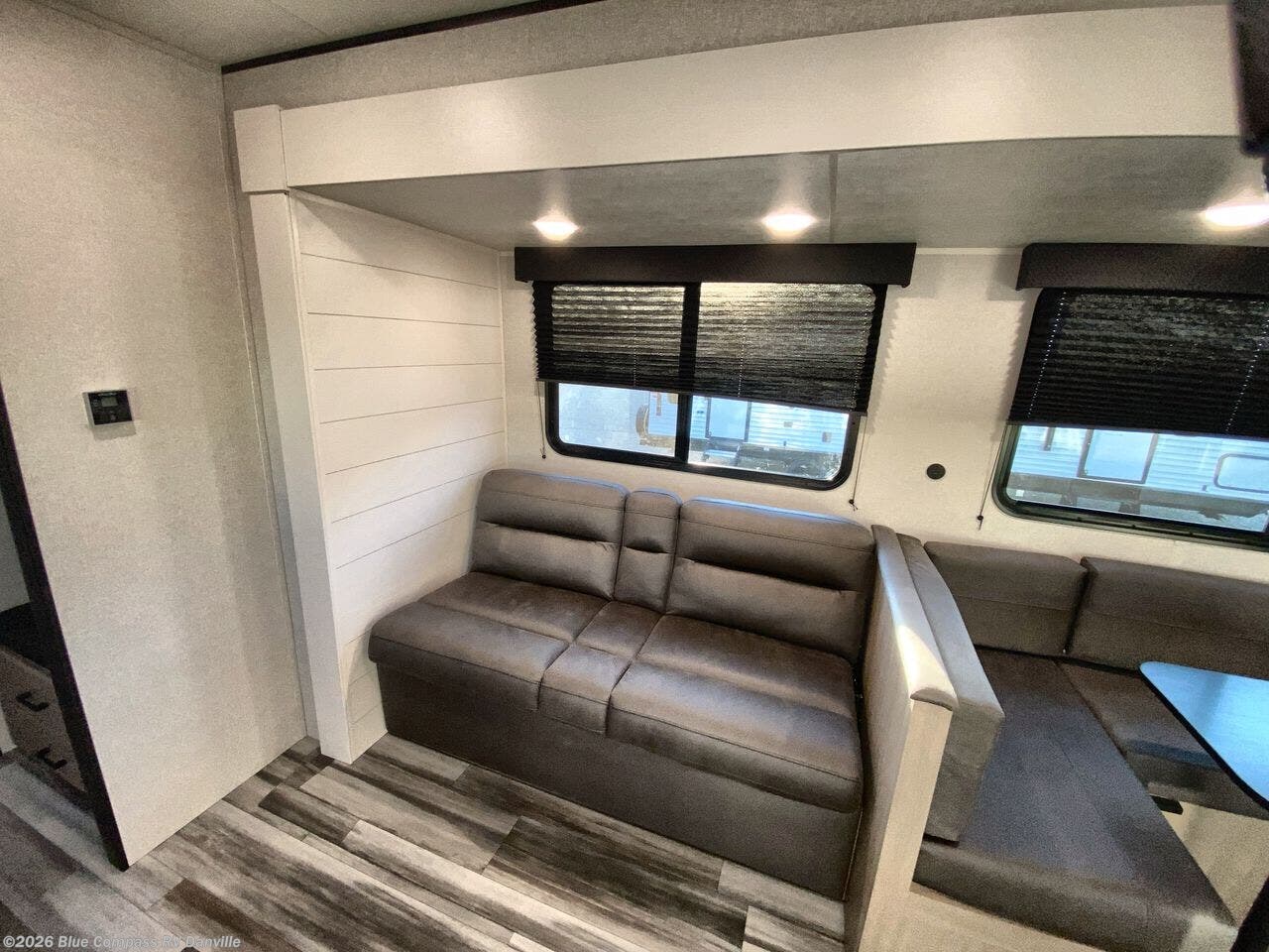 It's time to ditch that old tent and upgrade to this spacious travel trailer! The little ones or your guests will love the double-size bunks in the rear bunkhouse, along with a half bath and storage space for their things. You'll enjoy the front private bedroom all to yourselves with a queen bed and dual wardrobes, and the full bath is close by for easy nighttime use. A U-shaped dinette slide and sofa in the main living area provide your crew with space to relax and dine together, and the fully equipped kitchen lets you cook up your best meals. Outside, you'll find exterior storage, a 20' power awning, plus an outdoor kitchen to enjoy a sunrise breakfast!