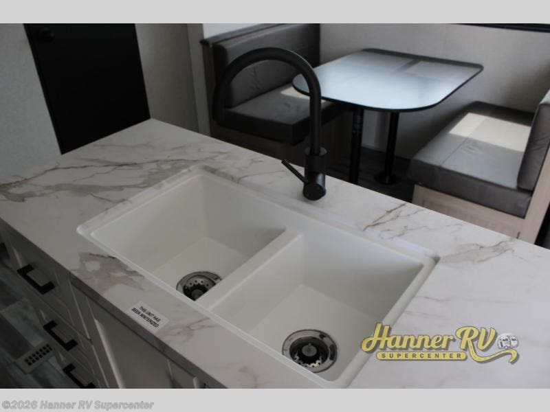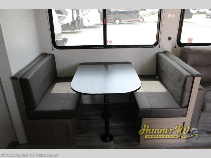 The whole gang can join along on camping trips in this triple slide out travel trailer! There is a rear private bunkhouse with a bunk bed and J-cube futon sofa below plus a second bunk bed and storage below to help keep this space tidy. You'll find your own space in the front private bedroom, which also includes a queen bed and dual wardrobes. The middle kitchen and living room will be a favorite place to come together since there is a jack-knife sofa and booth dinette, a kitchen island, plus a fully-equipped kitchen to make meals each day. There is also an exterior camp kitchen when you want fresh air!