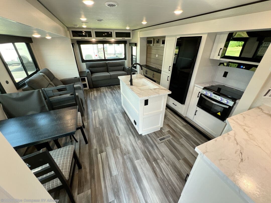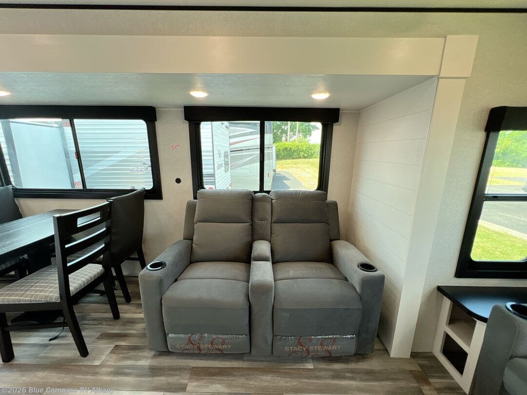 Enjoy a relaxing weekend getaway in this travel trailer! The dual entry bathroom with radius shower creates a front master suite with a queen bed slide, a dresser, and a front large wardrobe with storage space plus washer and dryer prep. The chef will have an easy time preparing their best home cooked meals with the kitchen island, hutch, three burner cooktop, and 12V refrigerator. Enjoy your meals at the booth dinette then play a card game or transform it into an extra sleeping space. The rear living area has a rear Jack-knife sofa for a quick afternoon nap and theater seating across from the entertainment center with a fireplace for the perfect spot on movie night!