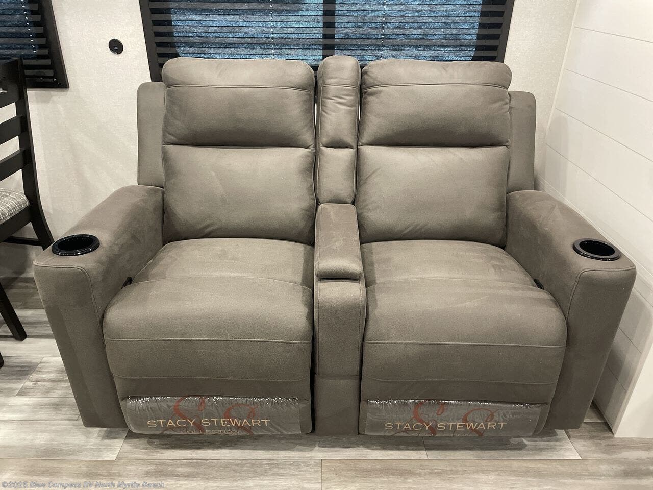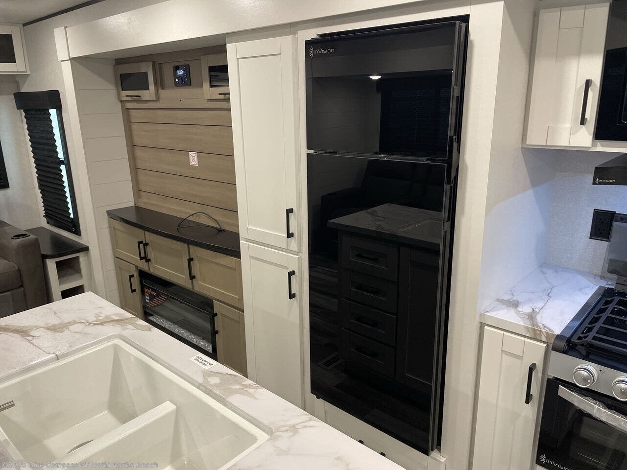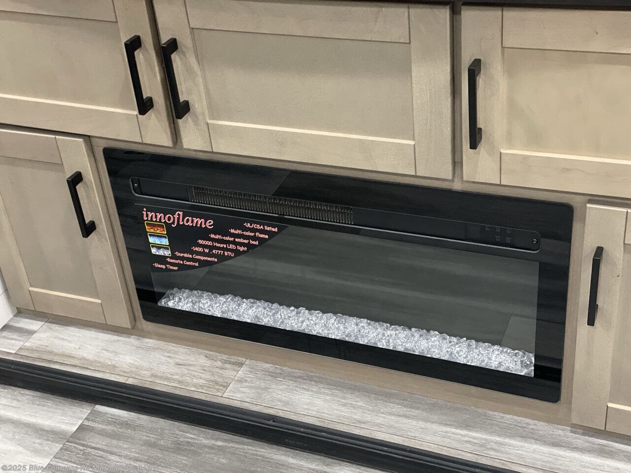 Enjoy a relaxing weekend getaway in this travel trailer! The dual entry bathroom with radius shower creates a front master suite with a queen bed slide, a dresser, and a front large wardrobe with storage space plus washer and dryer prep. The chef will have an easy time preparing their best home cooked meals with the kitchen island, hutch, three burner cooktop, and 12V refrigerator. Enjoy your meals at the booth dinette then play a card game or transform it into an extra sleeping space. The rear living area has a rear Jack-knife sofa for a quick afternoon nap and theater seating across from the entertainment center with a fireplace for the perfect spot on movie night!