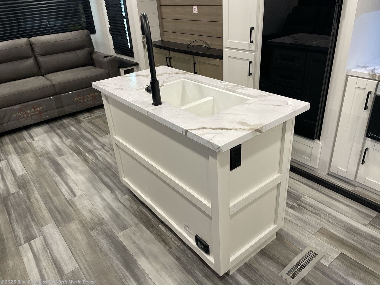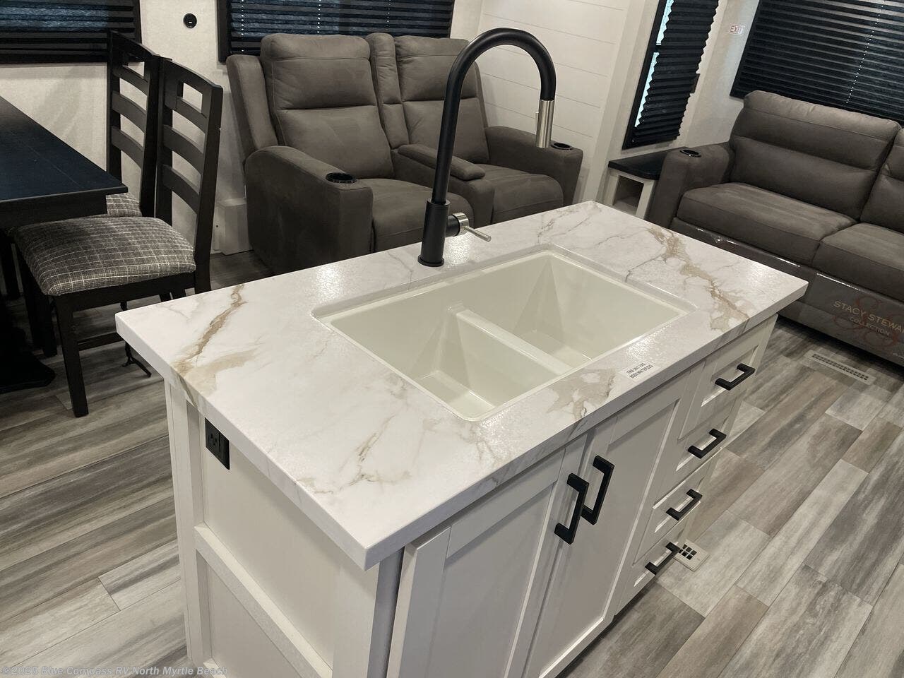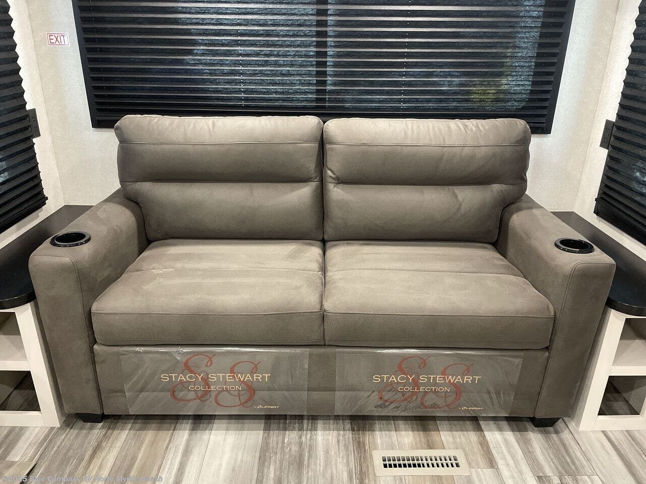Enjoy a relaxing weekend getaway in this travel trailer! The dual entry bathroom with radius shower creates a front master suite with a queen bed slide, a dresser, and a front large wardrobe with storage space plus washer and dryer prep. The chef will have an easy time preparing their best home cooked meals with the kitchen island, hutch, three burner cooktop, and 12V refrigerator. Enjoy your meals at the booth dinette then play a card game or transform it into an extra sleeping space. The rear living area has a rear Jack-knife sofa for a quick afternoon nap and theater seating across from the entertainment center with a fireplace for the perfect spot on movie night!
