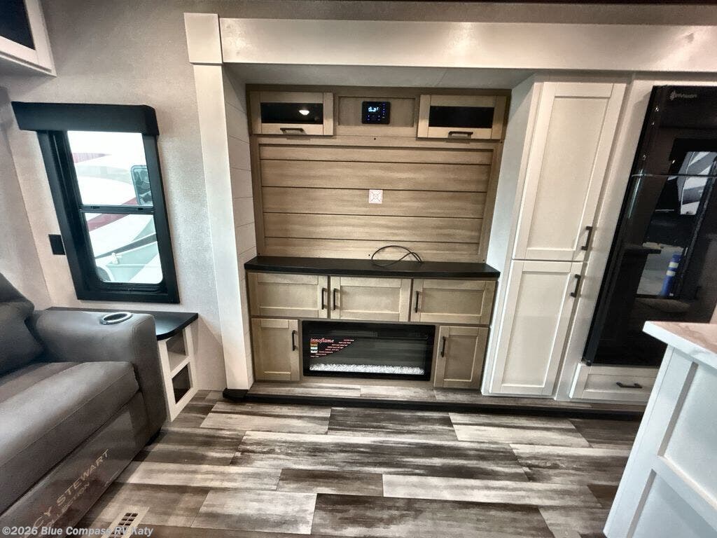 Enjoy a relaxing weekend getaway in this travel trailer! The dual entry bathroom with radius shower creates a front master suite with a queen bed slide, a dresser, and a front large wardrobe with storage space plus washer and dryer prep. The chef will have an easy time preparing their best home cooked meals with the kitchen island, hutch, three burner cooktop, and 12V refrigerator. Enjoy your meals at the booth dinette then play a card game or transform it into an extra sleeping space. The rear living area has a rear Jack-knife sofa for a quick afternoon nap and theater seating across from the entertainment center with a fireplace for the perfect spot on movie night!