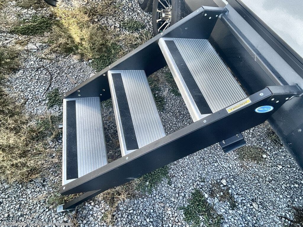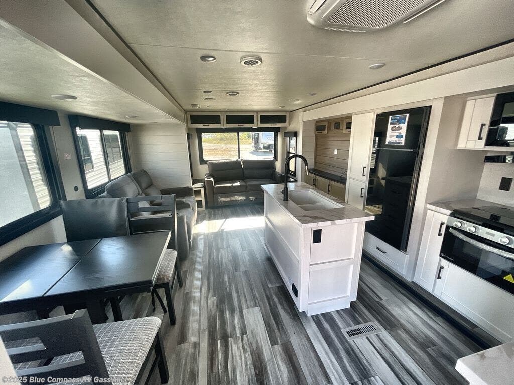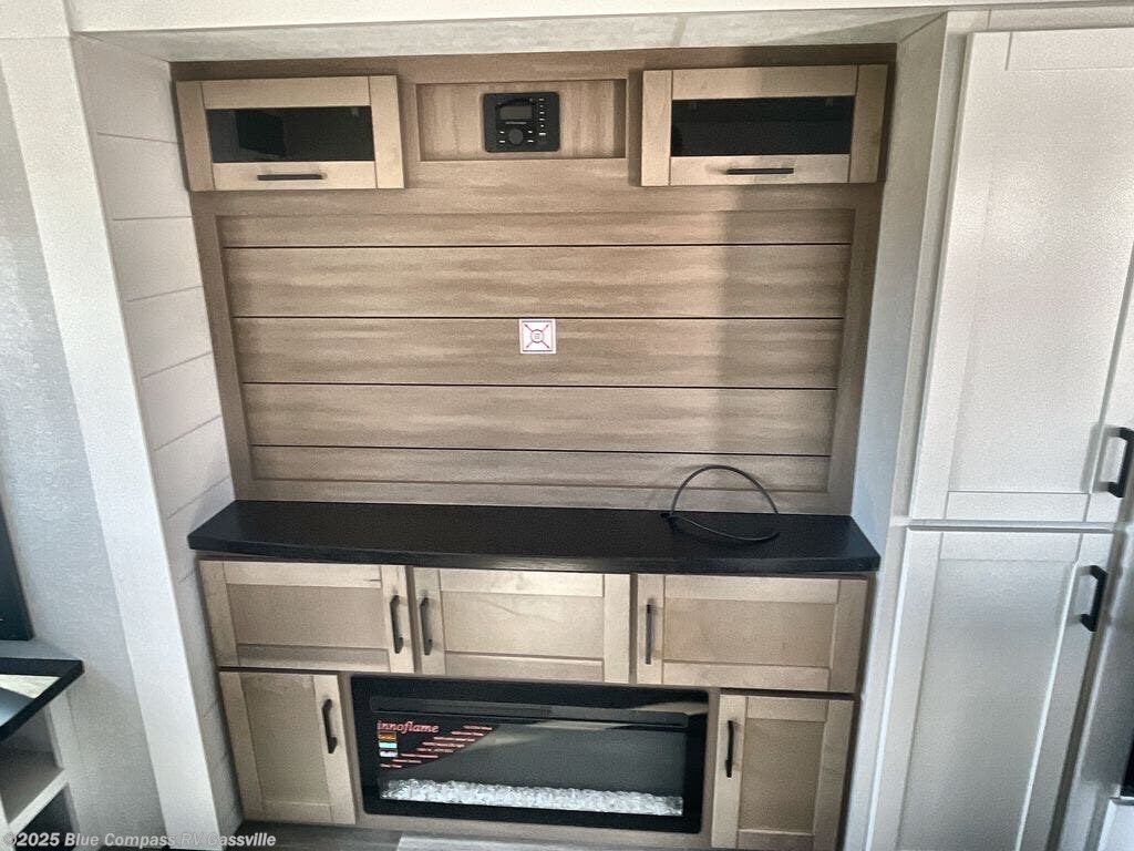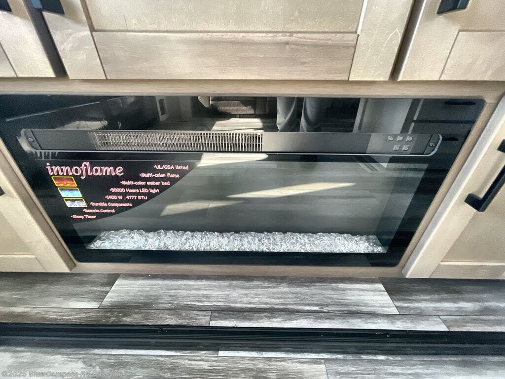 Enjoy a relaxing weekend getaway in this travel trailer! The dual entry bathroom with radius shower creates a front master suite with a queen bed slide, a dresser, and a front large wardrobe with storage space plus washer and dryer prep. The chef will have an easy time preparing their best home cooked meals with the kitchen island, hutch, three burner cooktop, and 12V refrigerator. Enjoy your meals at the booth dinette then play a card game or transform it into an extra sleeping space. The rear living area has a rear Jack-knife sofa for a quick afternoon nap and theater seating across from the entertainment center with a fireplace for the perfect spot on movie night!