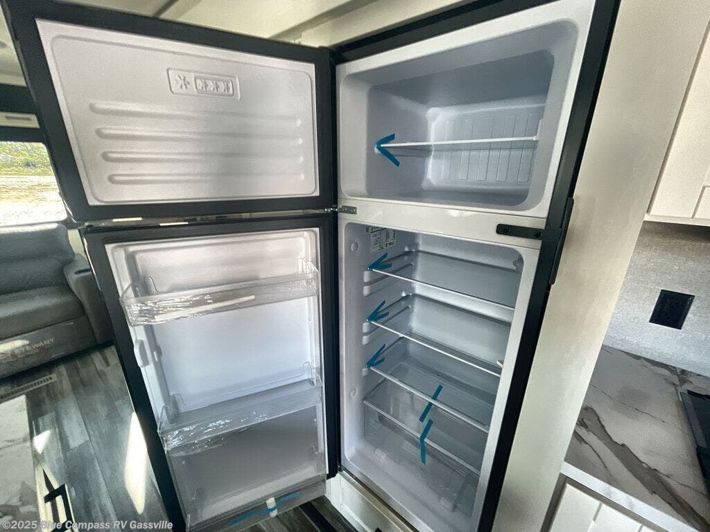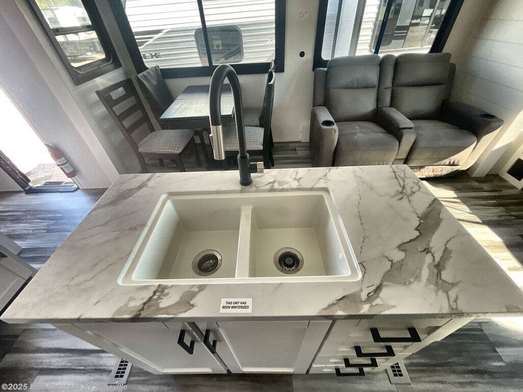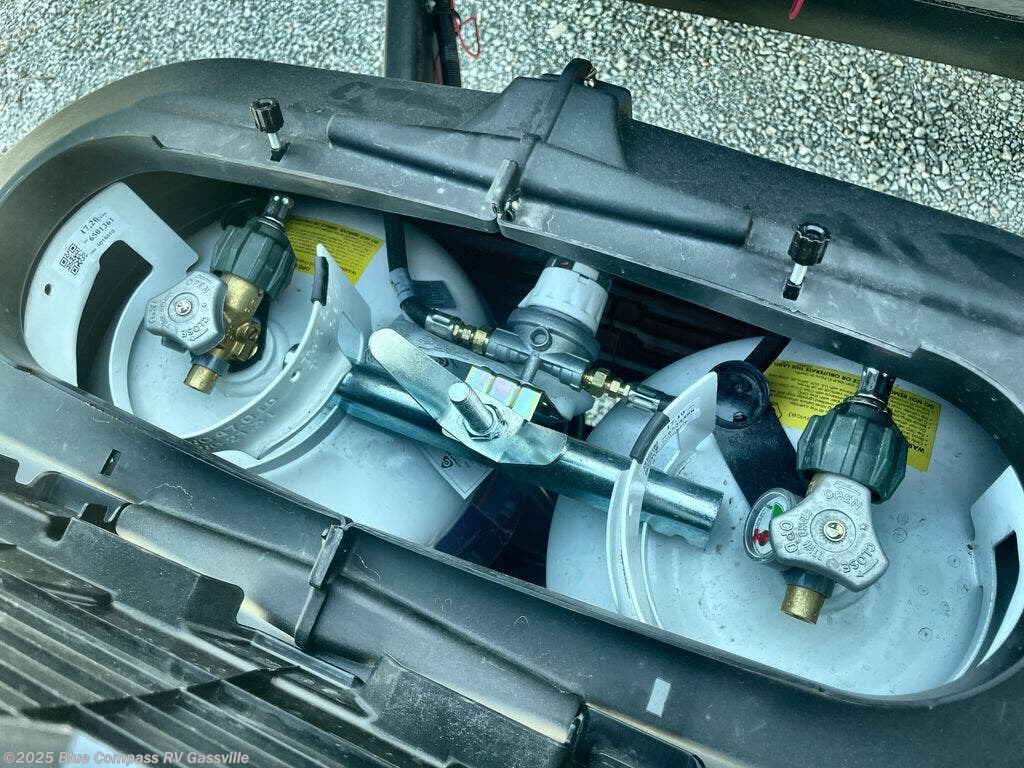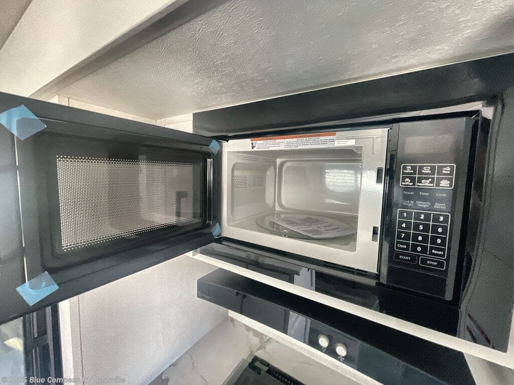 Enjoy a relaxing weekend getaway in this travel trailer! The dual entry bathroom with radius shower creates a front master suite with a queen bed slide, a dresser, and a front large wardrobe with storage space plus washer and dryer prep. The chef will have an easy time preparing their best home cooked meals with the kitchen island, hutch, three burner cooktop, and 12V refrigerator. Enjoy your meals at the booth dinette then play a card game or transform it into an extra sleeping space. The rear living area has a rear Jack-knife sofa for a quick afternoon nap and theater seating across from the entertainment center with a fireplace for the perfect spot on movie night!