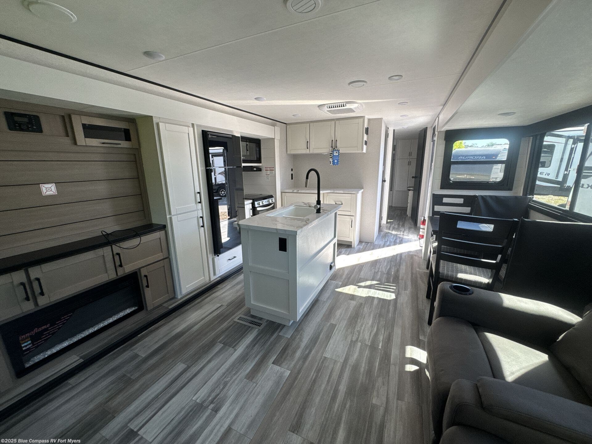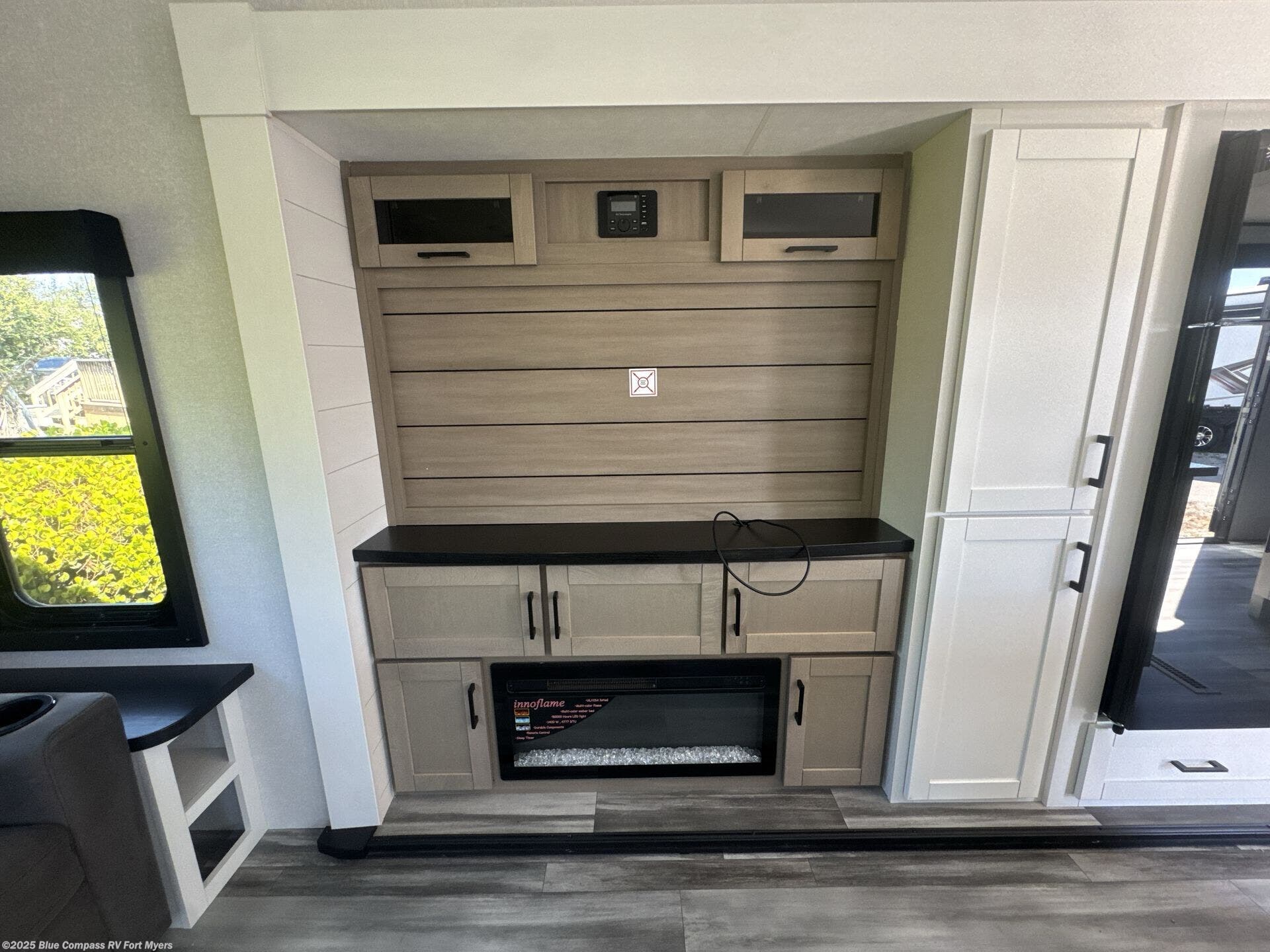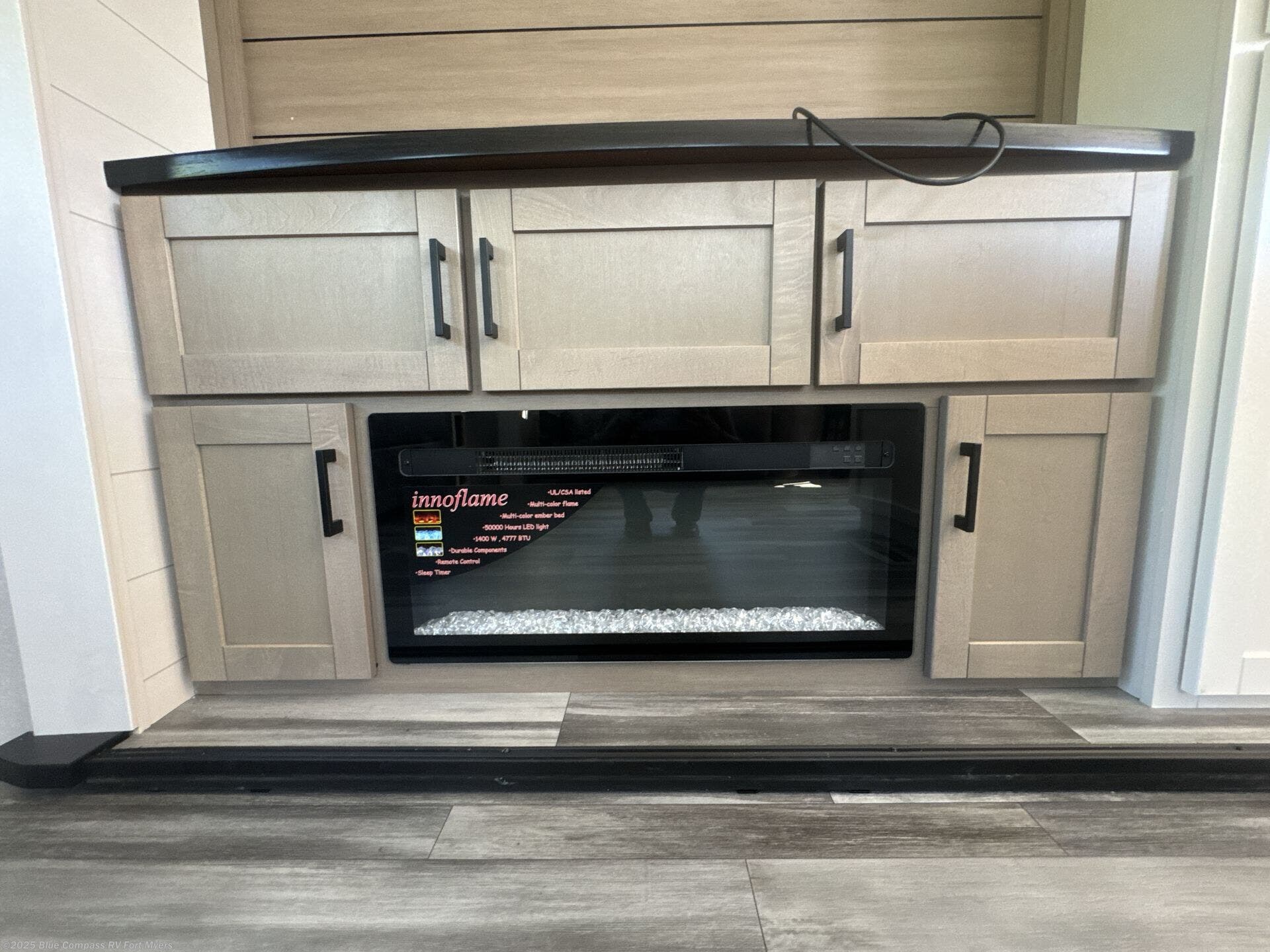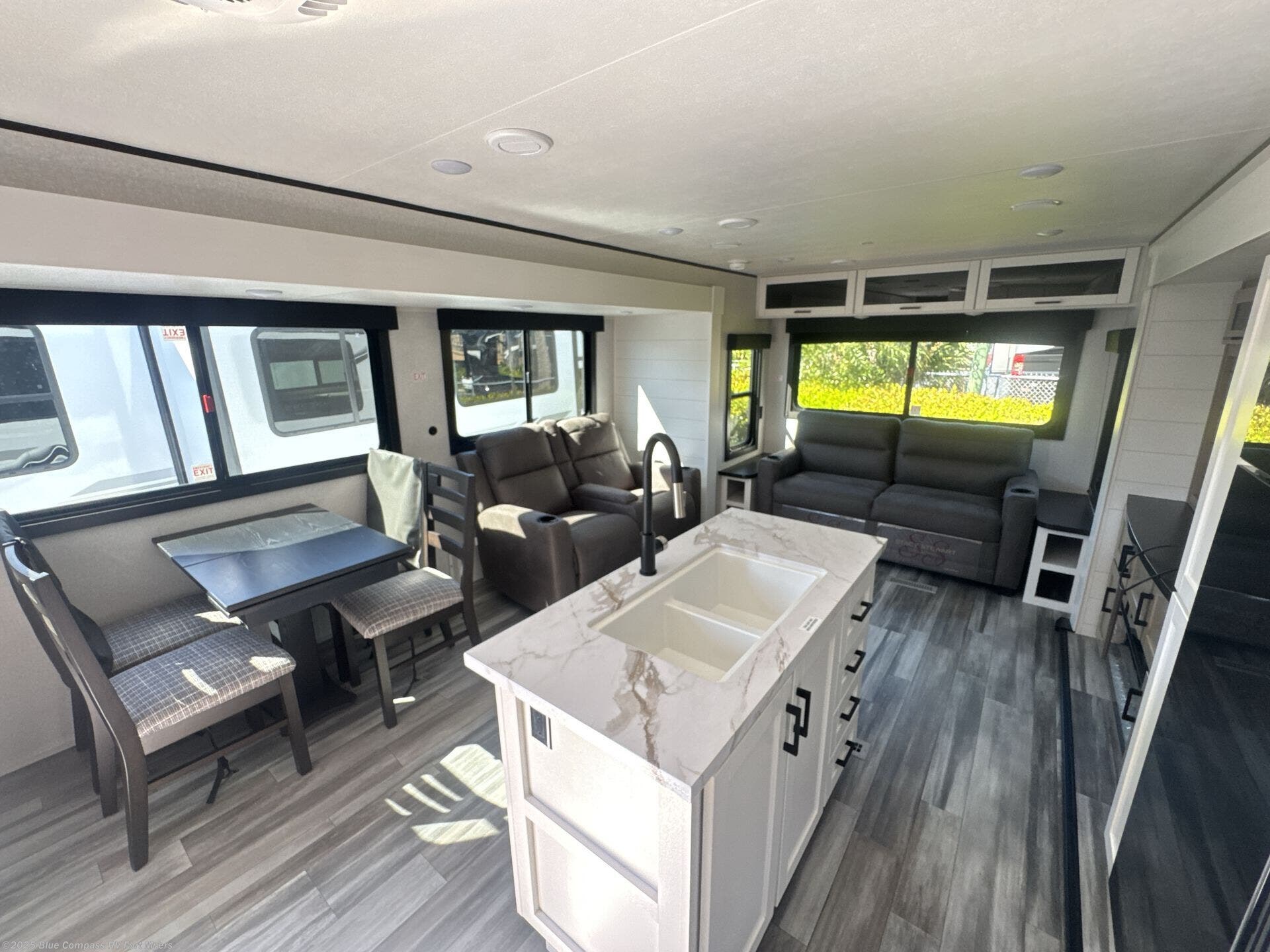 Enjoy a relaxing weekend getaway in this travel trailer! The dual entry bathroom with radius shower creates a front master suite with a queen bed slide, a dresser, and a front large wardrobe with storage space plus washer and dryer prep. The chef will have an easy time preparing their best home cooked meals with the kitchen island, hutch, three burner cooktop, and 12V refrigerator. Enjoy your meals at the booth dinette then play a card game or transform it into an extra sleeping space. The rear living area has a rear Jack-knife sofa for a quick afternoon nap and theater seating across from the entertainment center with a fireplace for the perfect spot on movie night!