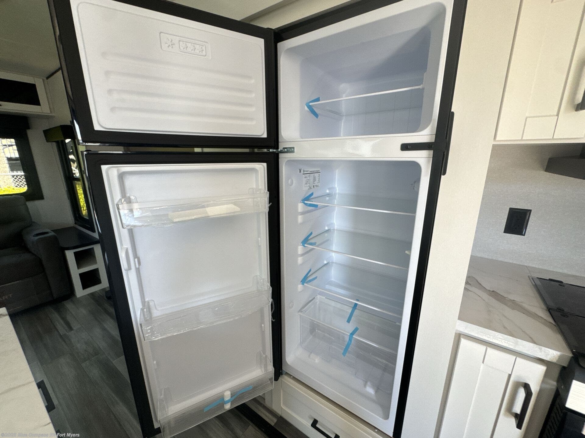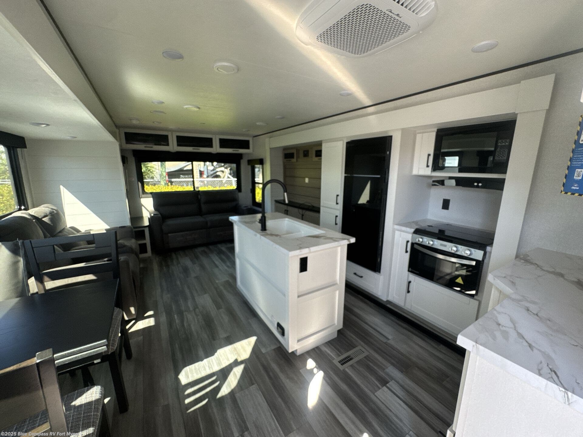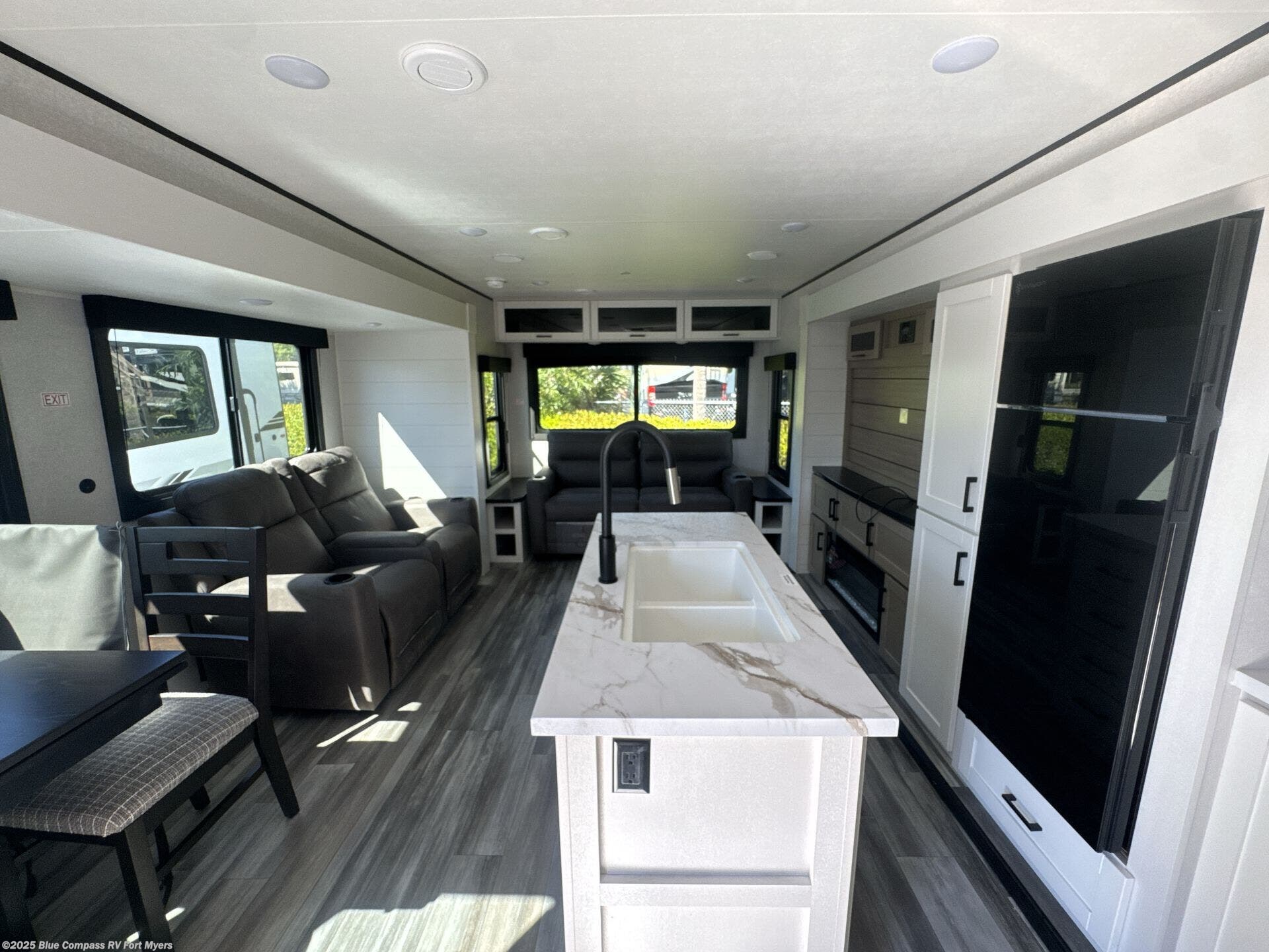Enjoy a relaxing weekend getaway in this travel trailer! The dual entry bathroom with radius shower creates a front master suite with a queen bed slide, a dresser, and a front large wardrobe with storage space plus washer and dryer prep. The chef will have an easy time preparing their best home cooked meals with the kitchen island, hutch, three burner cooktop, and 12V refrigerator. Enjoy your meals at the booth dinette then play a card game or transform it into an extra sleeping space. The rear living area has a rear Jack-knife sofa for a quick afternoon nap and theater seating across from the entertainment center with a fireplace for the perfect spot on movie night!