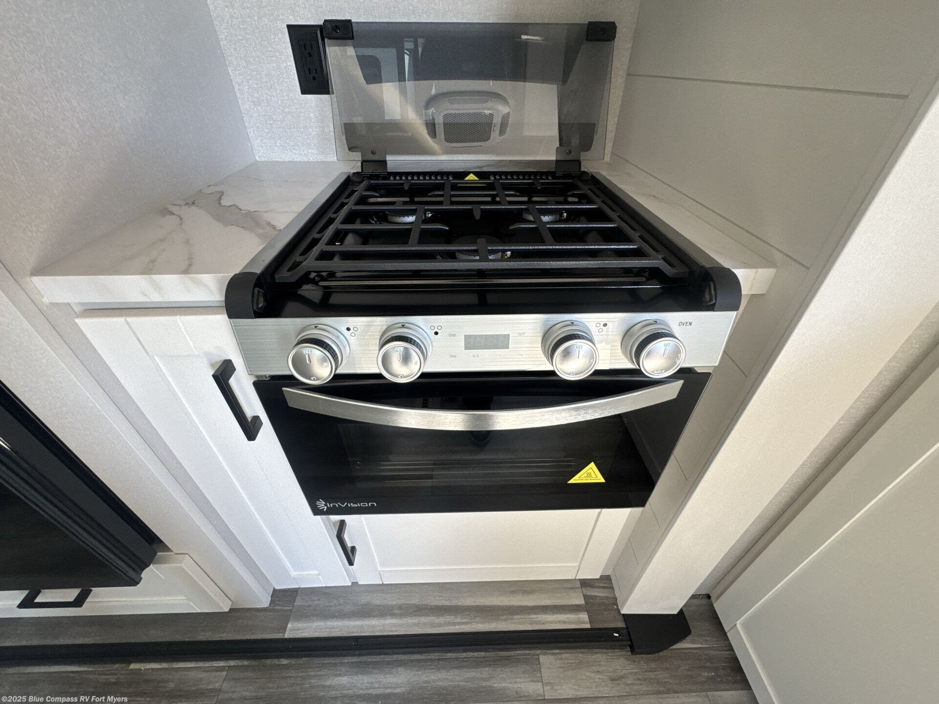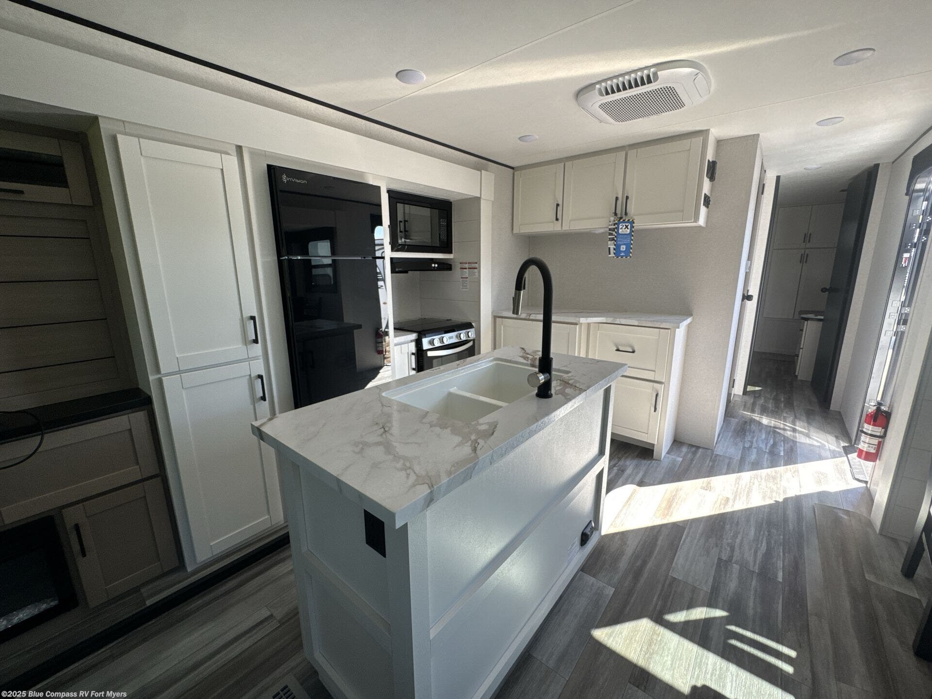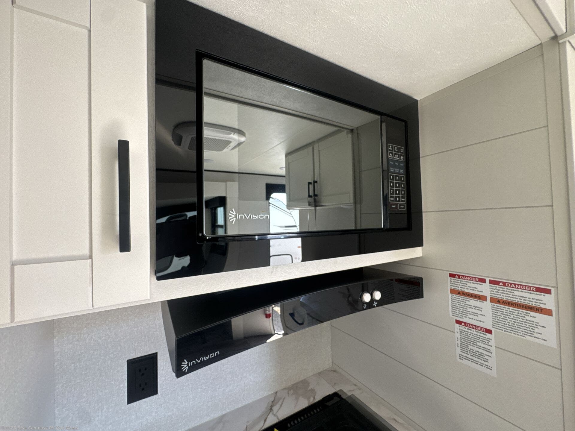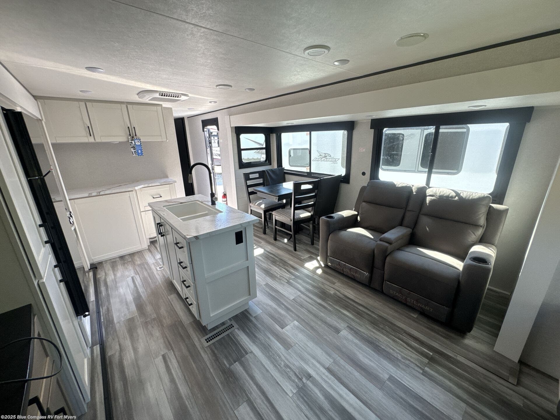 Enjoy a relaxing weekend getaway in this travel trailer! The dual entry bathroom with radius shower creates a front master suite with a queen bed slide, a dresser, and a front large wardrobe with storage space plus washer and dryer prep. The chef will have an easy time preparing their best home cooked meals with the kitchen island, hutch, three burner cooktop, and 12V refrigerator. Enjoy your meals at the booth dinette then play a card game or transform it into an extra sleeping space. The rear living area has a rear Jack-knife sofa for a quick afternoon nap and theater seating across from the entertainment center with a fireplace for the perfect spot on movie night!