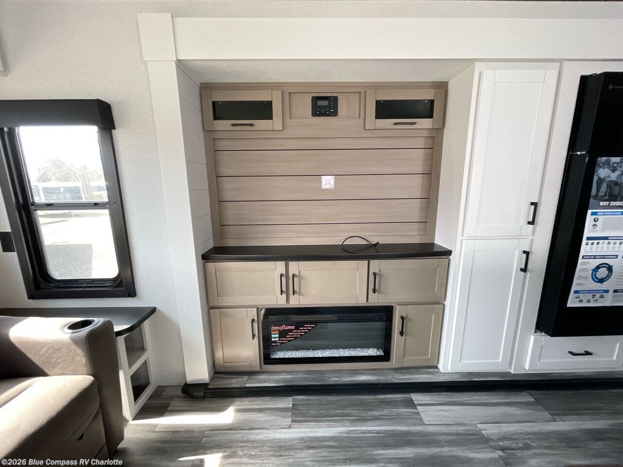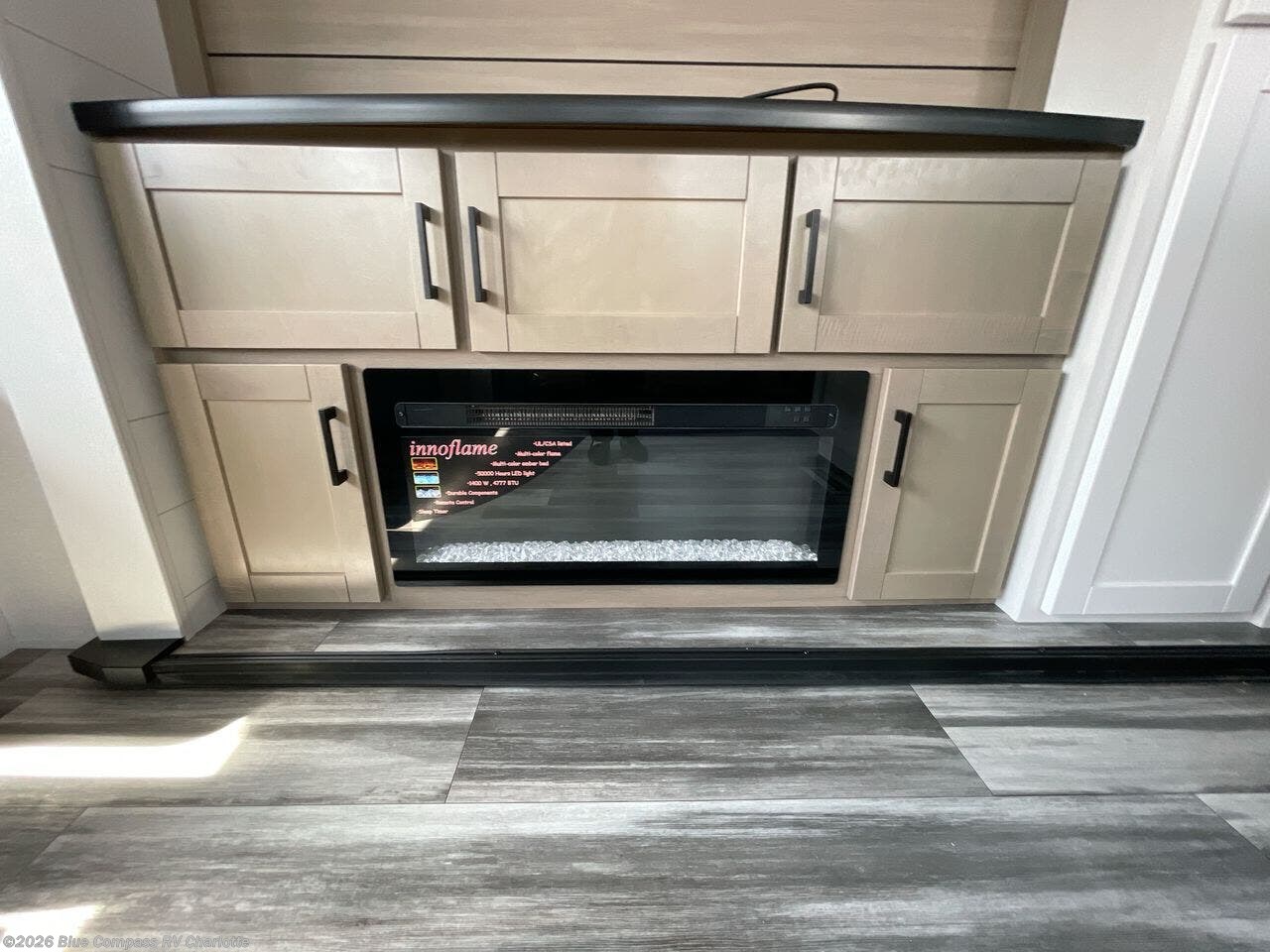 Enjoy a relaxing weekend getaway in this travel trailer! The dual entry bathroom with radius shower creates a front master suite with a queen bed slide, a dresser, and a front large wardrobe with storage space plus washer and dryer prep. The chef will have an easy time preparing their best home cooked meals with the kitchen island, hutch, three burner cooktop, and 12V refrigerator. Enjoy your meals at the booth dinette then play a card game or transform it into an extra sleeping space. The rear living area has a rear Jack-knife sofa for a quick afternoon nap and theater seating across from the entertainment center with a fireplace for the perfect spot on movie night!
