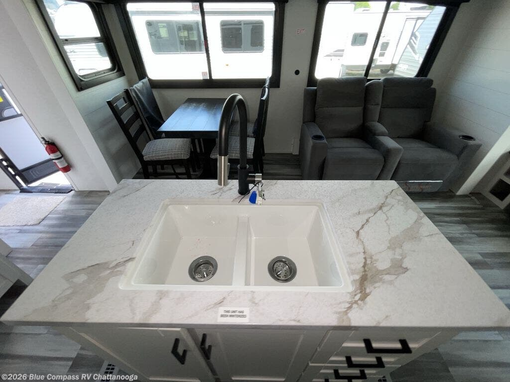 Enjoy a relaxing weekend getaway in this travel trailer! The dual entry bathroom with radius shower creates a front master suite with a queen bed slide, a dresser, and a front large wardrobe with storage space plus washer and dryer prep. The chef will have an easy time preparing their best home cooked meals with the kitchen island, hutch, three burner cooktop, and 12V refrigerator. Enjoy your meals at the booth dinette then play a card game or transform it into an extra sleeping space. The rear living area has a rear Jack-knife sofa for a quick afternoon nap and theater seating across from the entertainment center with a fireplace for the perfect spot on movie night!