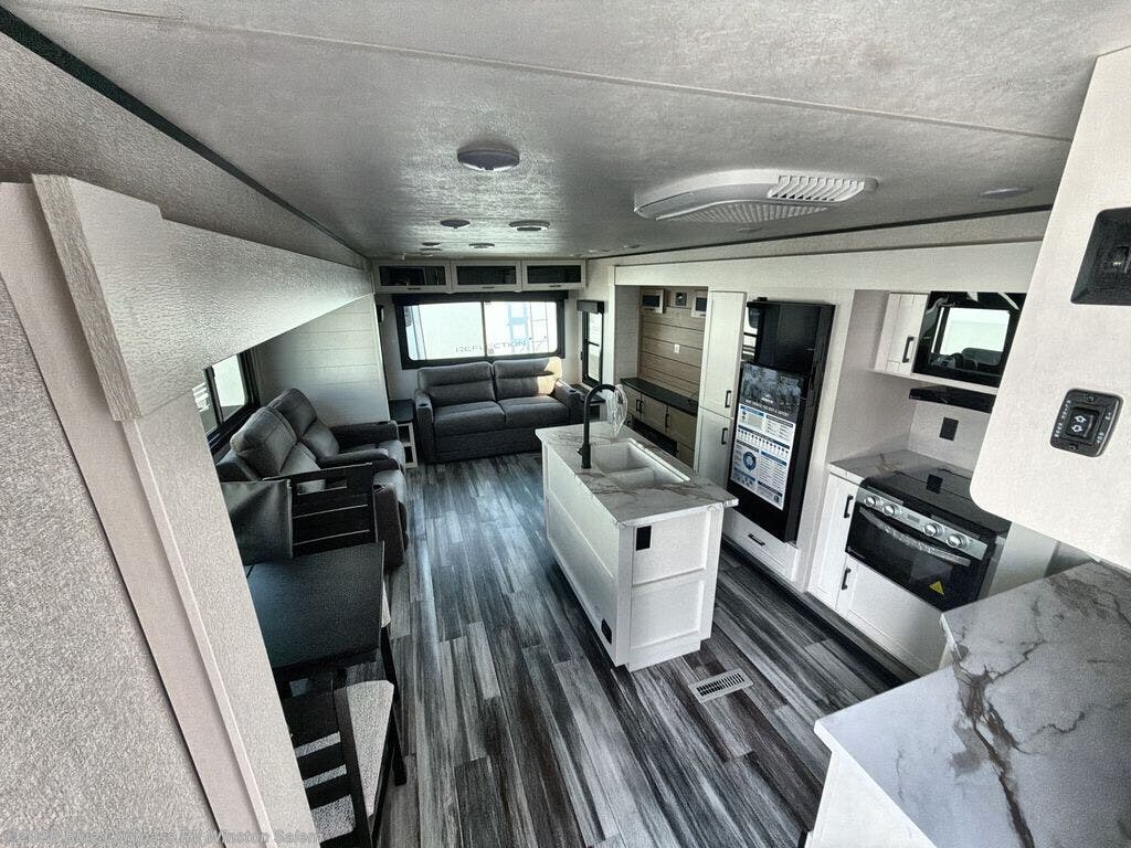 Enjoy a relaxing weekend getaway in this travel trailer! The dual entry bathroom with radius shower creates a front master suite with a queen bed slide, a dresser, and a front large wardrobe with storage space plus washer and dryer prep. The chef will have an easy time preparing their best home cooked meals with the kitchen island, hutch, three burner cooktop, and 12V refrigerator. Enjoy your meals at the booth dinette then play a card game or transform it into an extra sleeping space. The rear living area has a rear Jack-knife sofa for a quick afternoon nap and theater seating across from the entertainment center with a fireplace for the perfect spot on movie night!