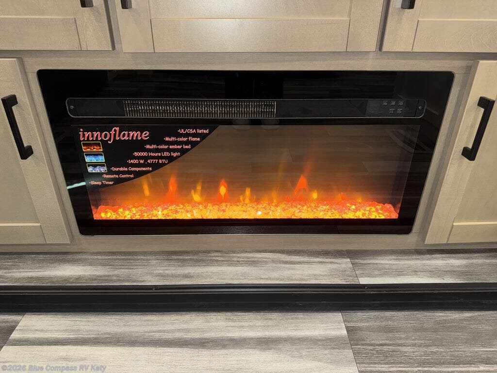 Enjoy a relaxing weekend getaway in this travel trailer! The dual entry bathroom with radius shower creates a front master suite with a queen bed slide, a dresser, and a front large wardrobe with storage space plus washer and dryer prep. The chef will have an easy time preparing their best home cooked meals with the kitchen island, hutch, three burner cooktop, and 12V refrigerator. Enjoy your meals at the booth dinette then play a card game or transform it into an extra sleeping space. The rear living area has a rear Jack-knife sofa for a quick afternoon nap and theater seating across from the entertainment center with a fireplace for the perfect spot on movie night!