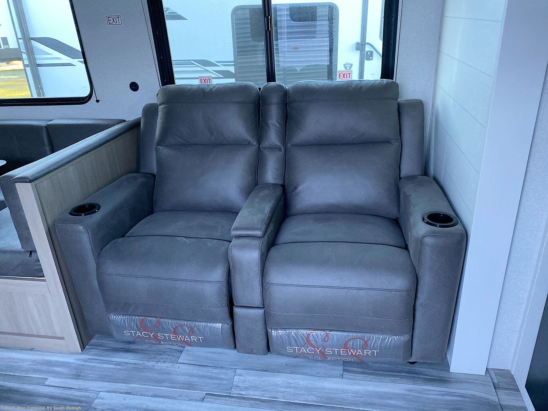 With two private bedrooms, everyone will have a comfortable place to sleep in this travel trailer! The front private bedroom has a 60" x 75" queen bed with wardrobes on either side and the rear private bedroom has a 60" x 80" queen bed slide with a dresser, a wardrobe, one of the exit/entrance doors, and an entrance into the walk-through bathroom which has a radius shower for everyone to stay squeaky clean. The patio doors not only make it easy to enter and exit the unit, but also bring in tons of natural lighting. After you have prepared a delicious home cooked meal, you can can head to the U-shaped dinette to enjoy it there comfortably then relax on the Jack-knife sofa across from the entertainment center!
