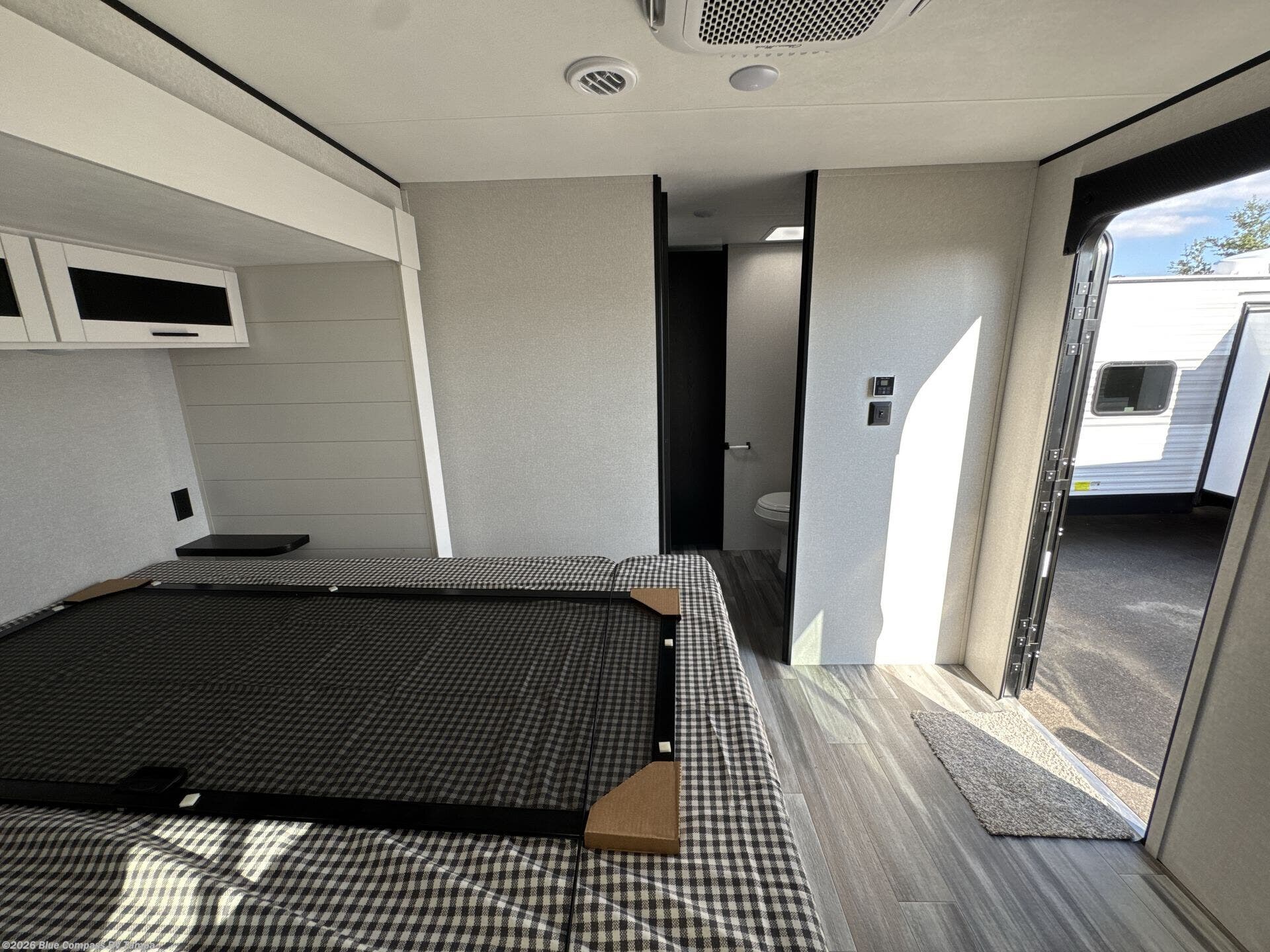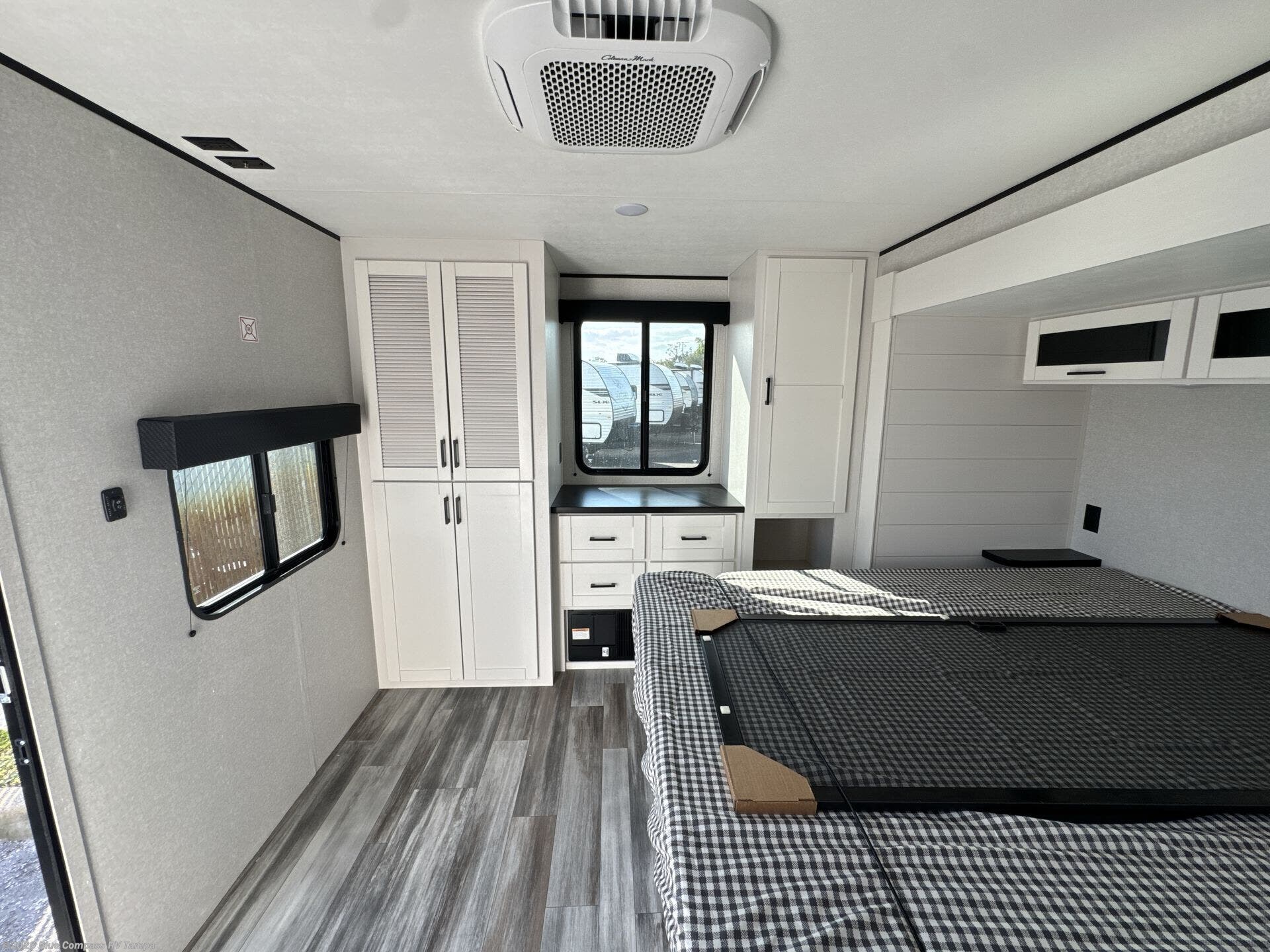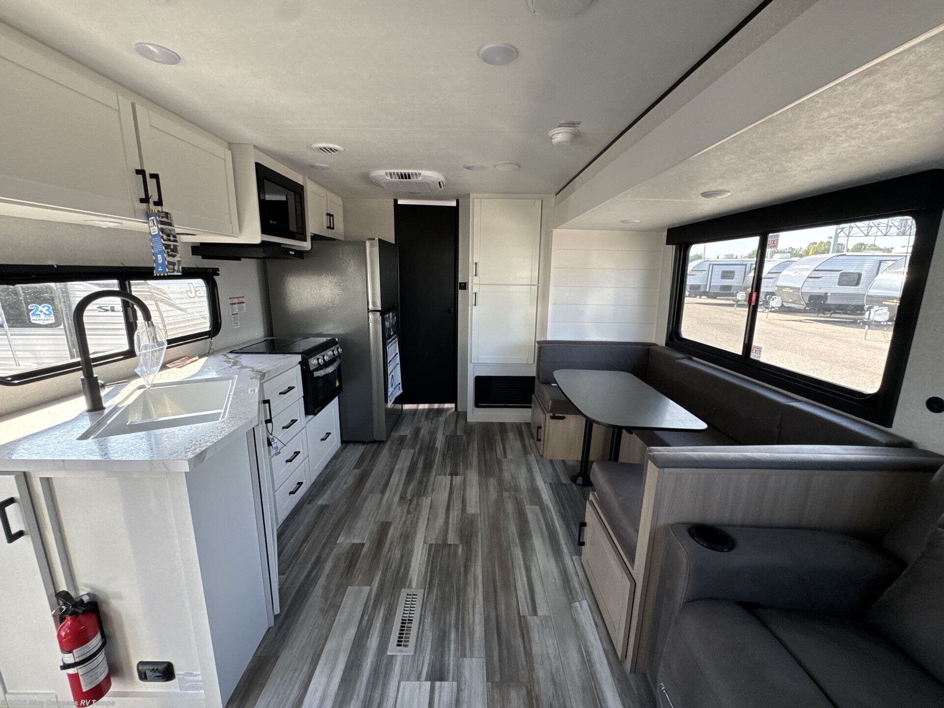 With two private bedrooms, everyone will have a comfortable place to sleep in this travel trailer! The front private bedroom has a 60" x 75" queen bed with wardrobes on either side and the rear private bedroom has a 60" x 80" queen bed slide with a dresser, a wardrobe, one of the exit/entrance doors, and an entrance into the walk-through bathroom which has a radius shower for everyone to stay squeaky clean. The patio doors not only make it easy to enter and exit the unit, but also bring in tons of natural lighting. After you have prepared a delicious home cooked meal, you can can head to the U-shaped dinette to enjoy it there comfortably then relax on the Jack-knife sofa across from the entertainment center!