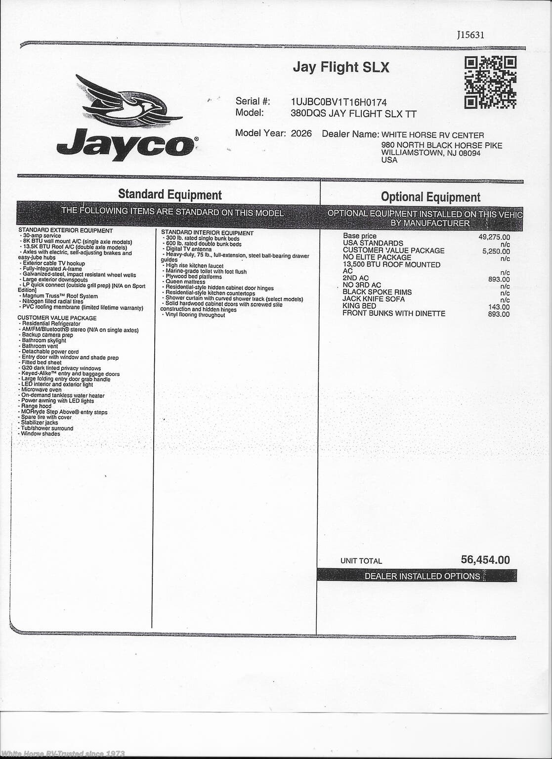 This Stock #J15631 also has the following factory options included: ...Interior Decor Country Linen, 2nd AC, King Bed, & Front Bunks with Dinette all backed by Jayco’s 2+3-year warranty! MSRP $56,454.00.
