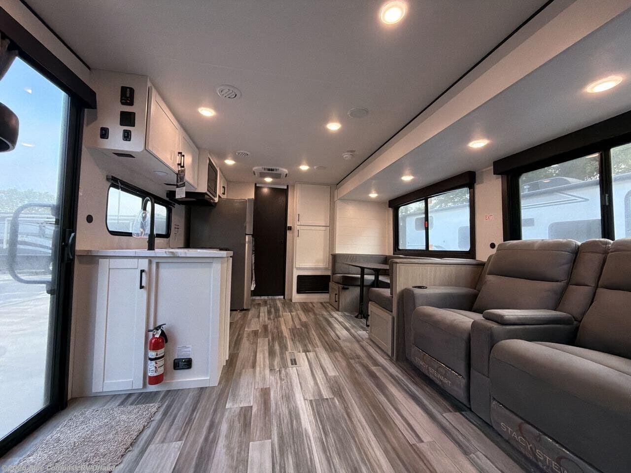 With two private bedrooms, everyone will have a comfortable place to sleep in this travel trailer! The front private bedroom has a 60" x 75" queen bed with wardrobes on either side and the rear private bedroom has a 60" x 80" queen bed slide with a dresser, a wardrobe, one of the exit/entrance doors, and an entrance into the walk-through bathroom which has a radius shower for everyone to stay squeaky clean. The patio doors not only make it easy to enter and exit the unit, but also bring in tons of natural lighting. After you have prepared a delicious home cooked meal, you can can head to the U-shaped dinette to enjoy it there comfortably then relax on the Jack-knife sofa across from the entertainment center!