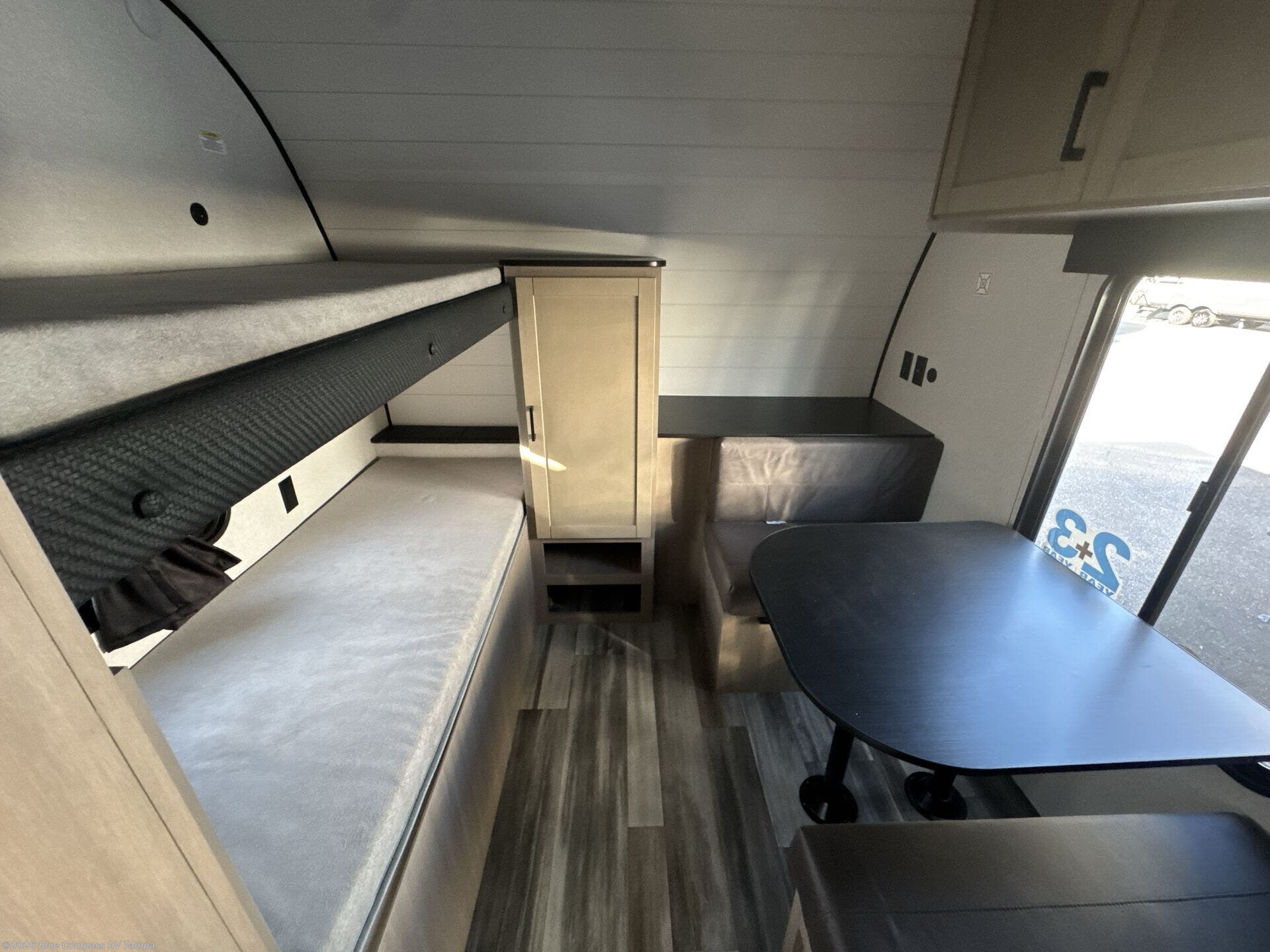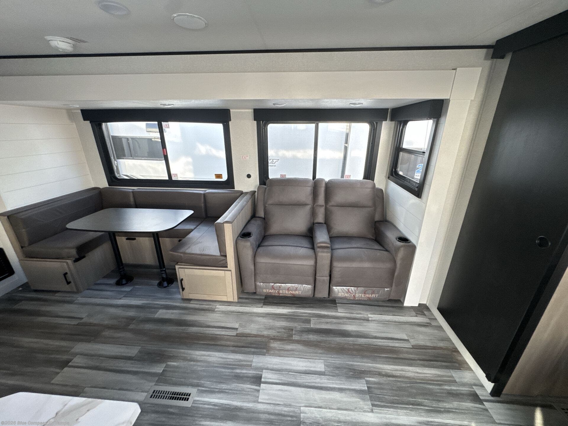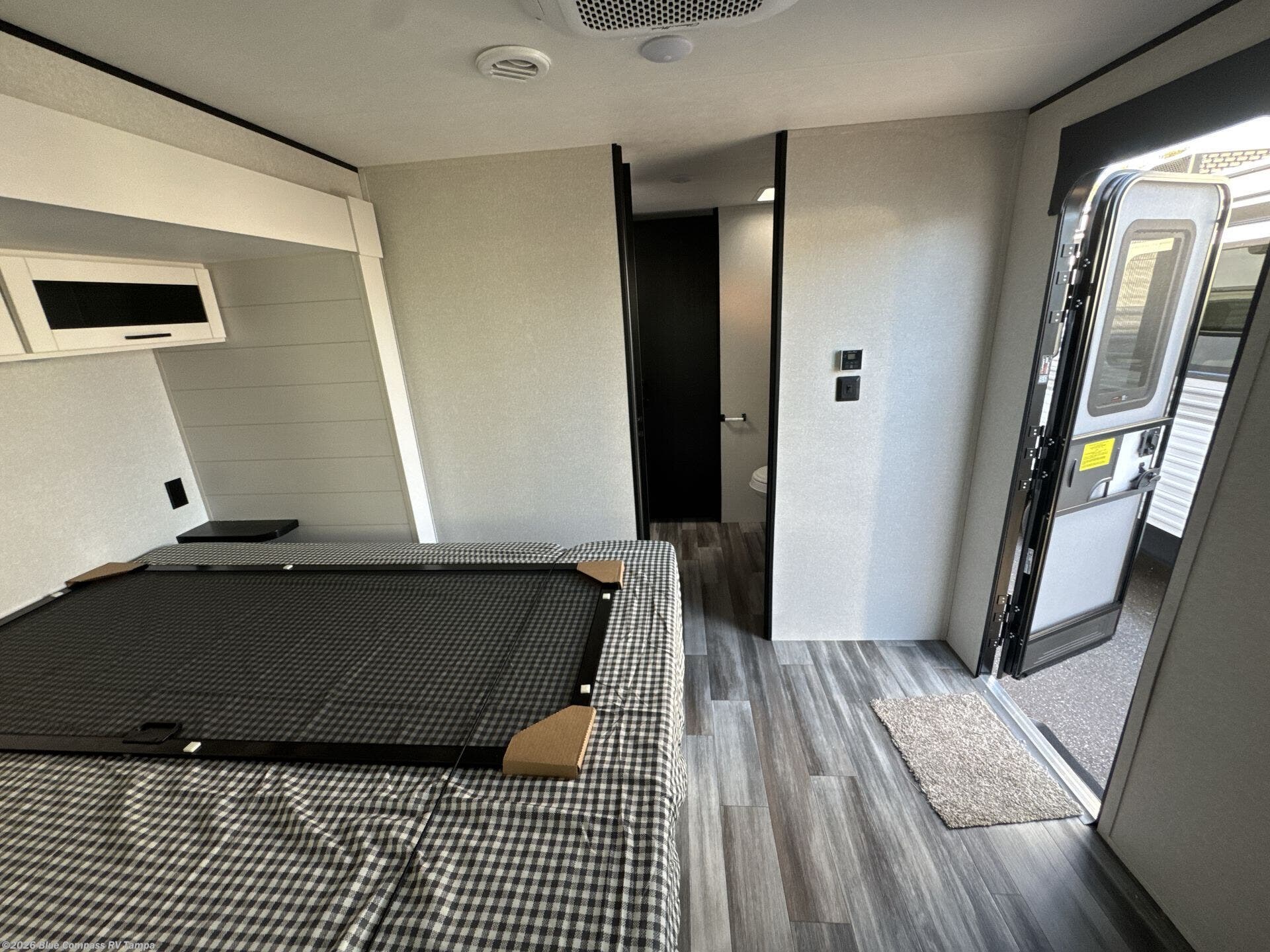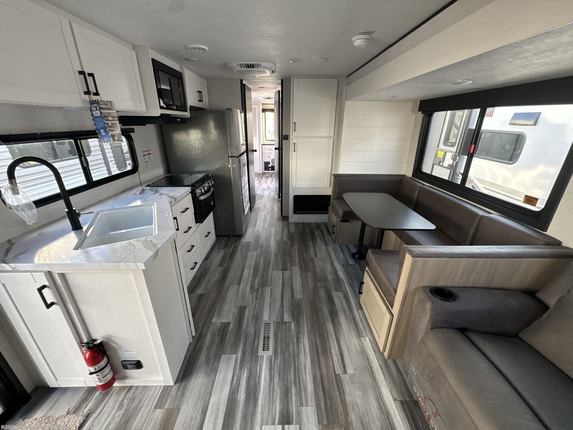 With two private bedrooms, everyone will have a comfortable place to sleep in this travel trailer! The front private bedroom has a 60" x 75" queen bed with wardrobes on either side and the rear private bedroom has a 60" x 80" queen bed slide with a dresser, a wardrobe, one of the exit/entrance doors, and an entrance into the walk-through bathroom which has a radius shower for everyone to stay squeaky clean. The patio doors not only make it easy to enter and exit the unit, but also bring in tons of natural lighting. After you have prepared a delicious home cooked meal, you can can head to the U-shaped dinette to enjoy it there comfortably then relax on the Jack-knife sofa across from the entertainment center!