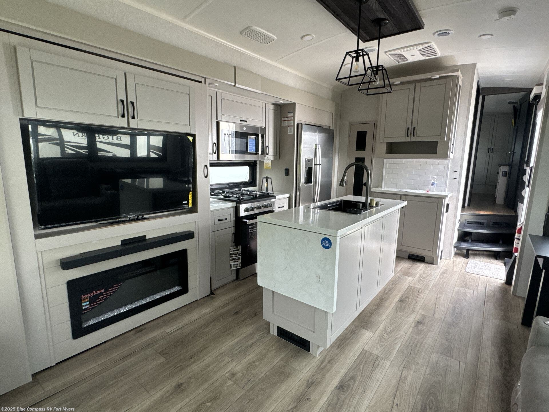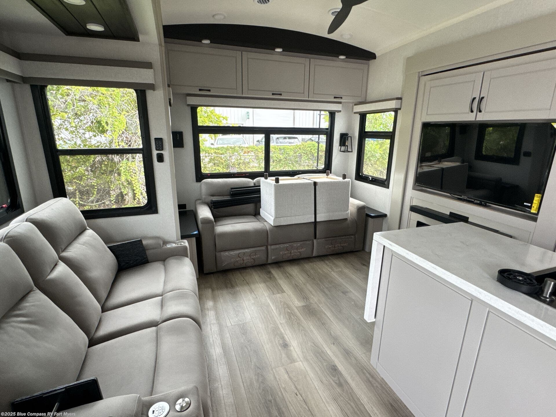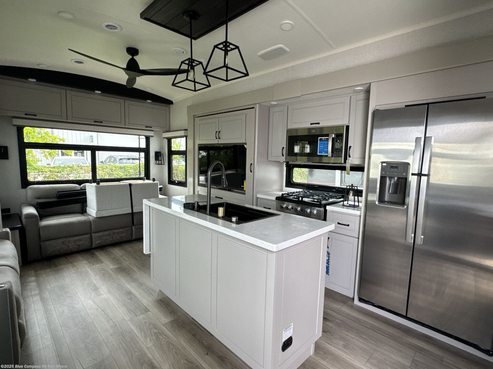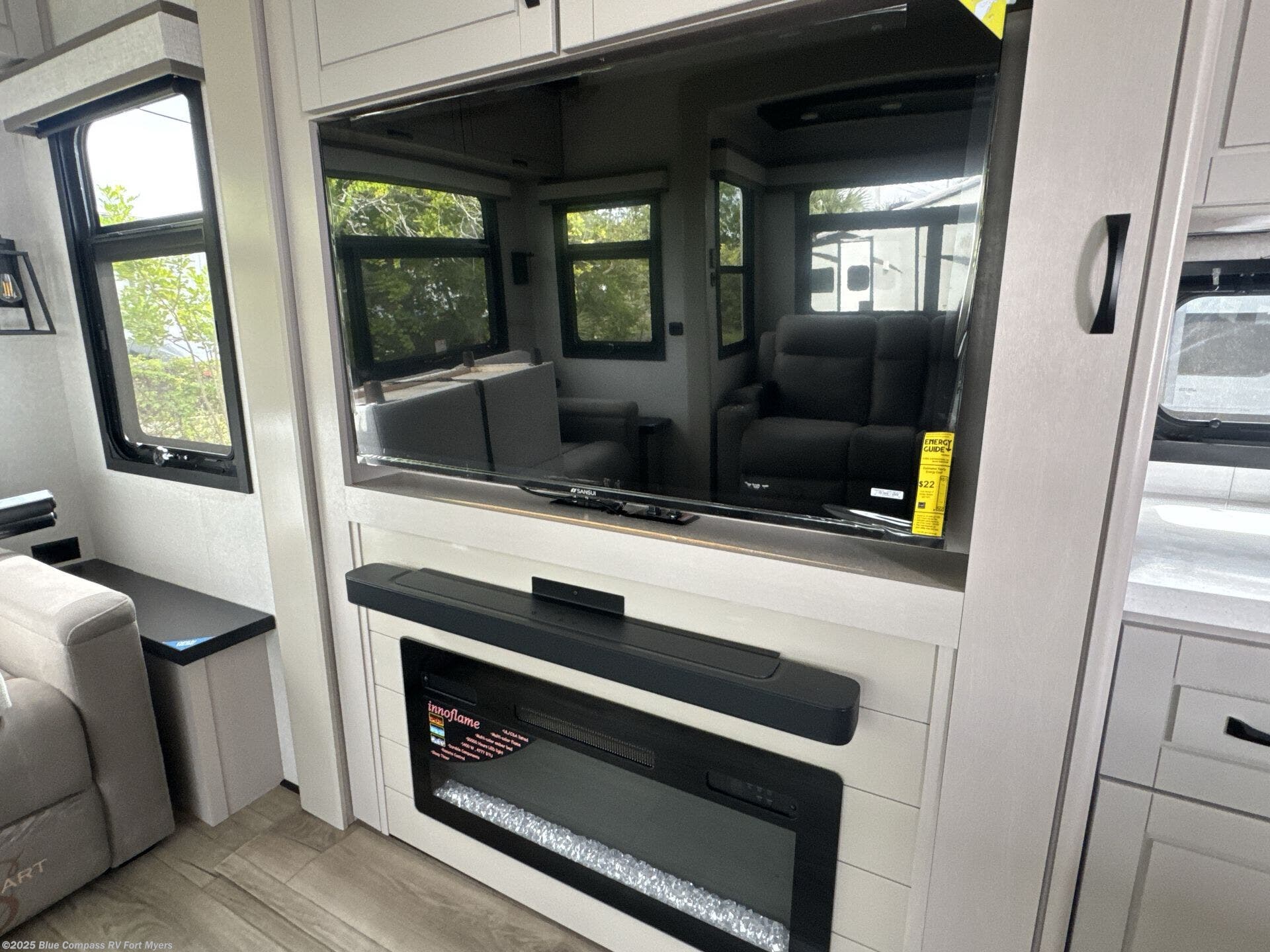 Whether you want to live in this fifth wheel or travel for long periods at a time, you will enjoy the spacious main living and kitchen area with dual slide outs as well as the bedroom with a slide out king bed. You will also find a walk-in closet with hamper and prepped space for a washer/dryer option, and a flip-top dresser with 32" TV. Easily get cleaned up in the full bathroom which also has linen storage. The cook will have a residential refrigerator to store all the cold items and beverages, a kitchen island, a pantry and a residential 24" stove. The 50" Smart LED HDTV with fully digital HDMI output and home entertainment system with subwoofer and fireplace below will provide a cozy place to watch your shows while relaxing on the theater seats, the tri-fold sofa, or the roll-top dinette table.