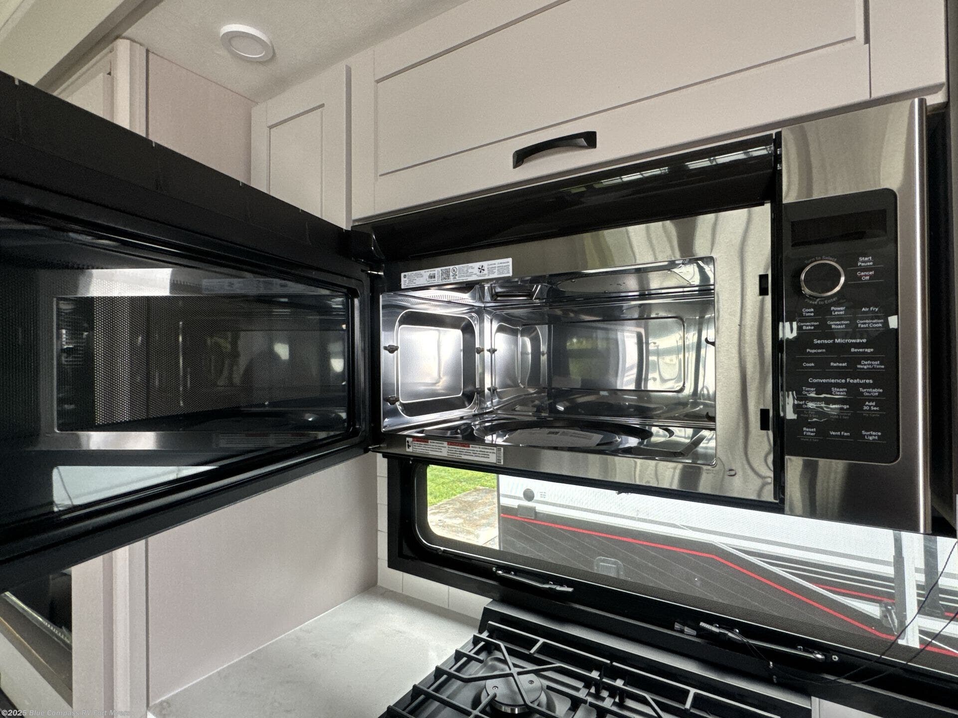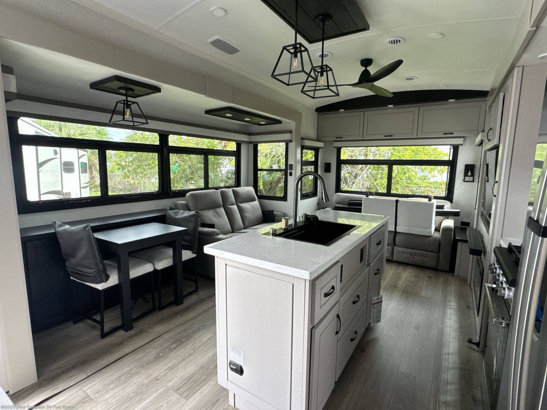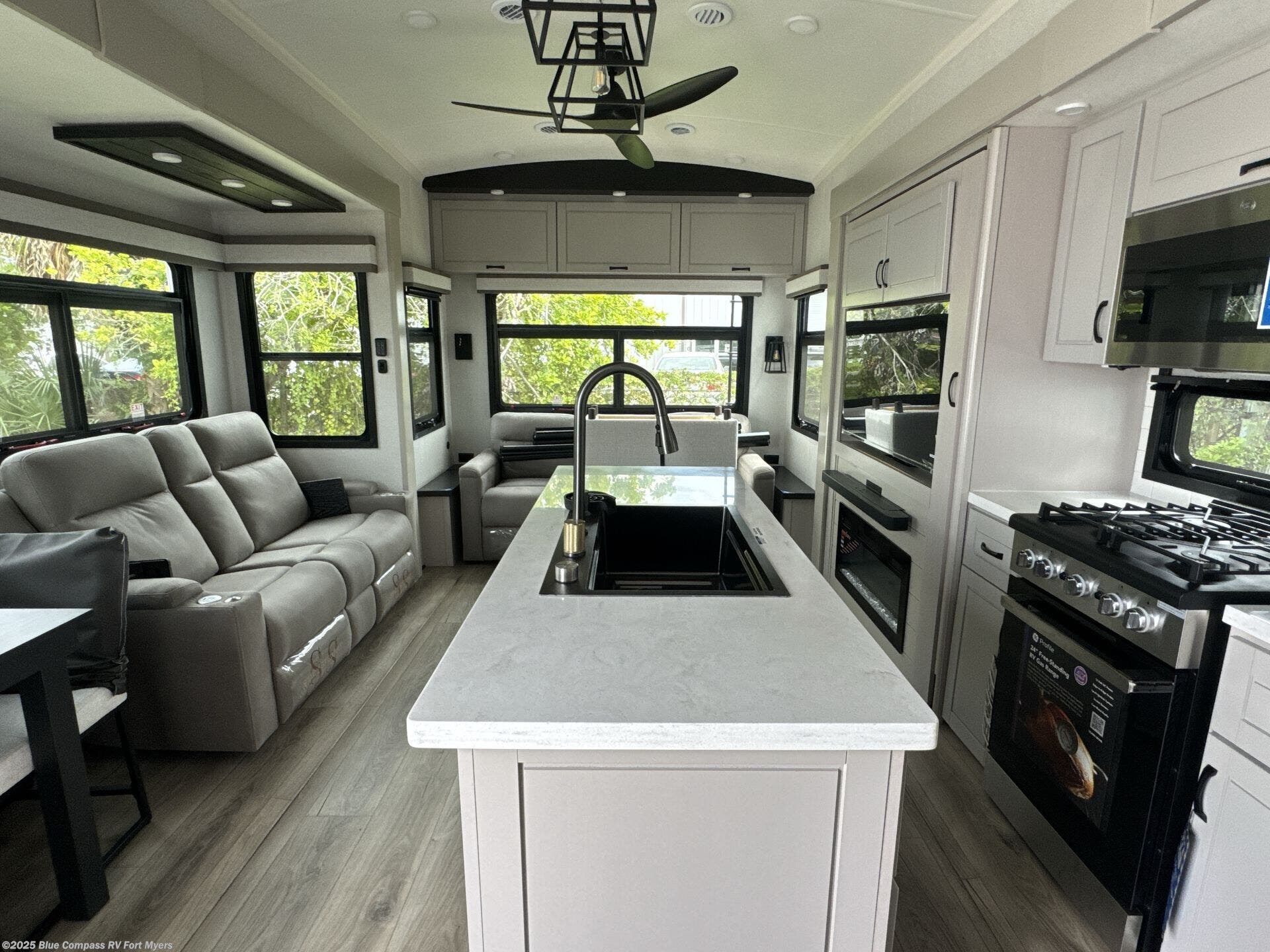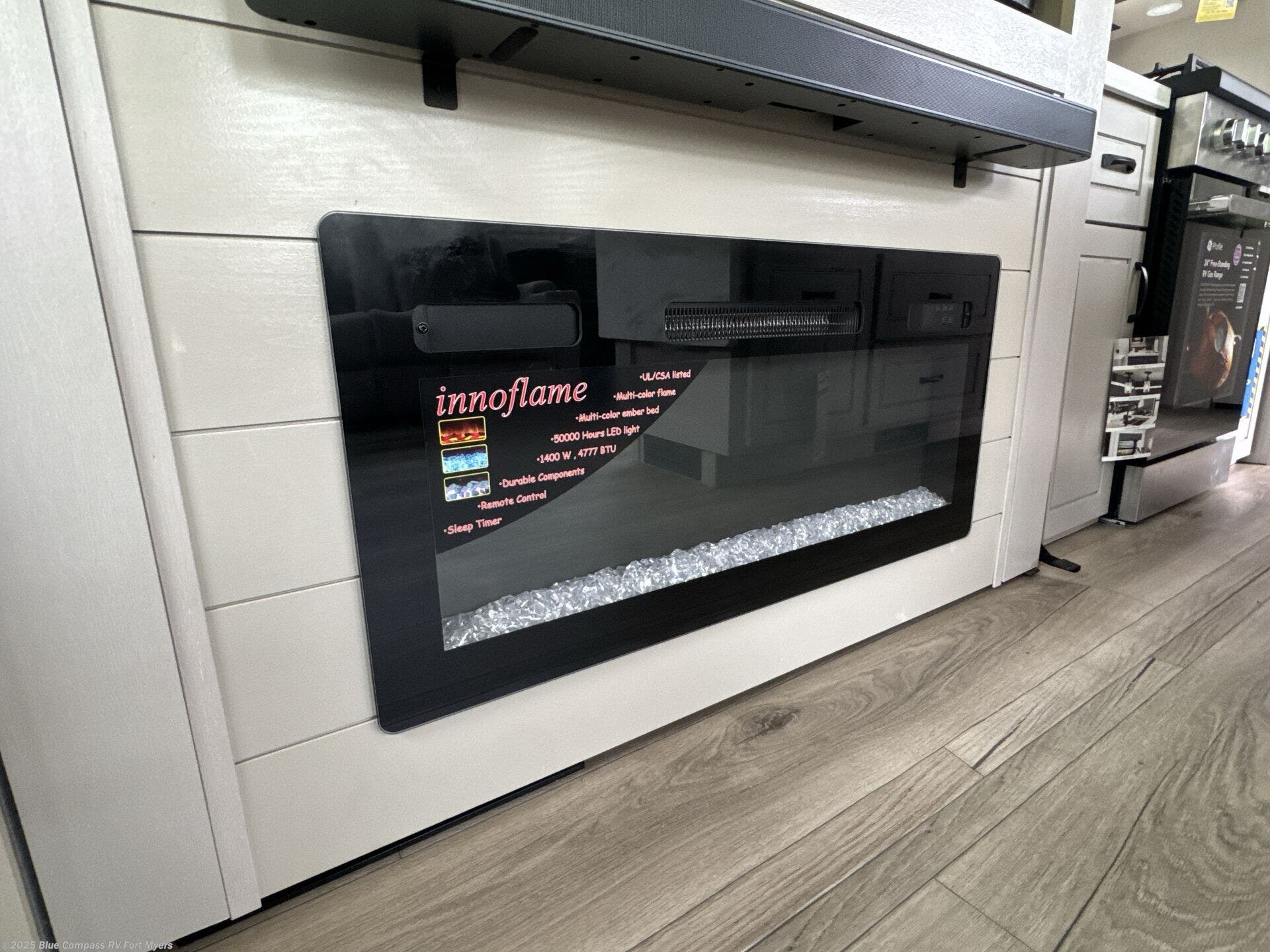 Whether you want to live in this fifth wheel or travel for long periods at a time, you will enjoy the spacious main living and kitchen area with dual slide outs as well as the bedroom with a slide out king bed. You will also find a walk-in closet with hamper and prepped space for a washer/dryer option, and a flip-top dresser with 32" TV. Easily get cleaned up in the full bathroom which also has linen storage. The cook will have a residential refrigerator to store all the cold items and beverages, a kitchen island, a pantry and a residential 24" stove. The 50" Smart LED HDTV with fully digital HDMI output and home entertainment system with subwoofer and fireplace below will provide a cozy place to watch your shows while relaxing on the theater seats, the tri-fold sofa, or the roll-top dinette table.