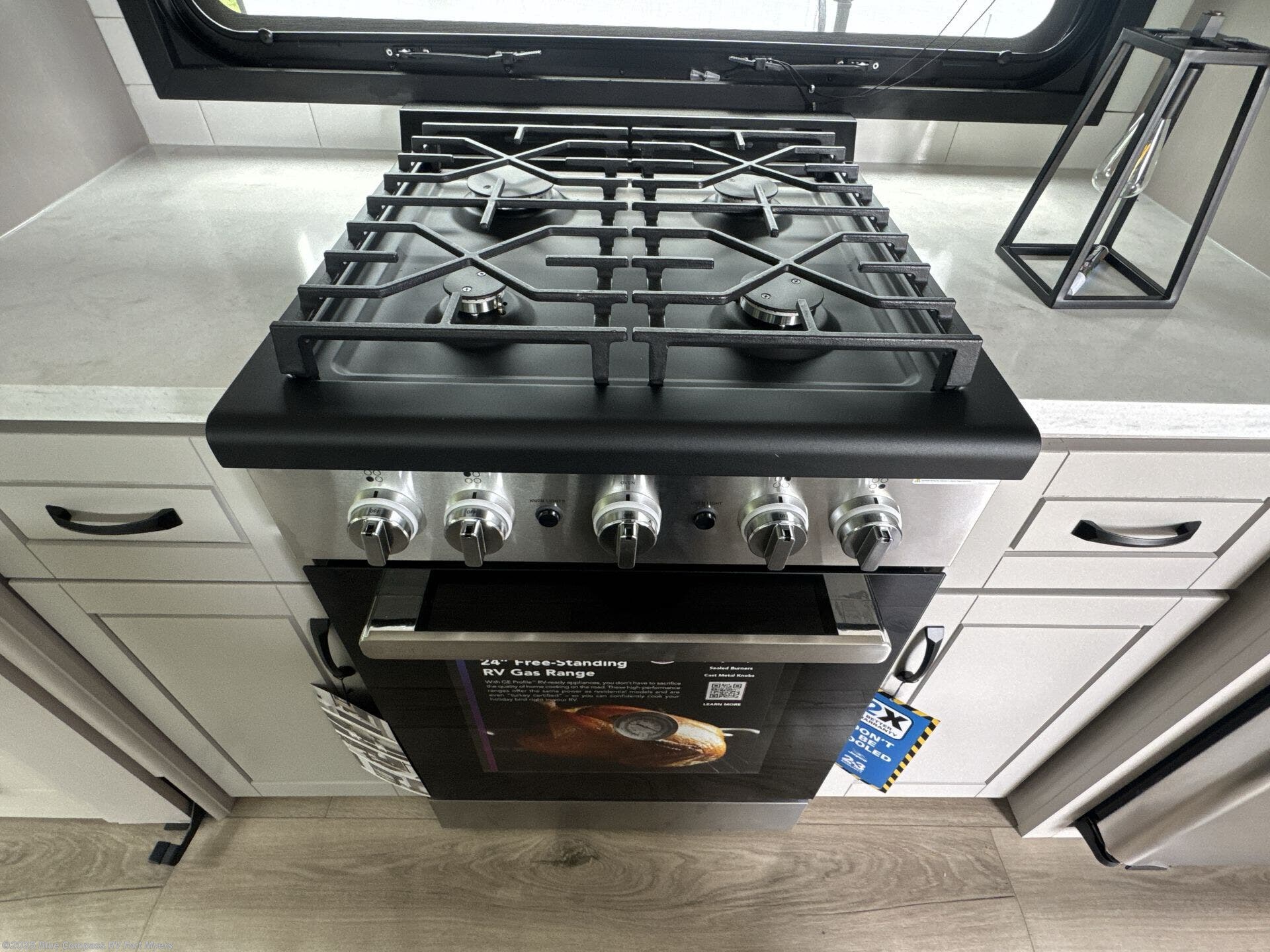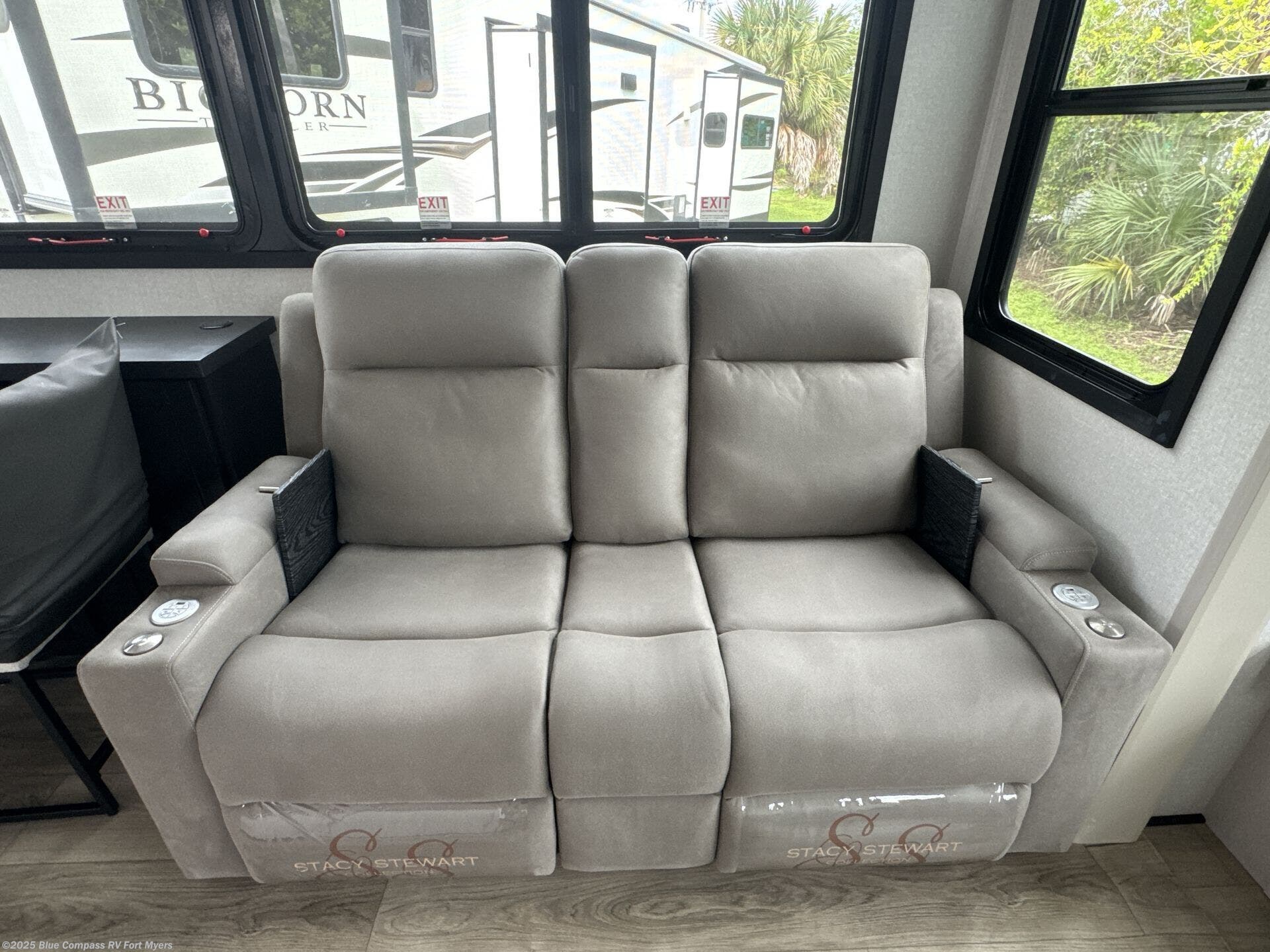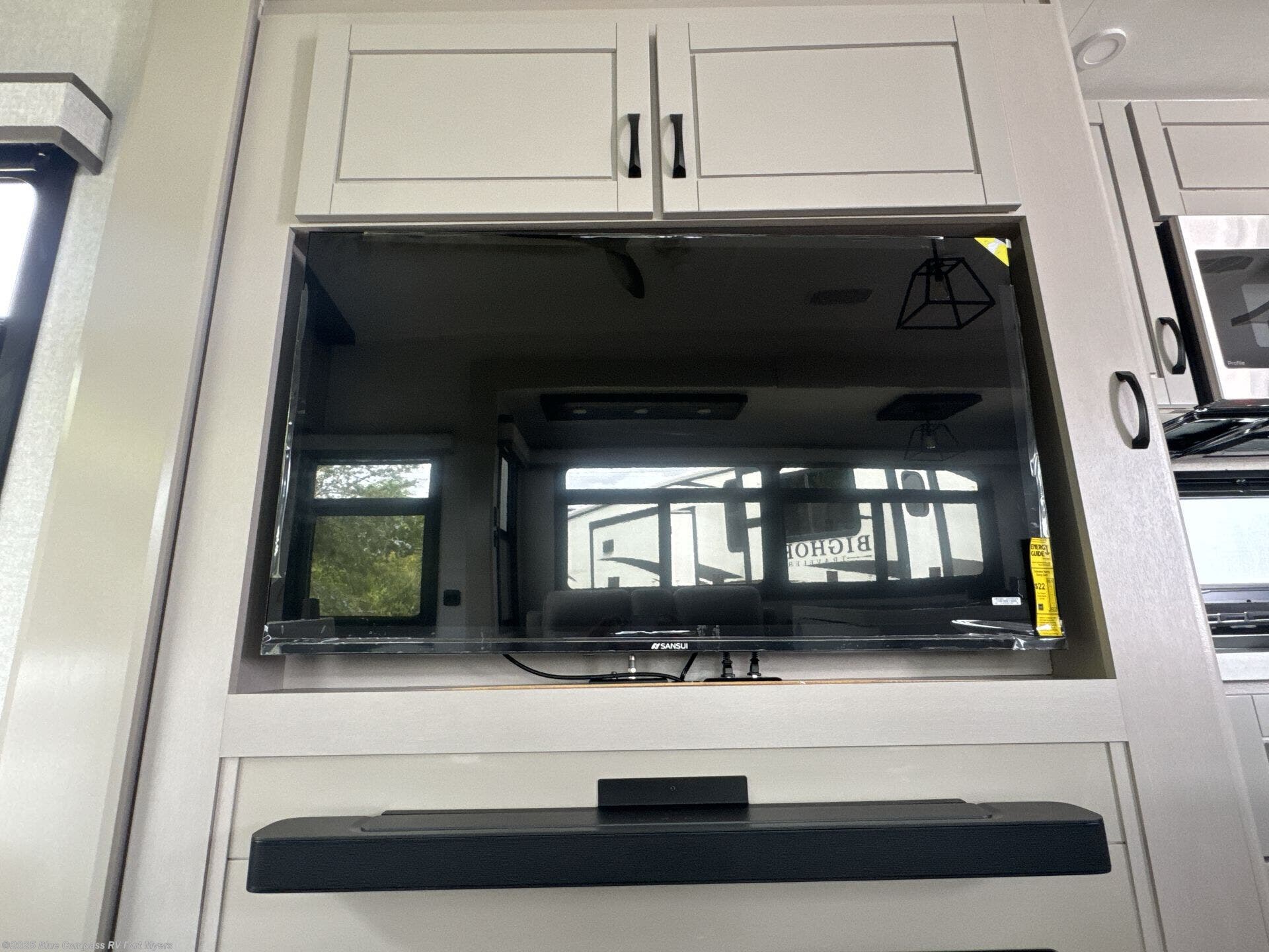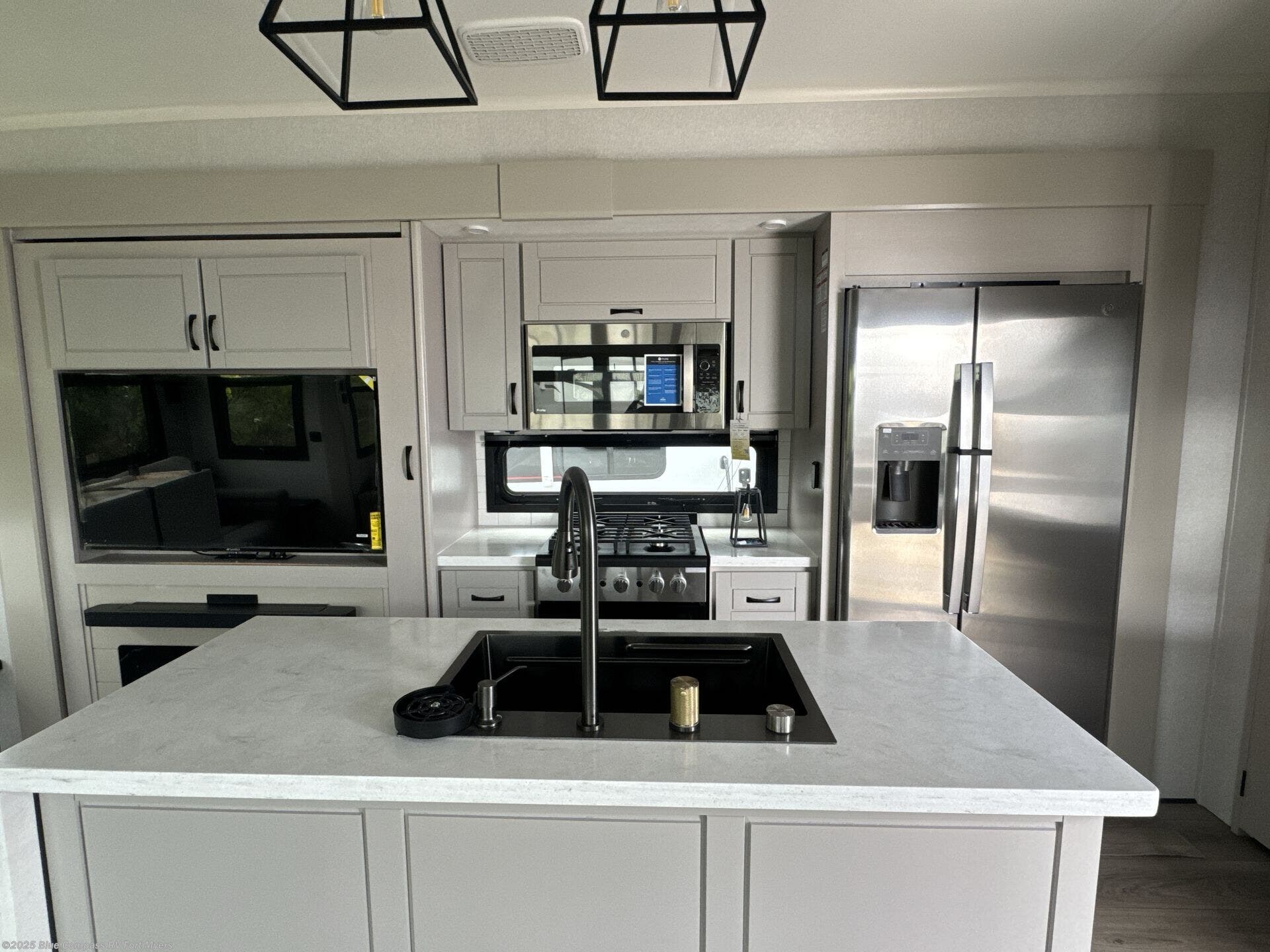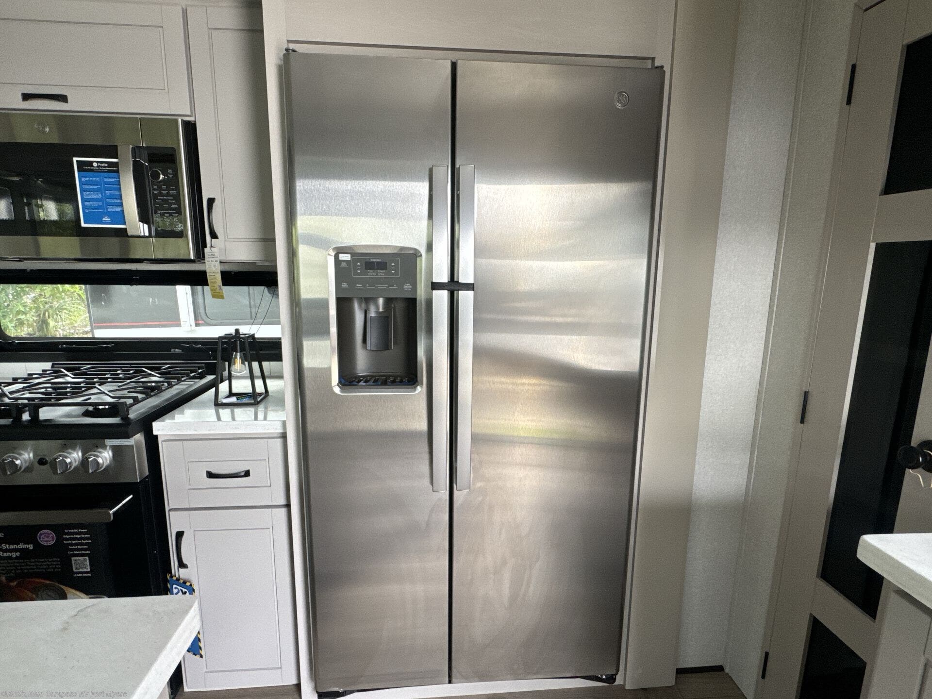 Whether you want to live in this fifth wheel or travel for long periods at a time, you will enjoy the spacious main living and kitchen area with dual slide outs as well as the bedroom with a slide out king bed. You will also find a walk-in closet with hamper and prepped space for a washer/dryer option, and a flip-top dresser with 32" TV. Easily get cleaned up in the full bathroom which also has linen storage. The cook will have a residential refrigerator to store all the cold items and beverages, a kitchen island, a pantry and a residential 24" stove. The 50" Smart LED HDTV with fully digital HDMI output and home entertainment system with subwoofer and fireplace below will provide a cozy place to watch your shows while relaxing on the theater seats, the tri-fold sofa, or the roll-top dinette table.
