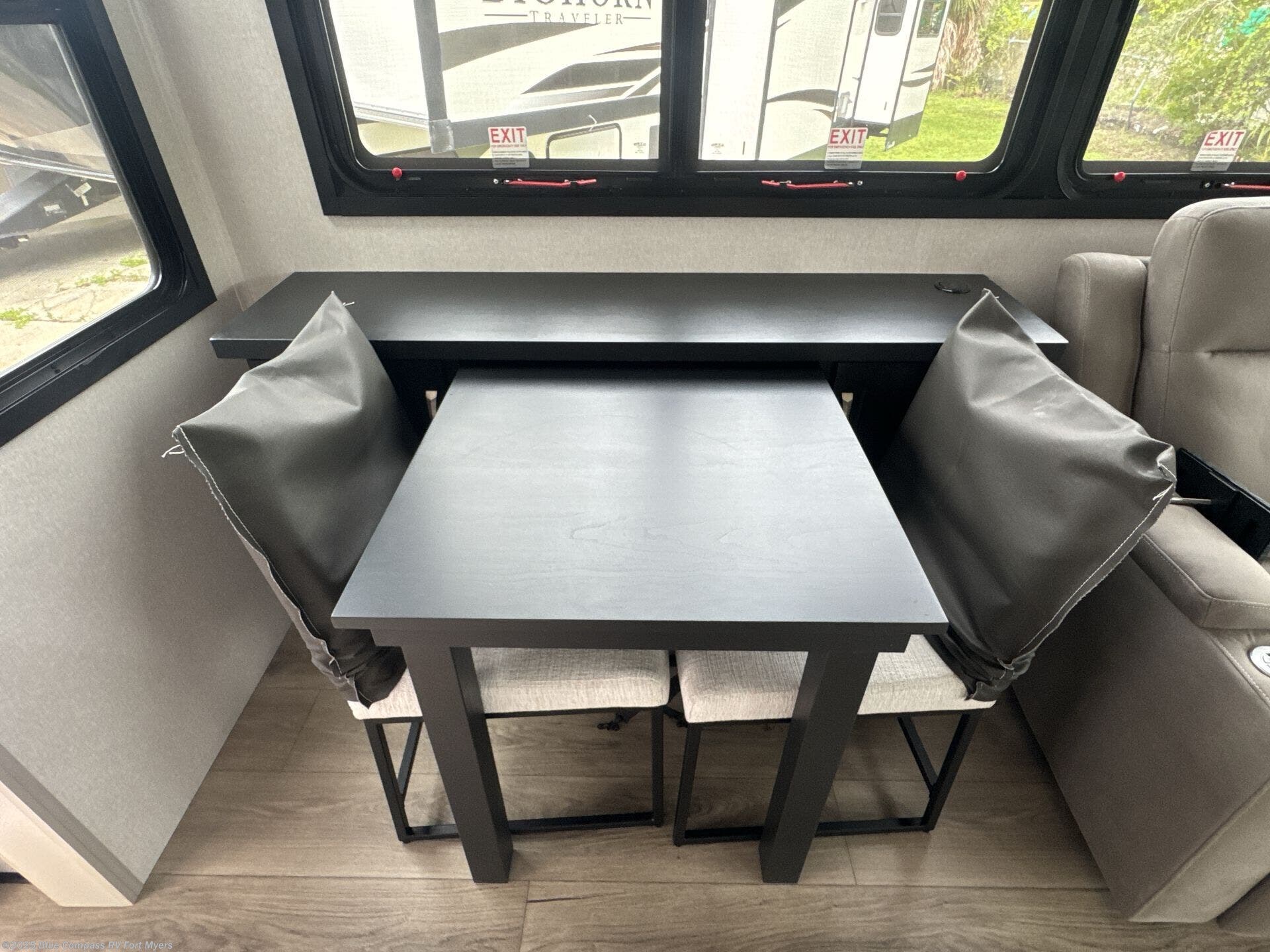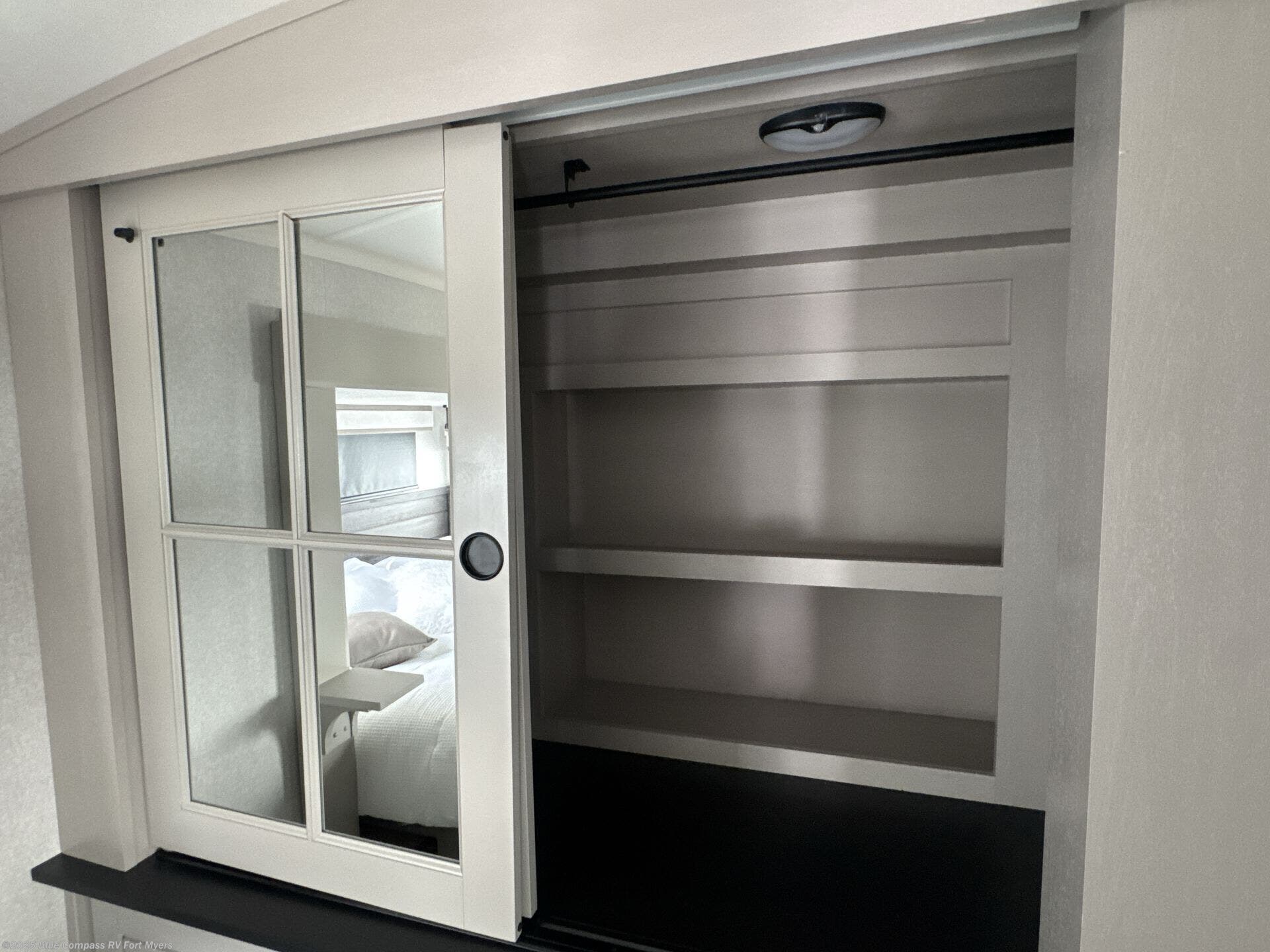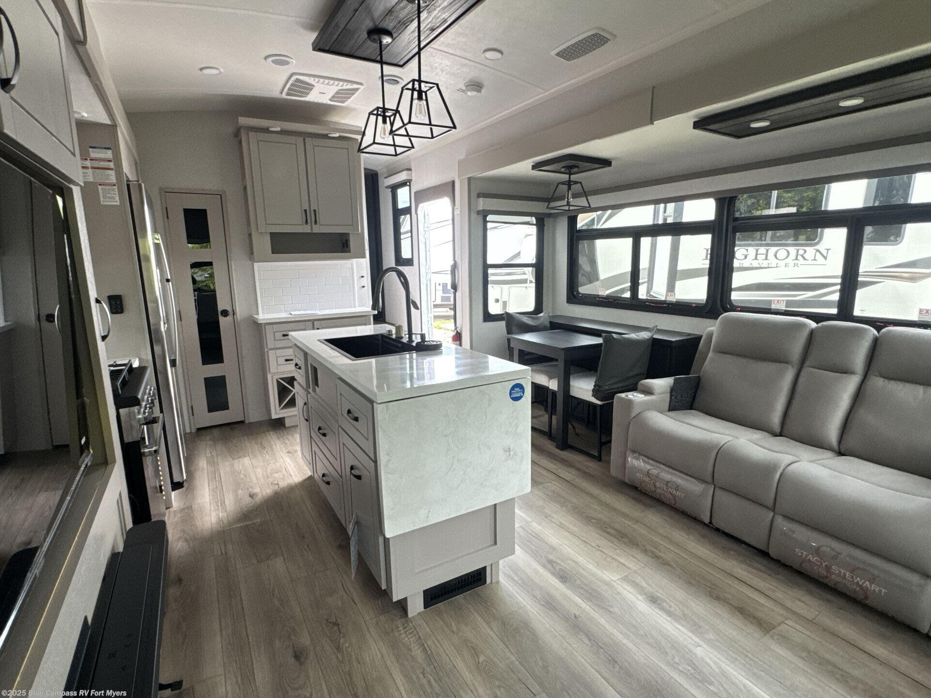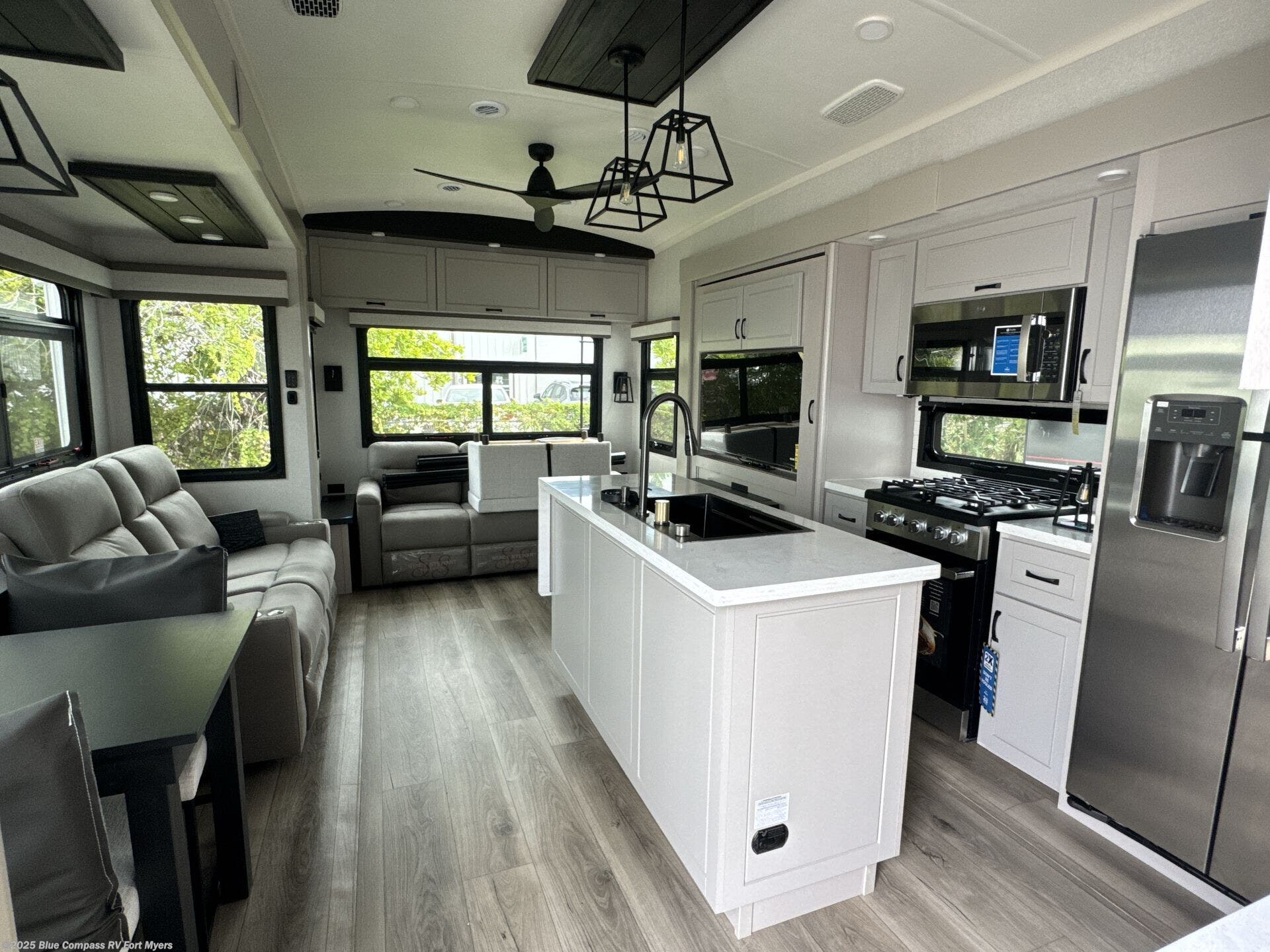 Whether you want to live in this fifth wheel or travel for long periods at a time, you will enjoy the spacious main living and kitchen area with dual slide outs as well as the bedroom with a slide out king bed. You will also find a walk-in closet with hamper and prepped space for a washer/dryer option, and a flip-top dresser with 32" TV. Easily get cleaned up in the full bathroom which also has linen storage. The cook will have a residential refrigerator to store all the cold items and beverages, a kitchen island, a pantry and a residential 24" stove. The 50" Smart LED HDTV with fully digital HDMI output and home entertainment system with subwoofer and fireplace below will provide a cozy place to watch your shows while relaxing on the theater seats, the tri-fold sofa, or the roll-top dinette table.