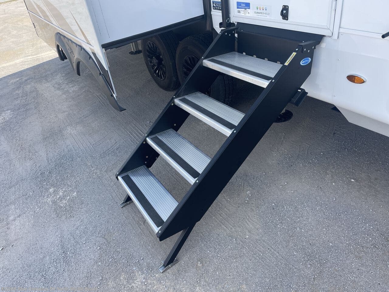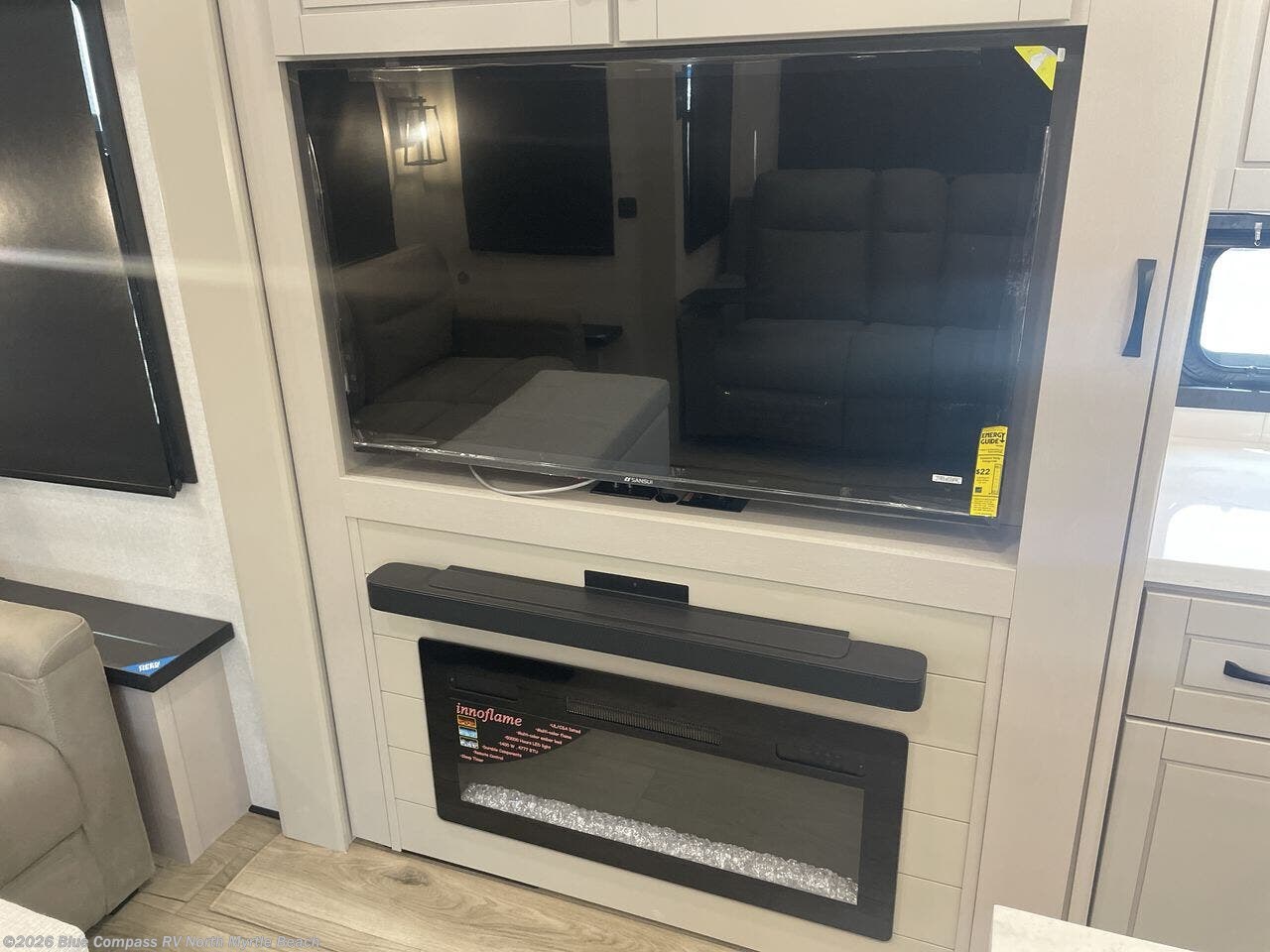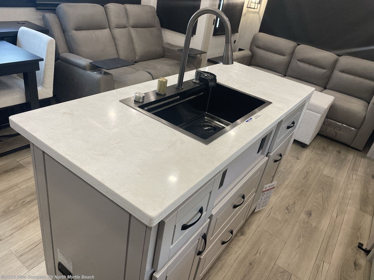 Whether you want to live in this fifth wheel or travel for long periods at a time, you will enjoy the spacious main living and kitchen area with dual slide outs as well as the bedroom with a slide out king bed. You will also find a walk-in closet with hamper and prepped space for a washer/dryer option, and a flip-top dresser with 32" TV. Easily get cleaned up in the full bathroom which also has linen storage. The cook will have a residential refrigerator to store all the cold items and beverages, a kitchen island, a pantry and a residential 24" stove. The 50" Smart LED HDTV with fully digital HDMI output and home entertainment system with subwoofer and fireplace below will provide a cozy place to watch your shows while relaxing on the theater seats, the tri-fold sofa, or the roll-top dinette table.