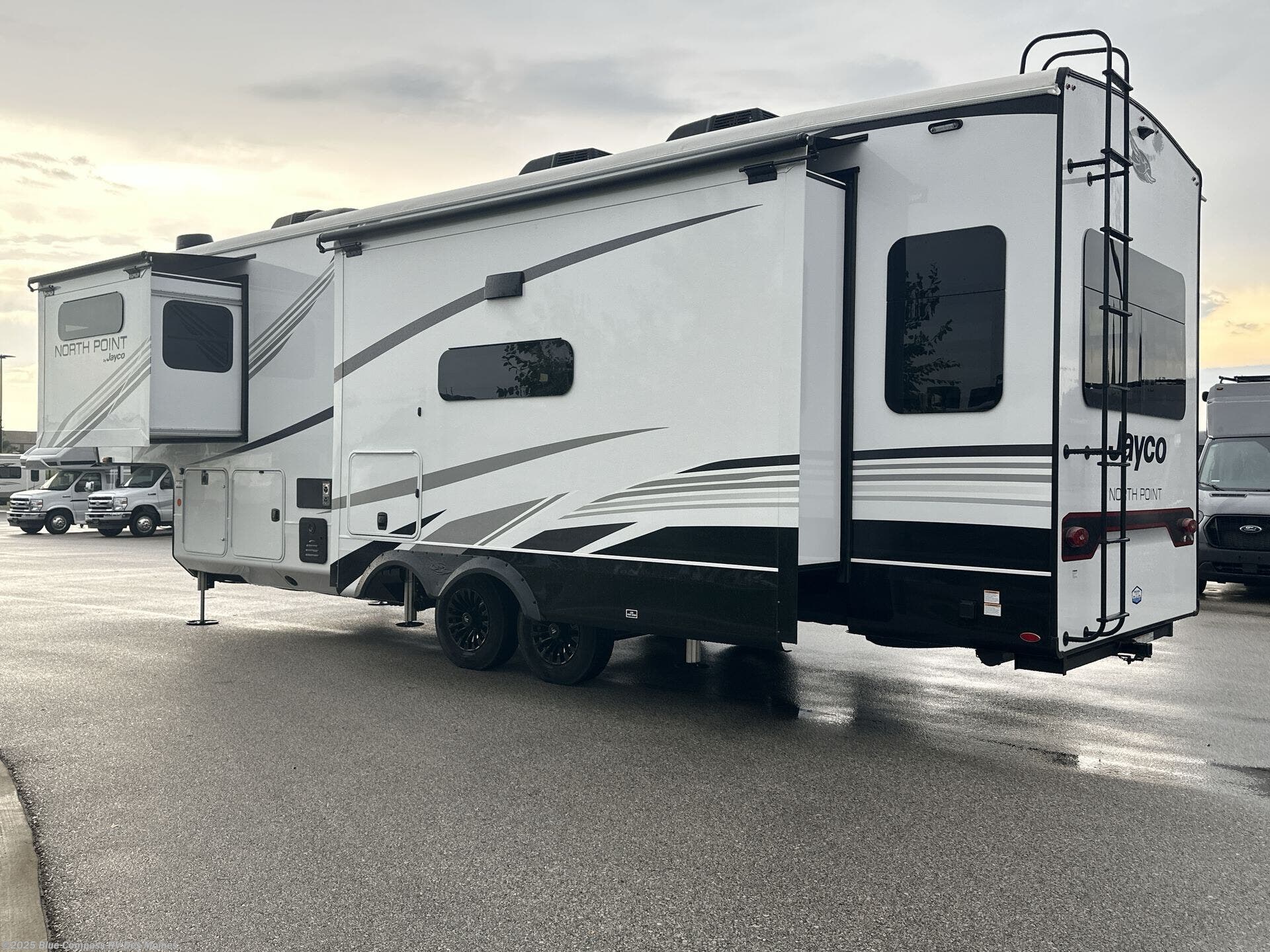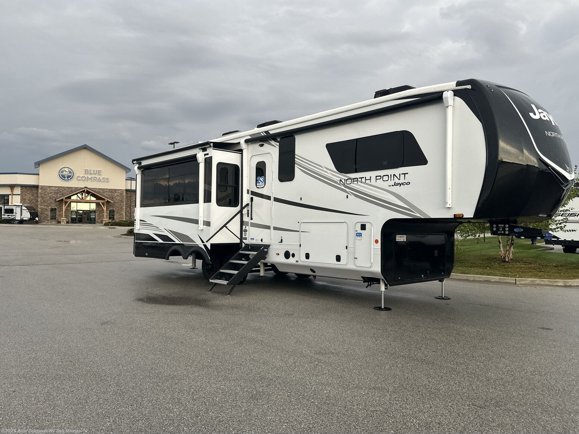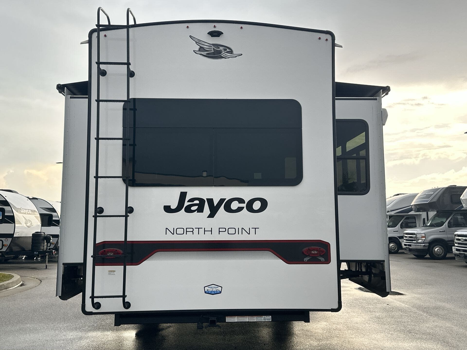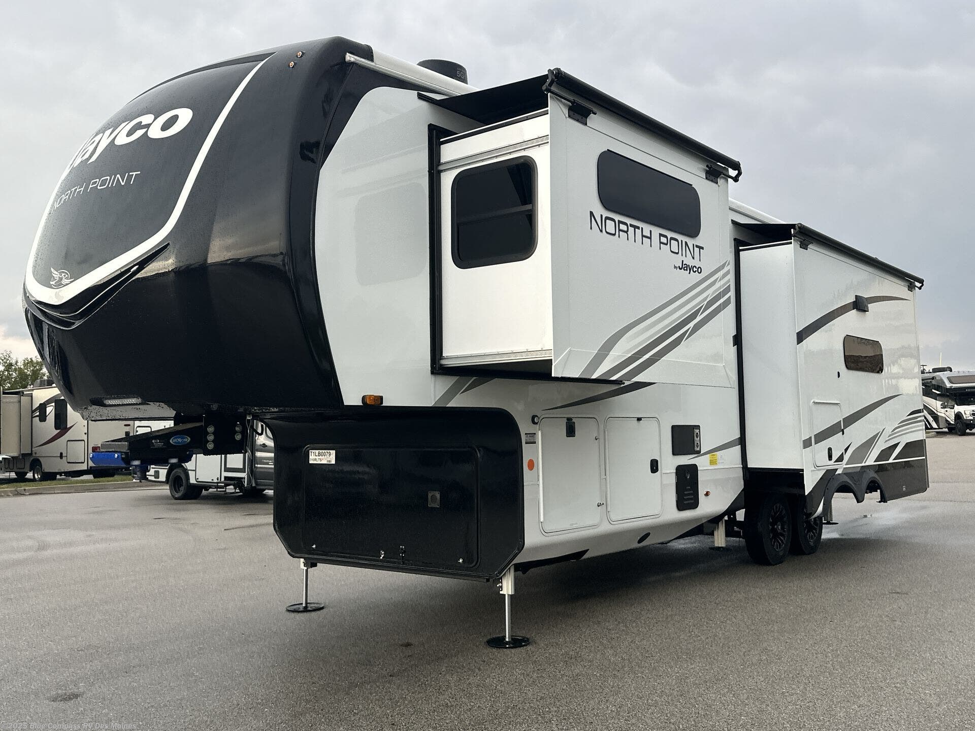 With any North Point fifth wheel by Jayco you begin with a strong foundation with a custom frame, designed and sized specifically to best support each unit. Constructed with Stronghold VBL™ aluminum framed, vacuum bond laminated walls and the Magnum Truss™ XL6™ roof system with an Alpha roof membrane system, which is the strongest tested roof in the industry. The 5-Star Handling package is included with Uniroyal tires, a MORryde rubber pin box, Dexter axles with Nev-R-Adjust brakes, MORryde CRE-3000 rubberized suspension and wet bolt fasteners and bronze bushings. The interior has handcrafted hardwood glazed doors and drawers, vinyl flooring throughout, an integrated under-mount sink in the main bathroom, plus so much more you just have to see one to believe it all!