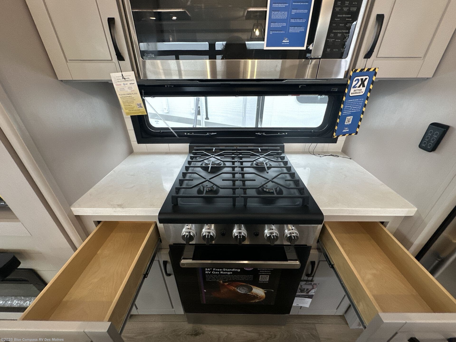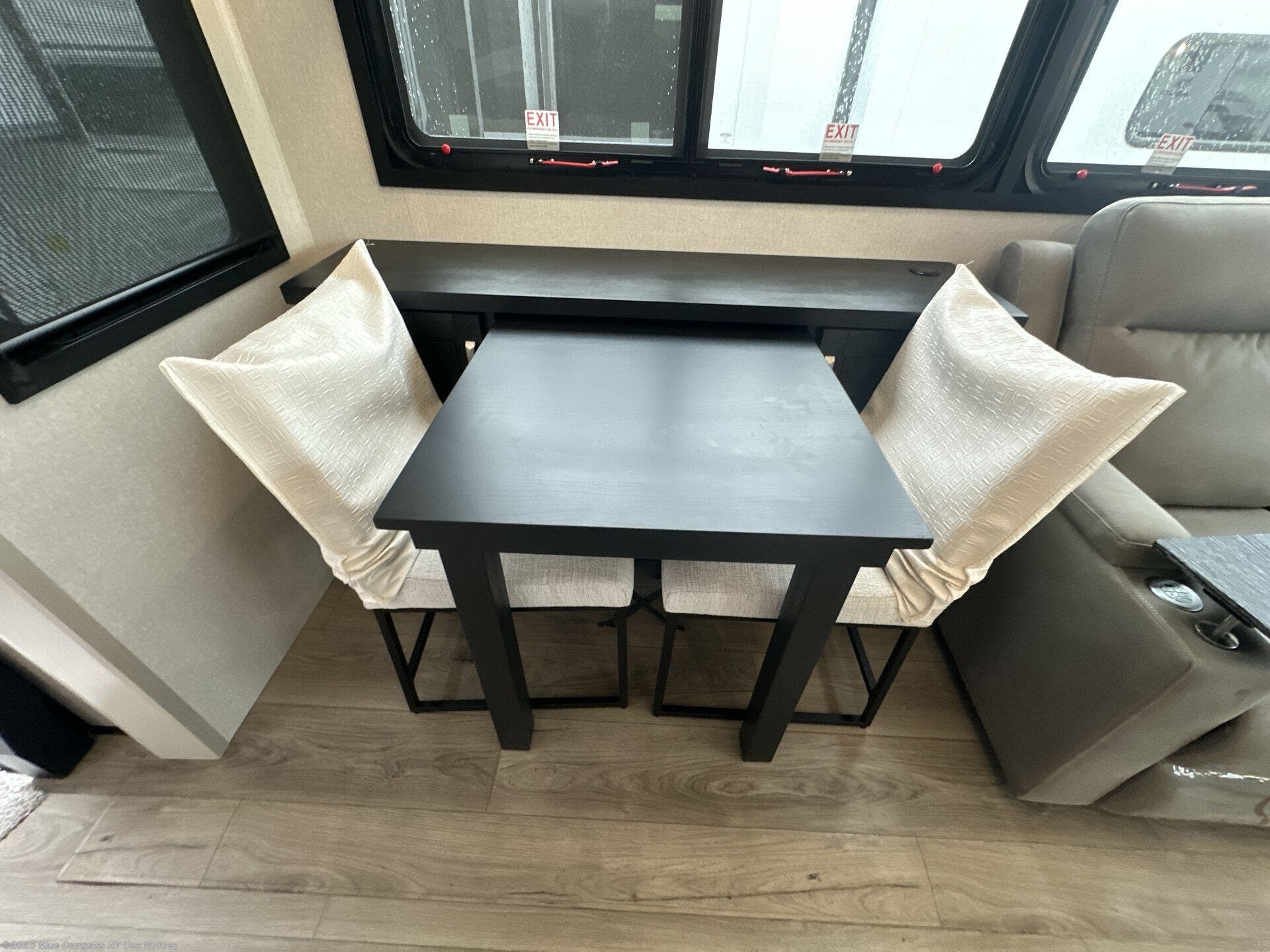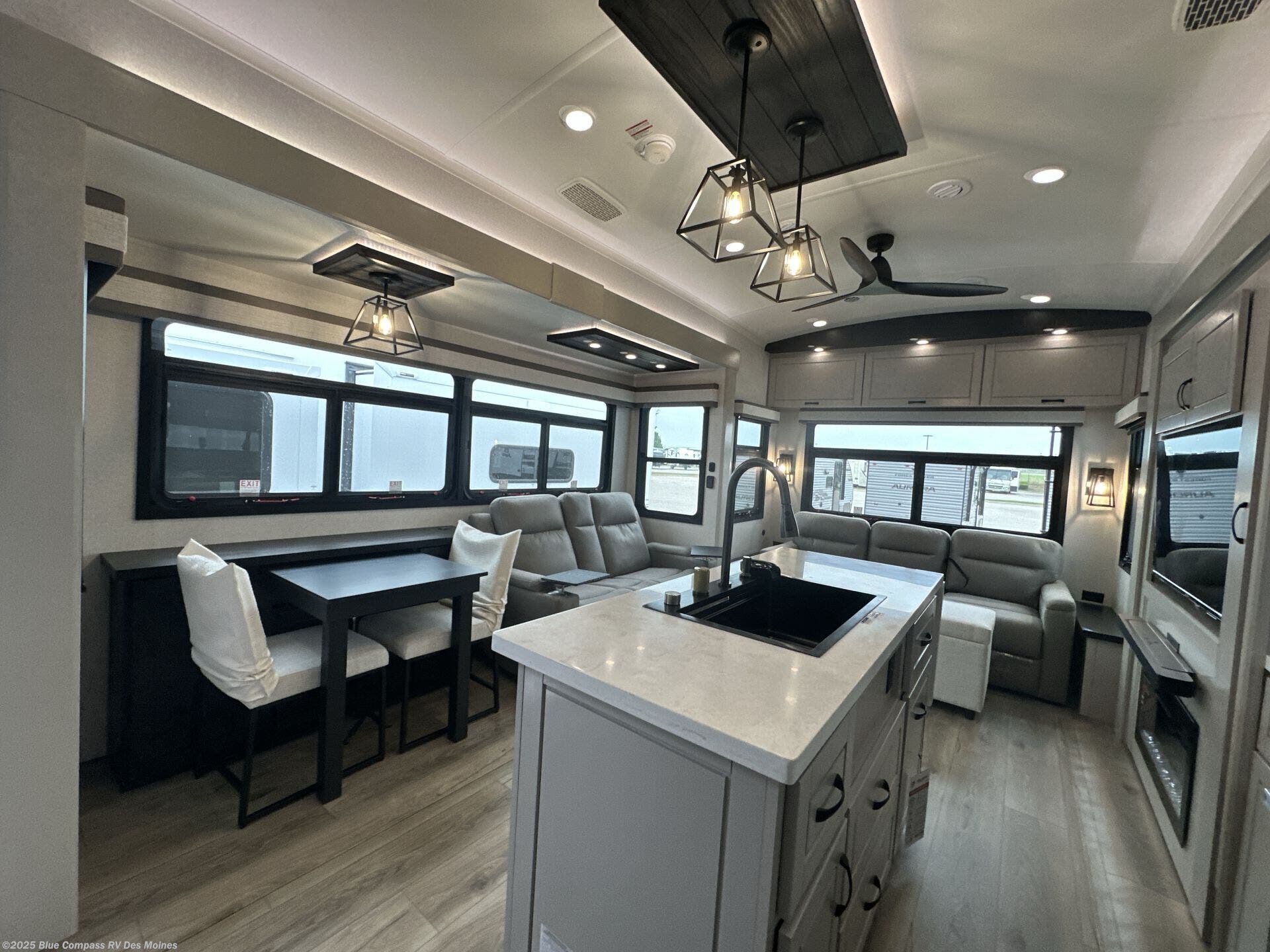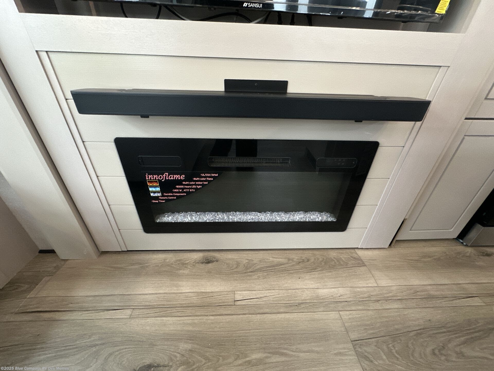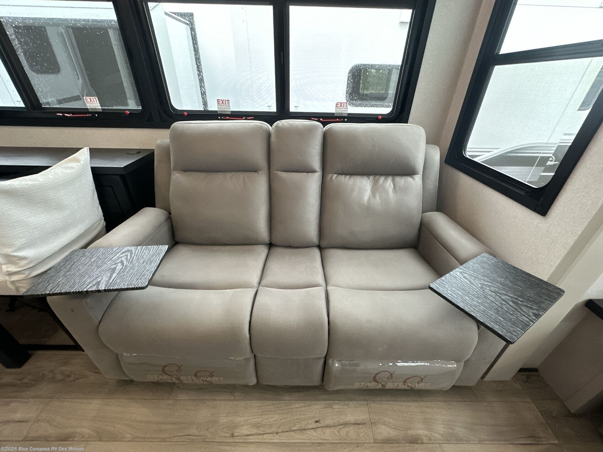 Whether you want to live in this fifth wheel or travel for long periods at a time, you will enjoy the spacious main living and kitchen area with dual slide outs as well as the bedroom with a slide out king bed. You will also find a walk-in closet with hamper and prepped space for a washer/dryer option, and a flip-top dresser with 32" TV. Easily get cleaned up in the full bathroom which also has linen storage. The cook will have a residential refrigerator to store all the cold items and beverages, a kitchen island, a pantry and a residential 24" stove. The 50" Smart LED HDTV with fully digital HDMI output and home entertainment system with subwoofer and fireplace below will provide a cozy place to watch your shows while relaxing on the theater seats, the tri-fold sofa, or the roll-top dinette table.