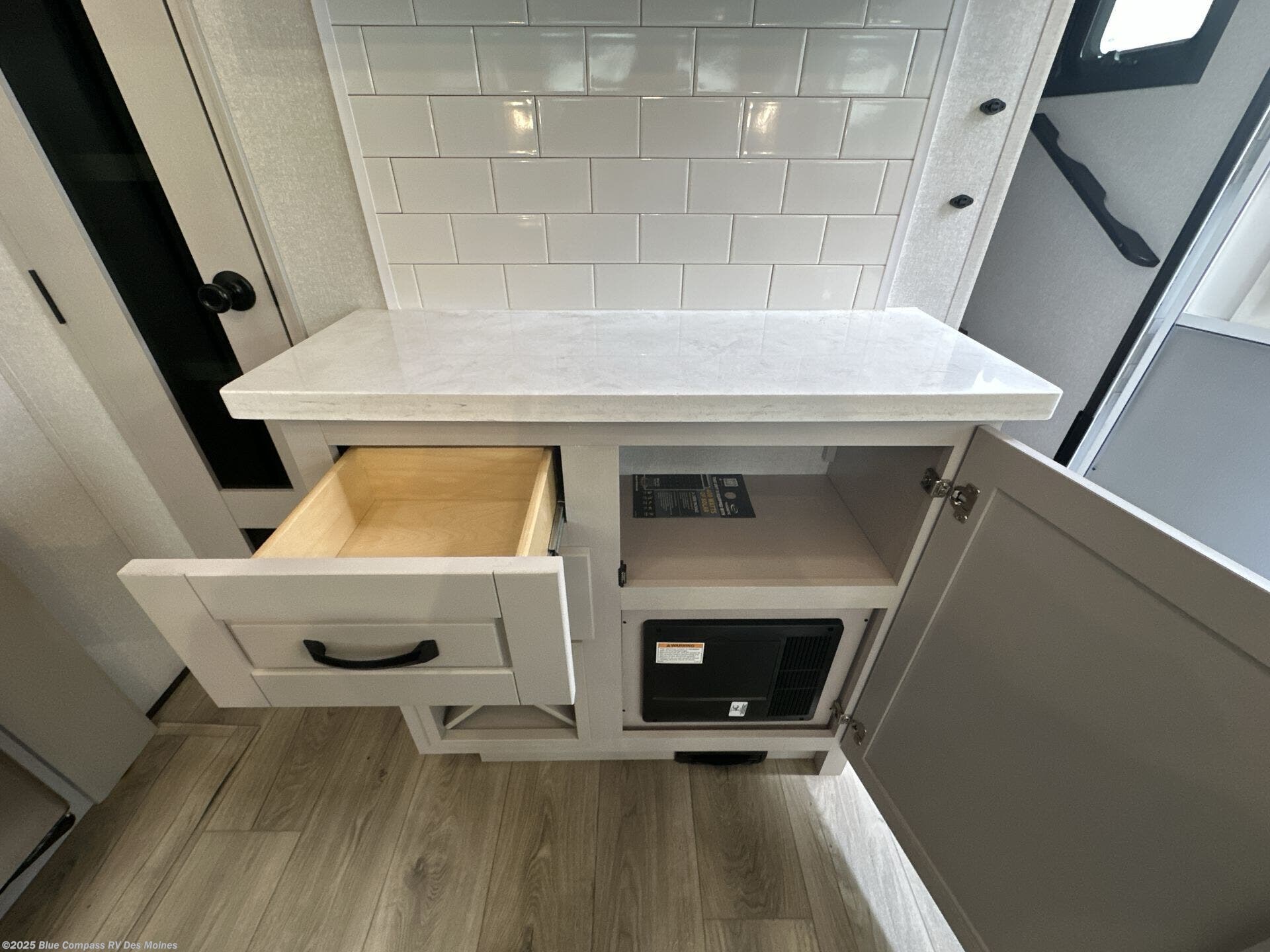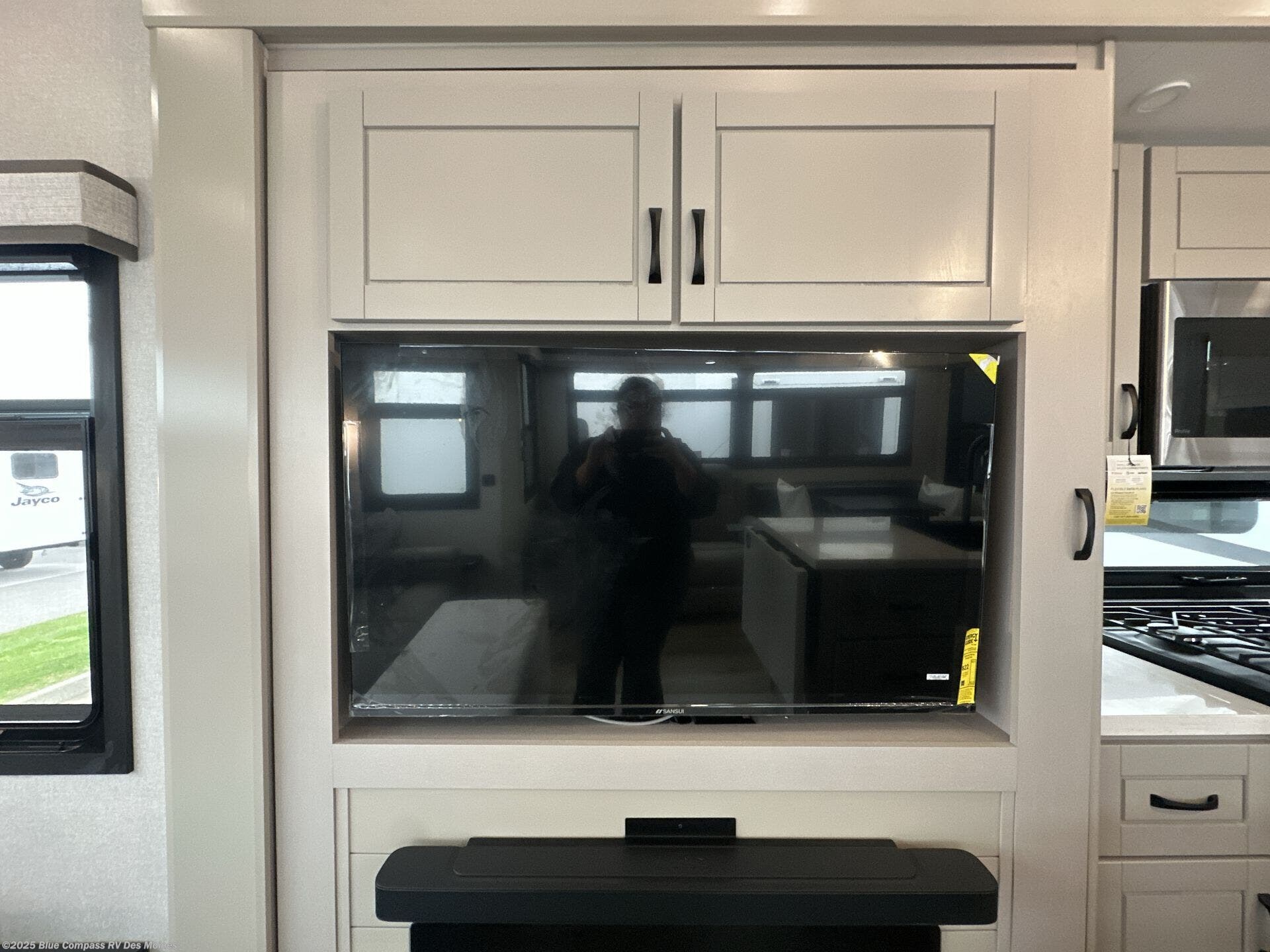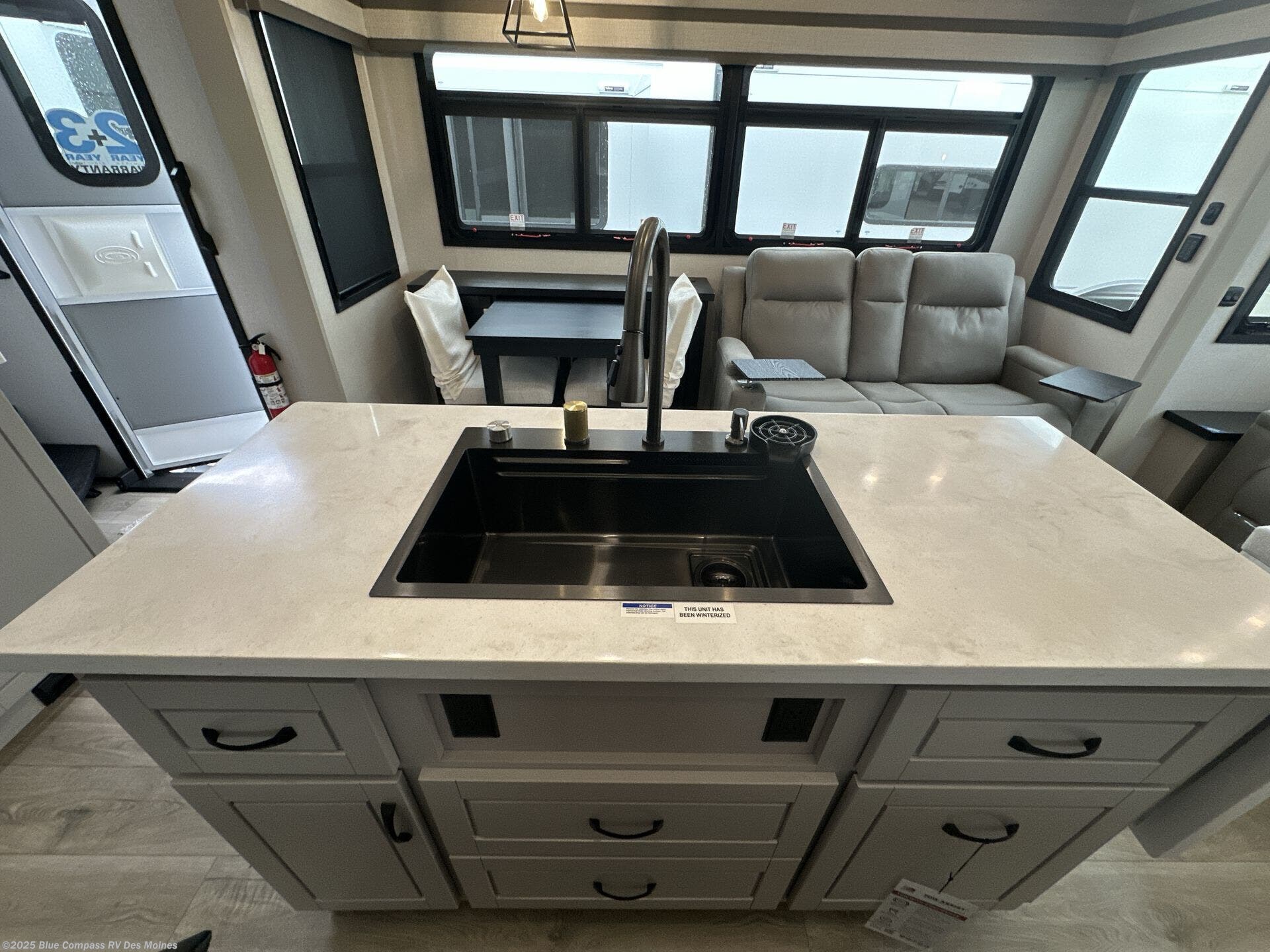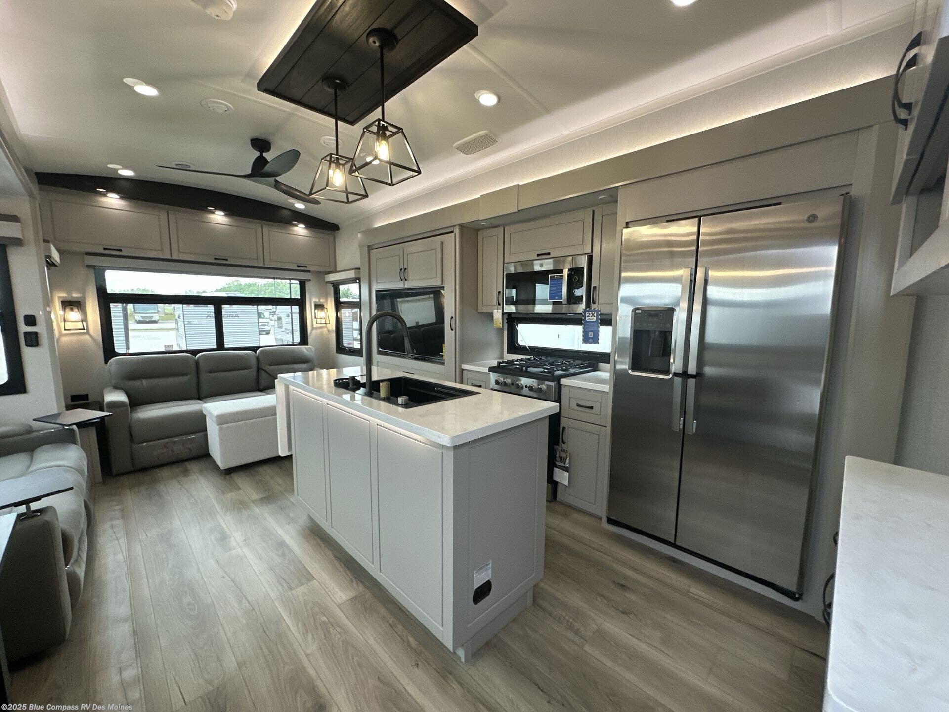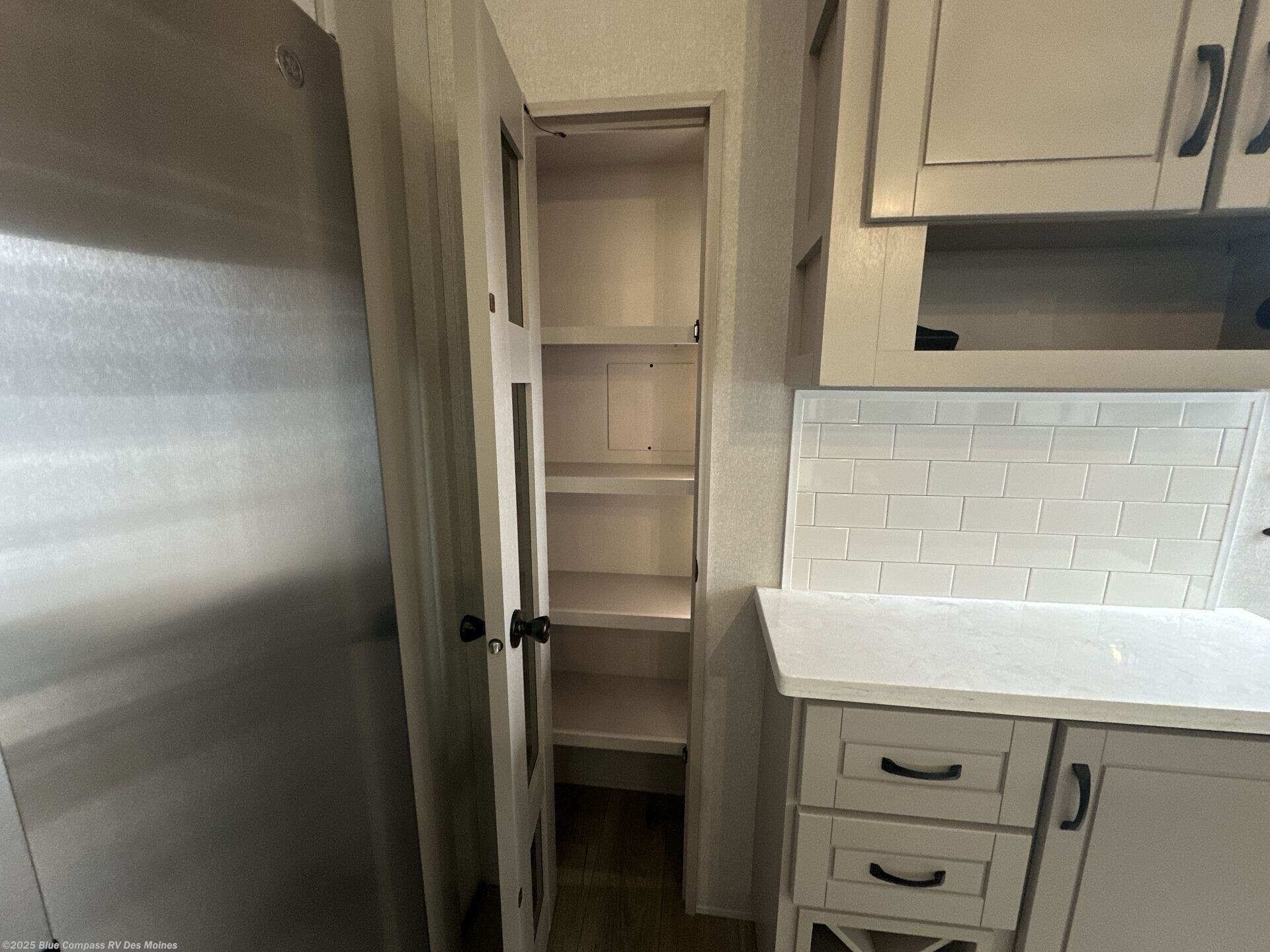 Whether you want to live in this fifth wheel or travel for long periods at a time, you will enjoy the spacious main living and kitchen area with dual slide outs as well as the bedroom with a slide out king bed. You will also find a walk-in closet with hamper and prepped space for a washer/dryer option, and a flip-top dresser with 32" TV. Easily get cleaned up in the full bathroom which also has linen storage. The cook will have a residential refrigerator to store all the cold items and beverages, a kitchen island, a pantry and a residential 24" stove. The 50" Smart LED HDTV with fully digital HDMI output and home entertainment system with subwoofer and fireplace below will provide a cozy place to watch your shows while relaxing on the theater seats, the tri-fold sofa, or the roll-top dinette table.