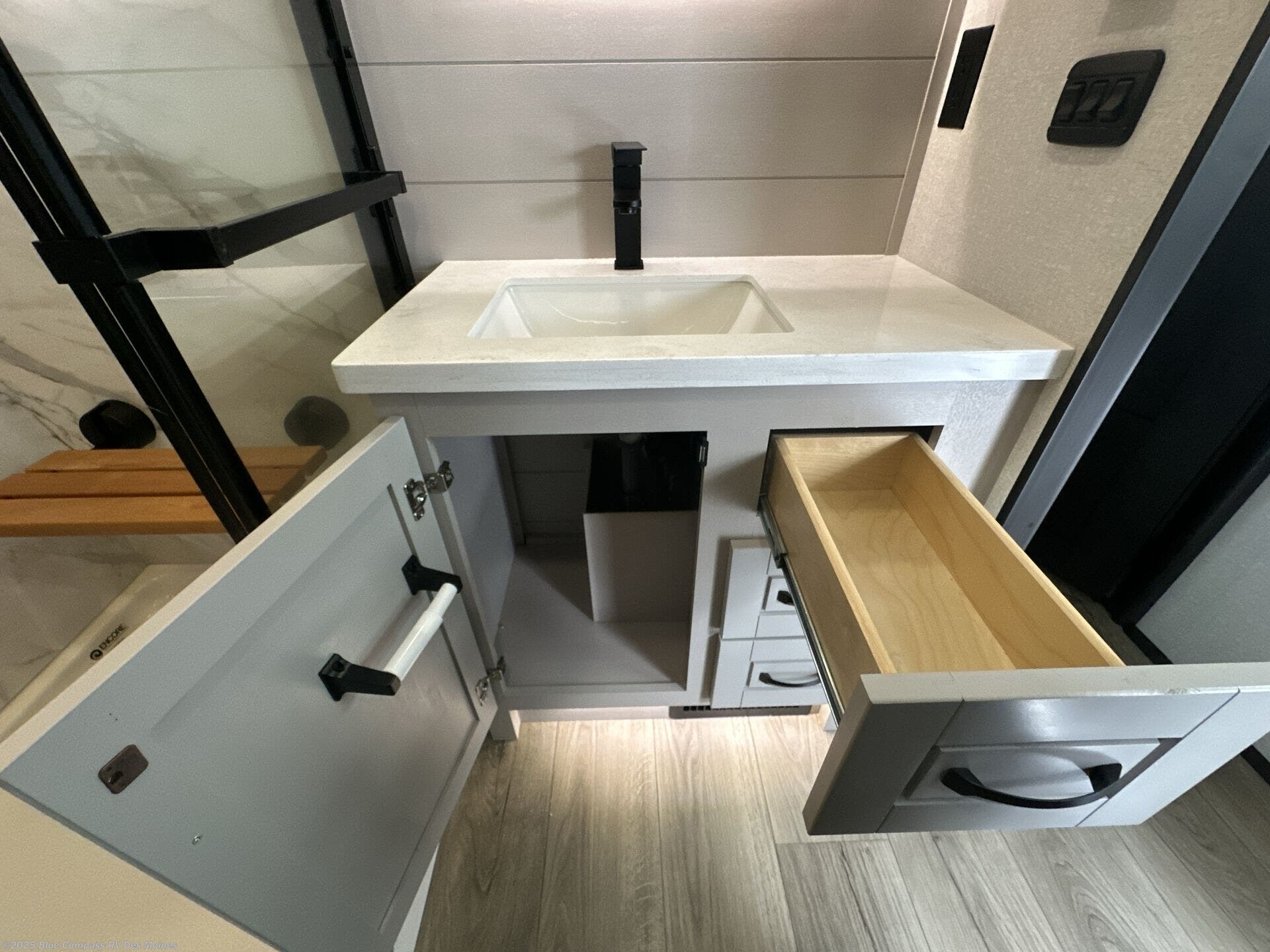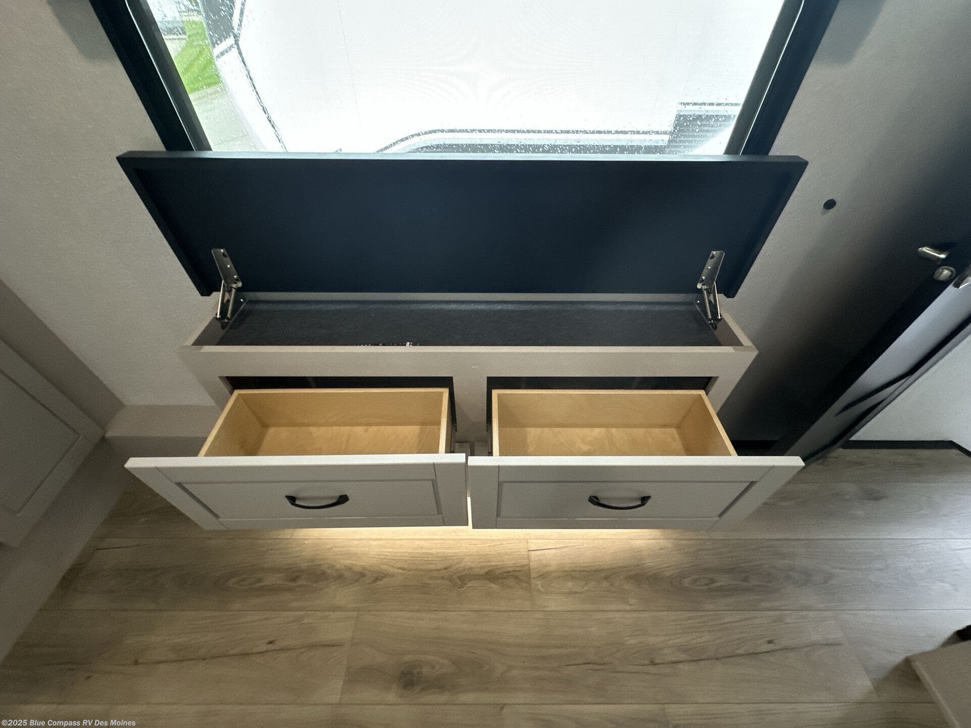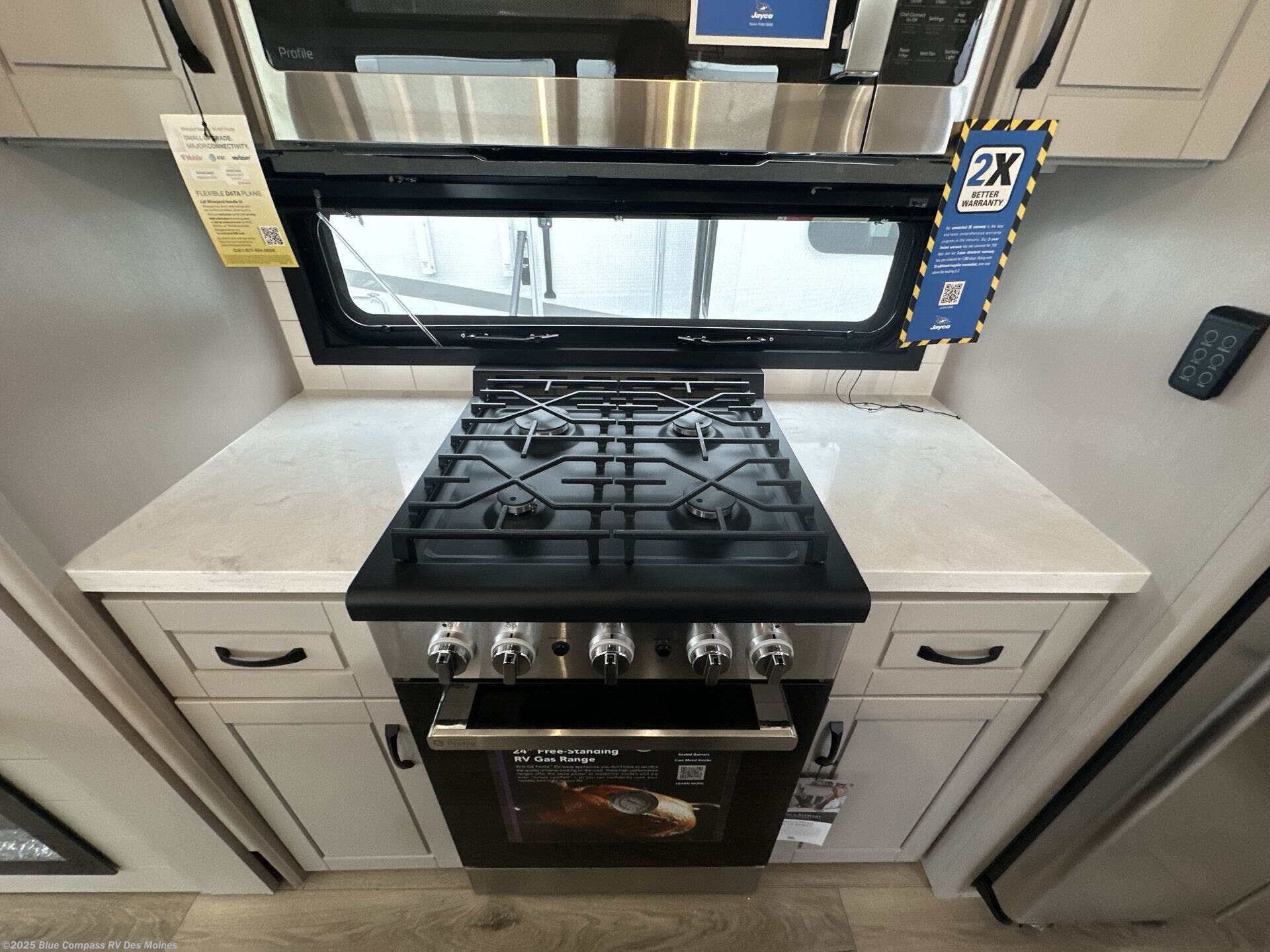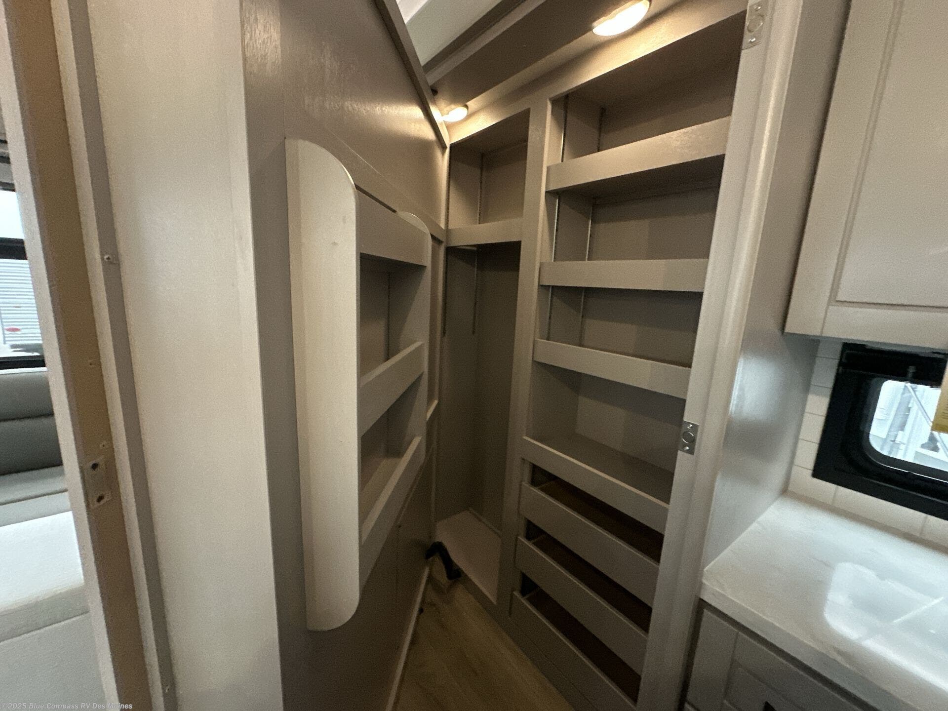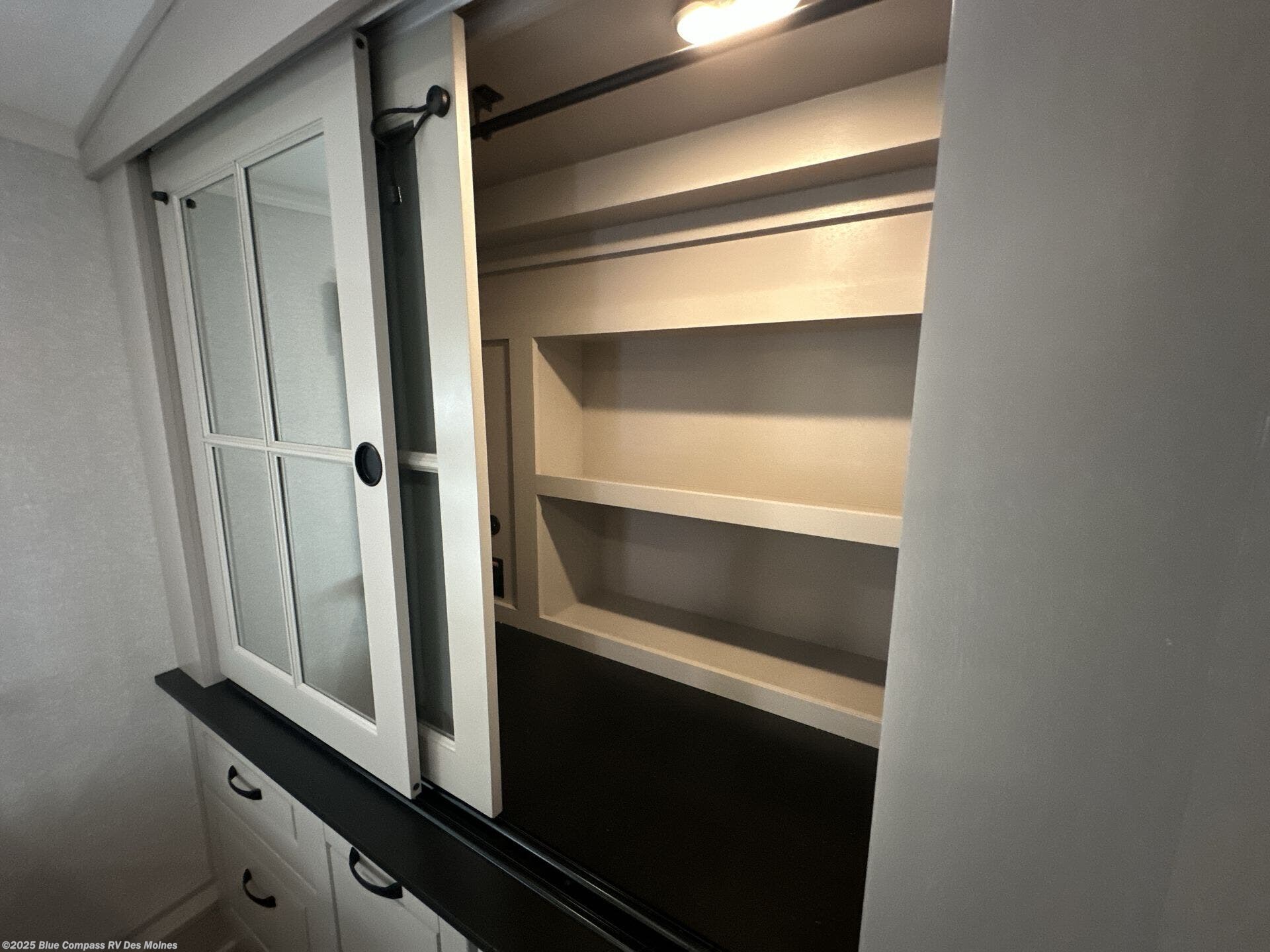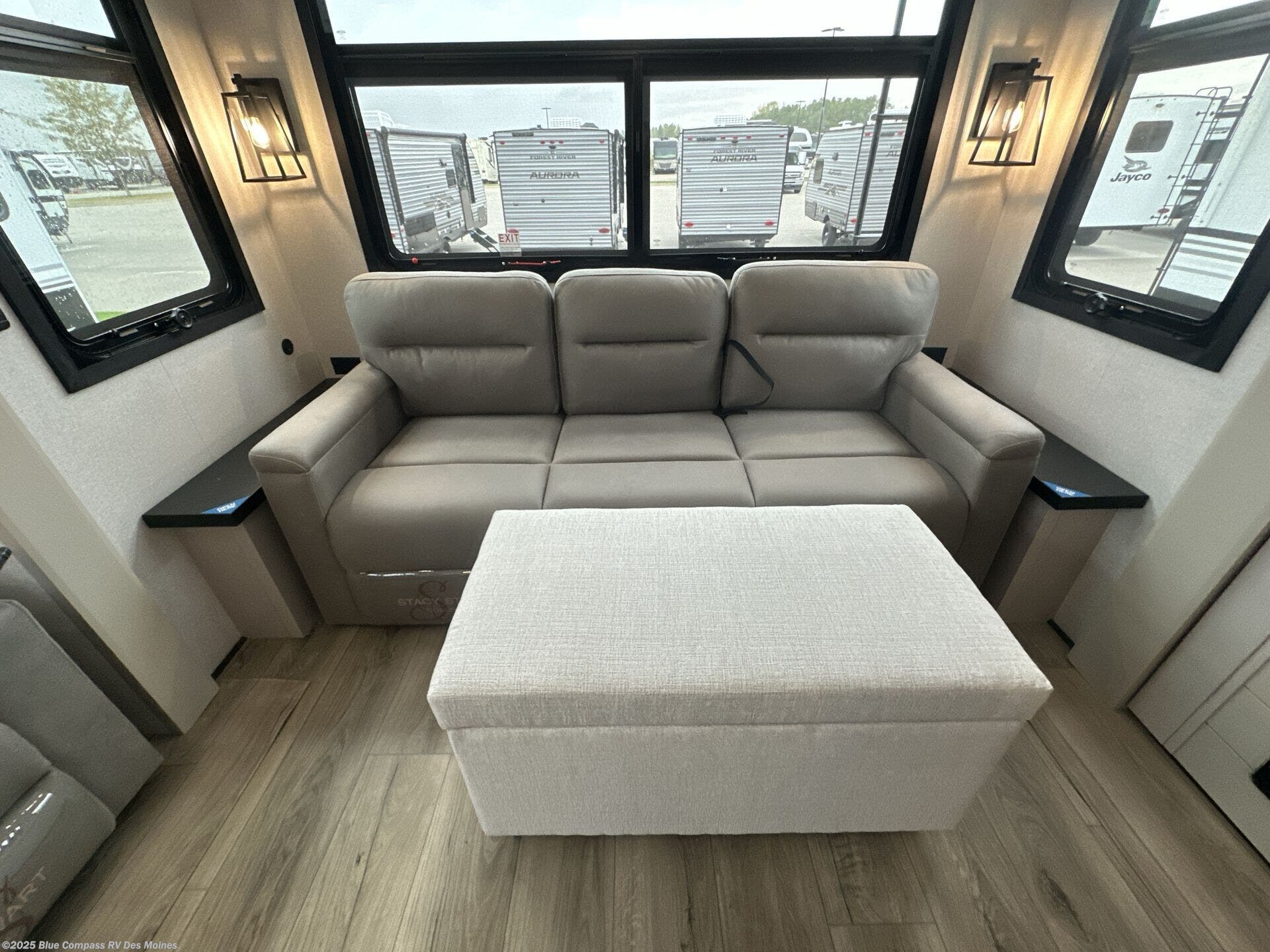 Whether you want to live in this fifth wheel or travel for long periods at a time, you will enjoy the spacious main living and kitchen area with dual slide outs as well as the bedroom with a slide out king bed. You will also find a walk-in closet with hamper and prepped space for a washer/dryer option, and a flip-top dresser with 32" TV. Easily get cleaned up in the full bathroom which also has linen storage. The cook will have a residential refrigerator to store all the cold items and beverages, a kitchen island, a pantry and a residential 24" stove. The 50" Smart LED HDTV with fully digital HDMI output and home entertainment system with subwoofer and fireplace below will provide a cozy place to watch your shows while relaxing on the theater seats, the tri-fold sofa, or the roll-top dinette table.