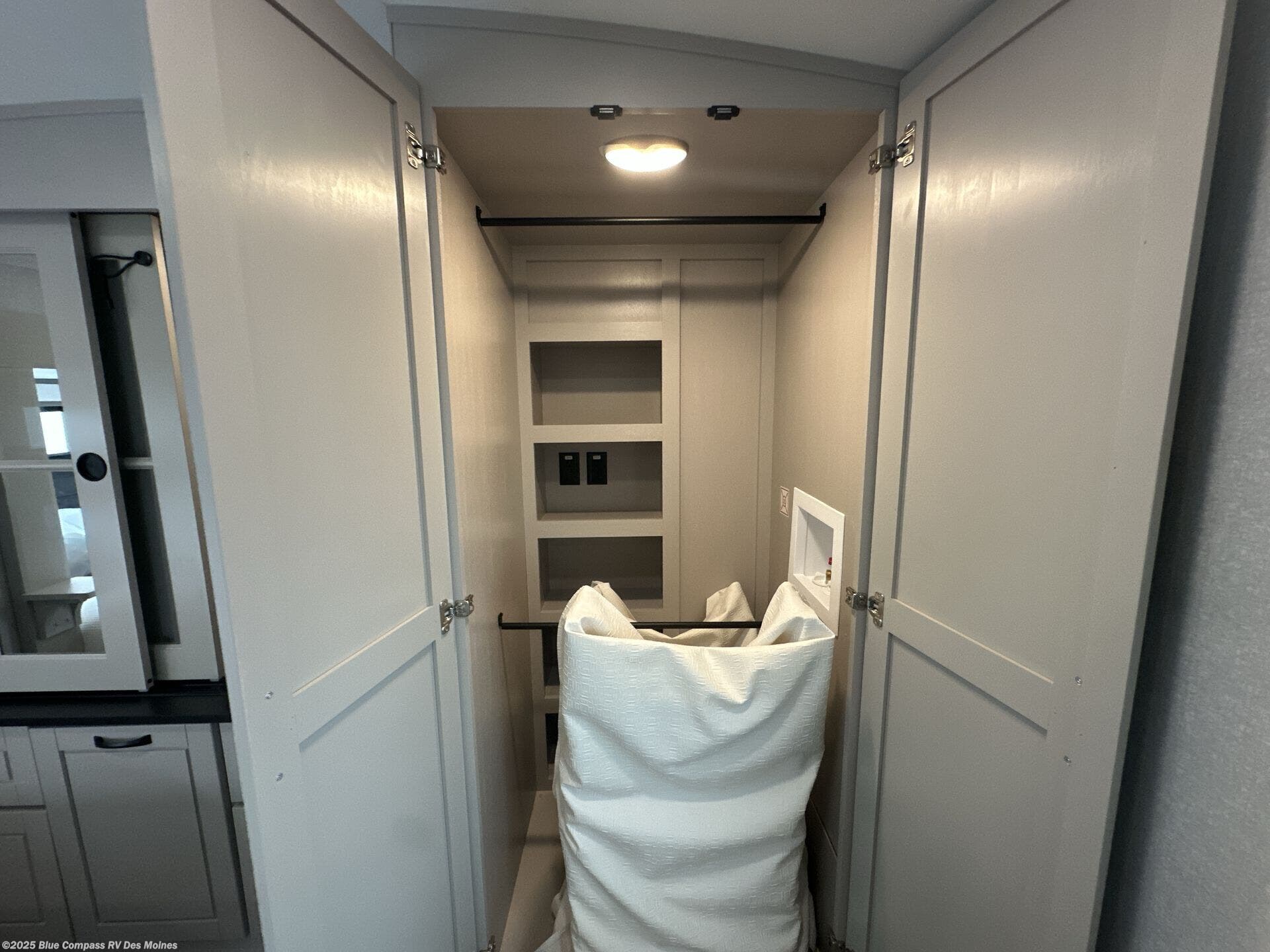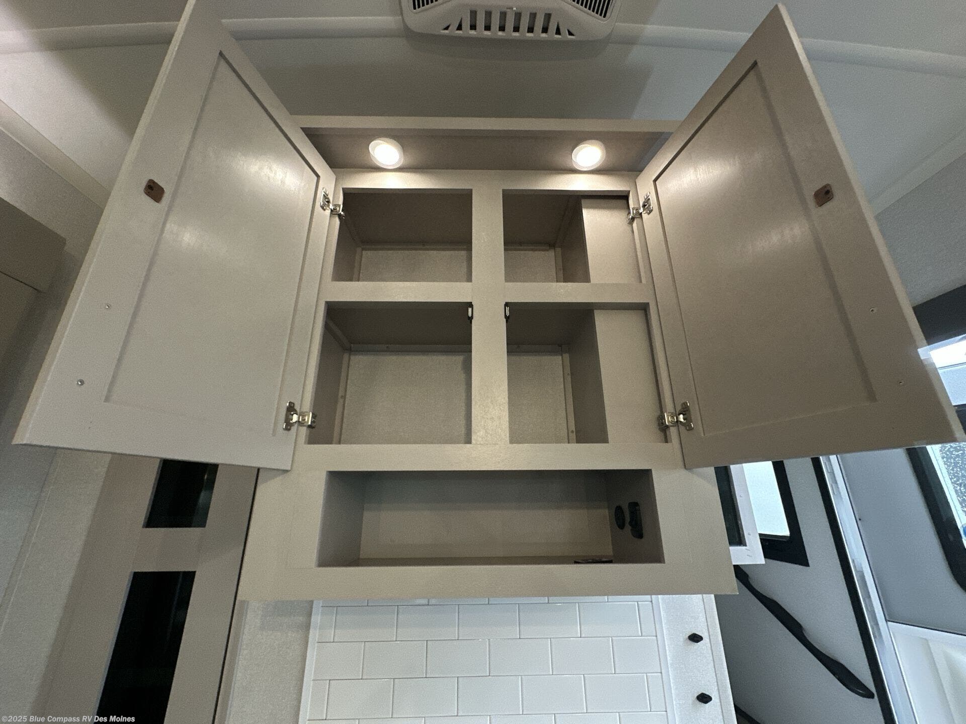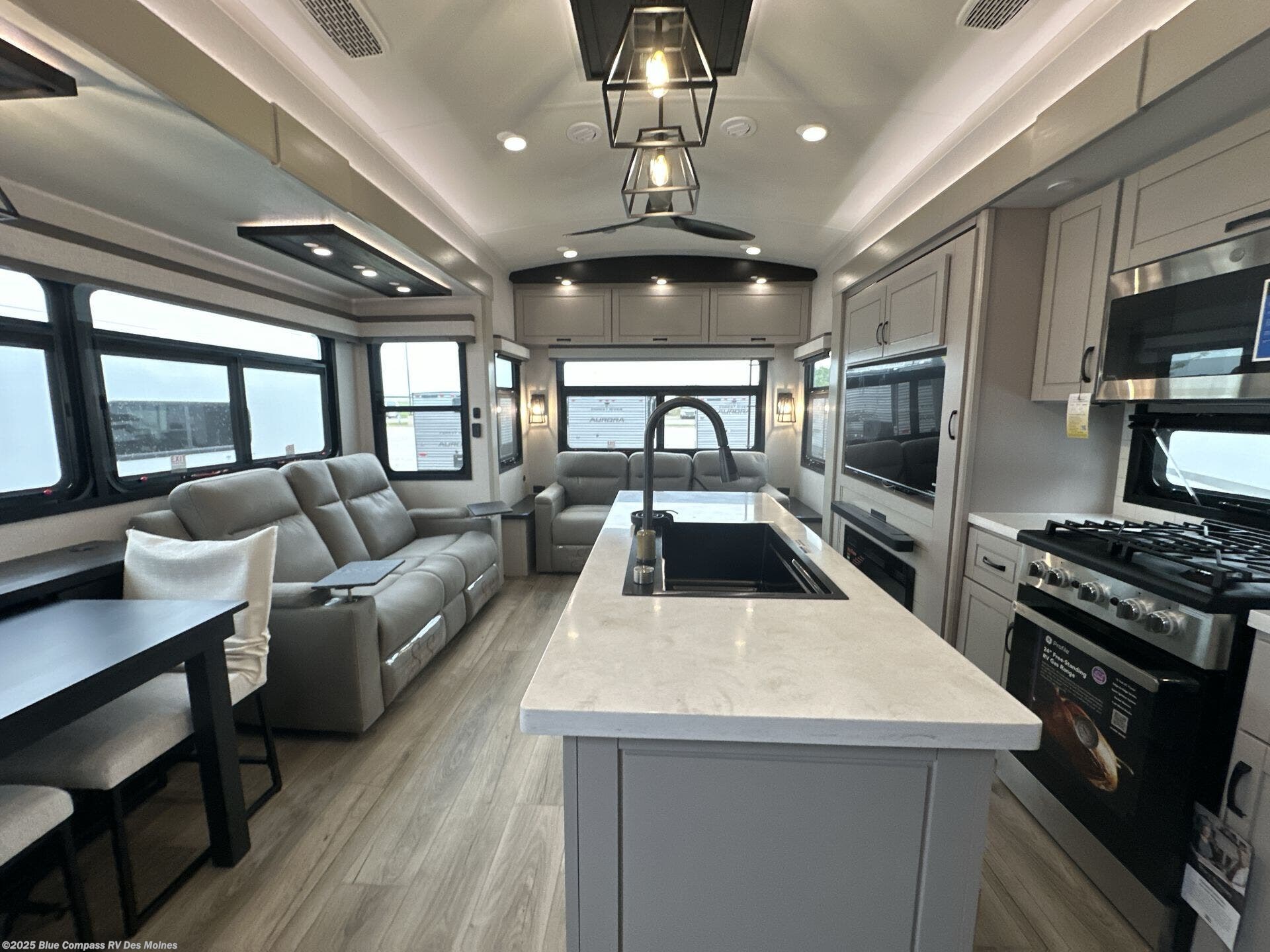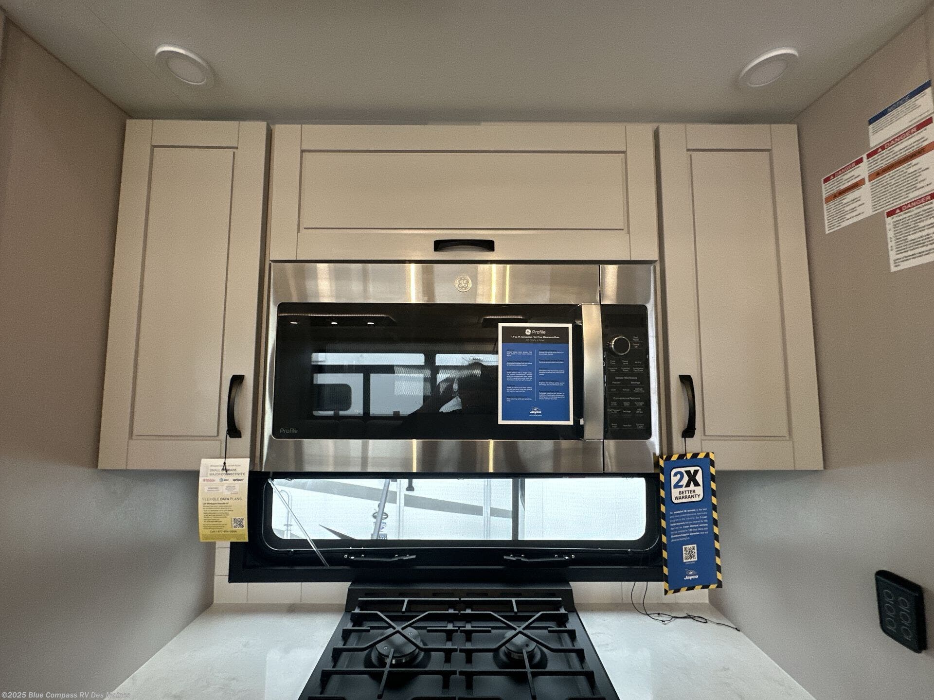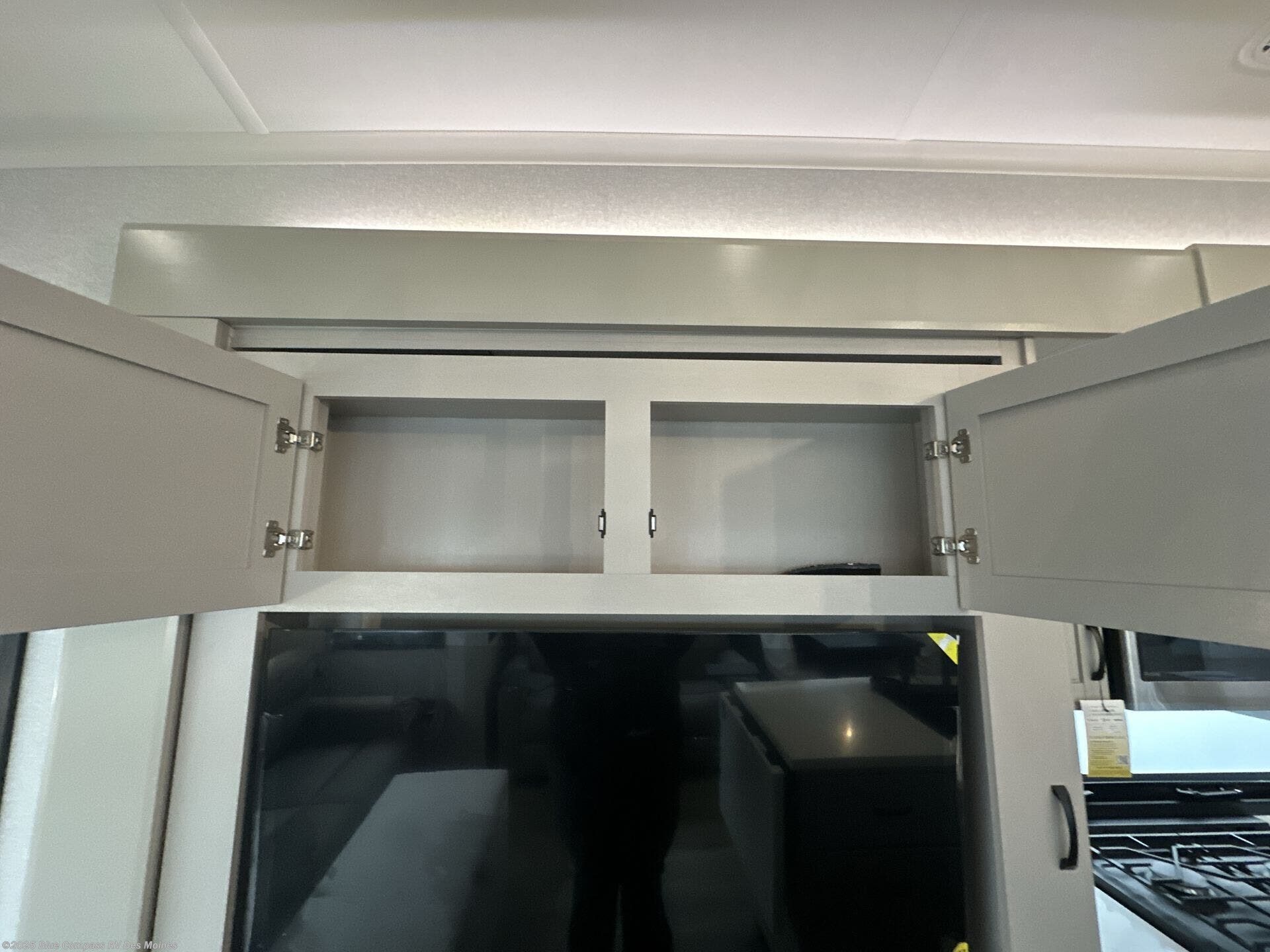 Whether you want to live in this fifth wheel or travel for long periods at a time, you will enjoy the spacious main living and kitchen area with dual slide outs as well as the bedroom with a slide out king bed. You will also find a walk-in closet with hamper and prepped space for a washer/dryer option, and a flip-top dresser with 32" TV. Easily get cleaned up in the full bathroom which also has linen storage. The cook will have a residential refrigerator to store all the cold items and beverages, a kitchen island, a pantry and a residential 24" stove. The 50" Smart LED HDTV with fully digital HDMI output and home entertainment system with subwoofer and fireplace below will provide a cozy place to watch your shows while relaxing on the theater seats, the tri-fold sofa, or the roll-top dinette table.
