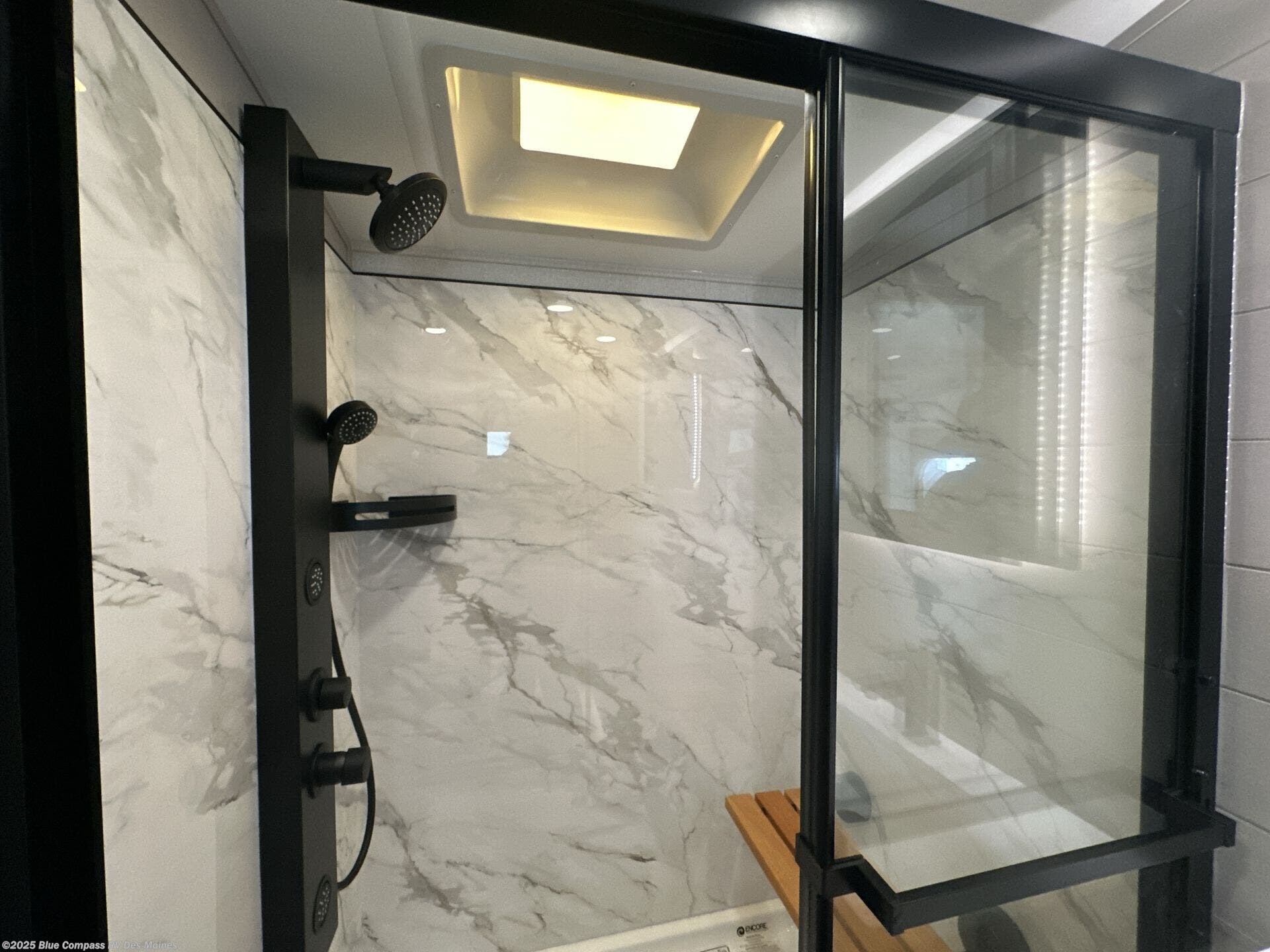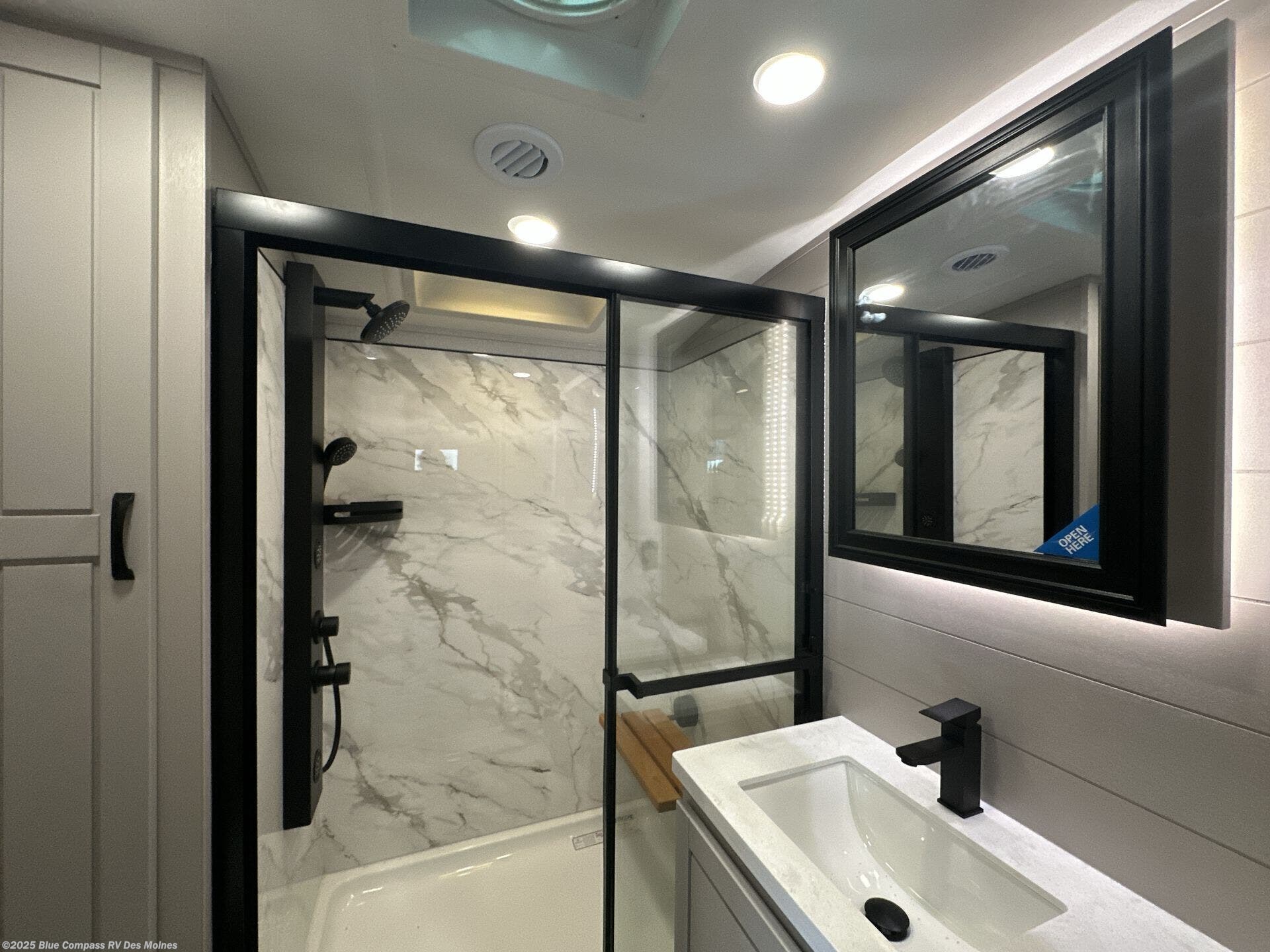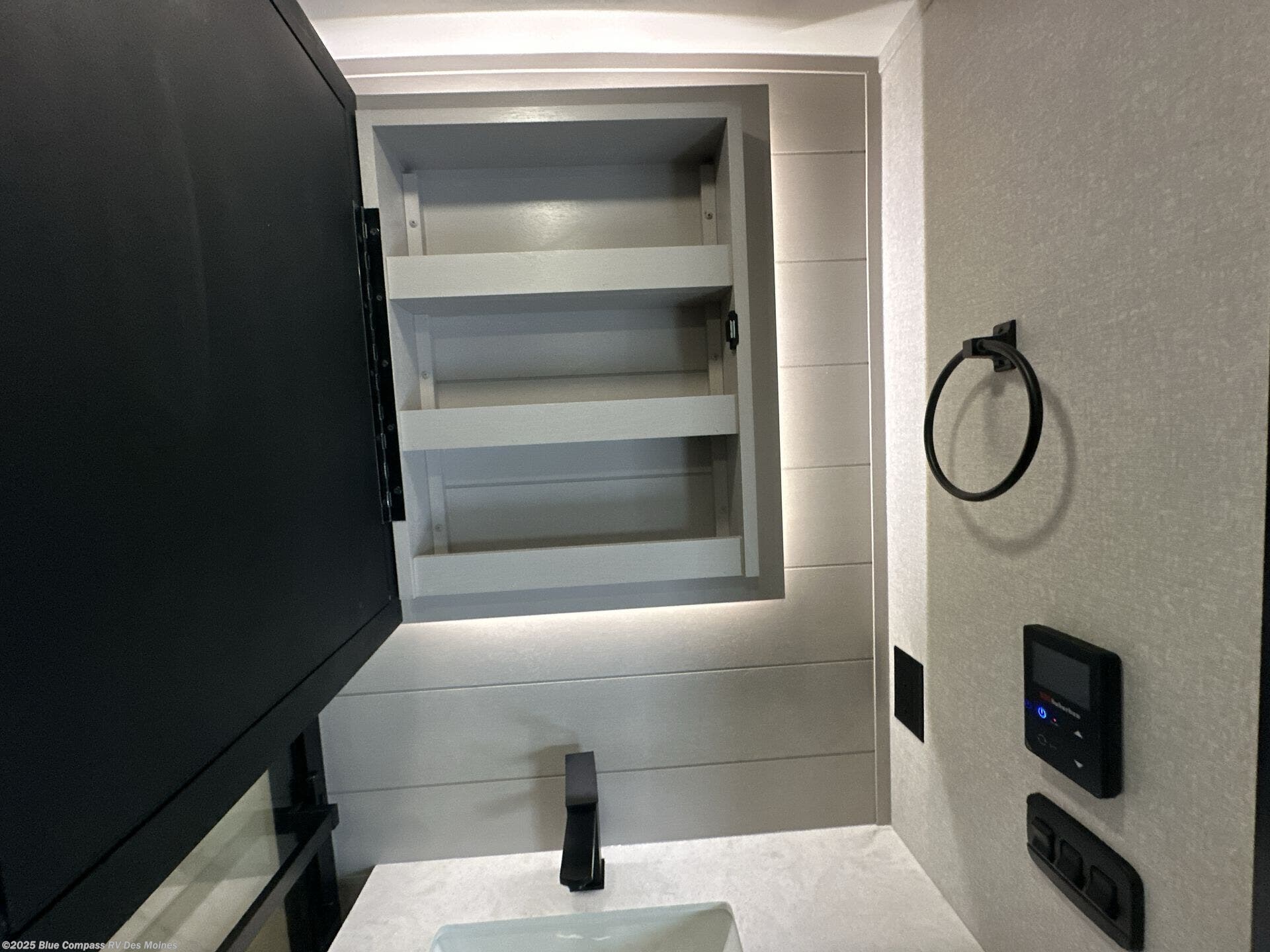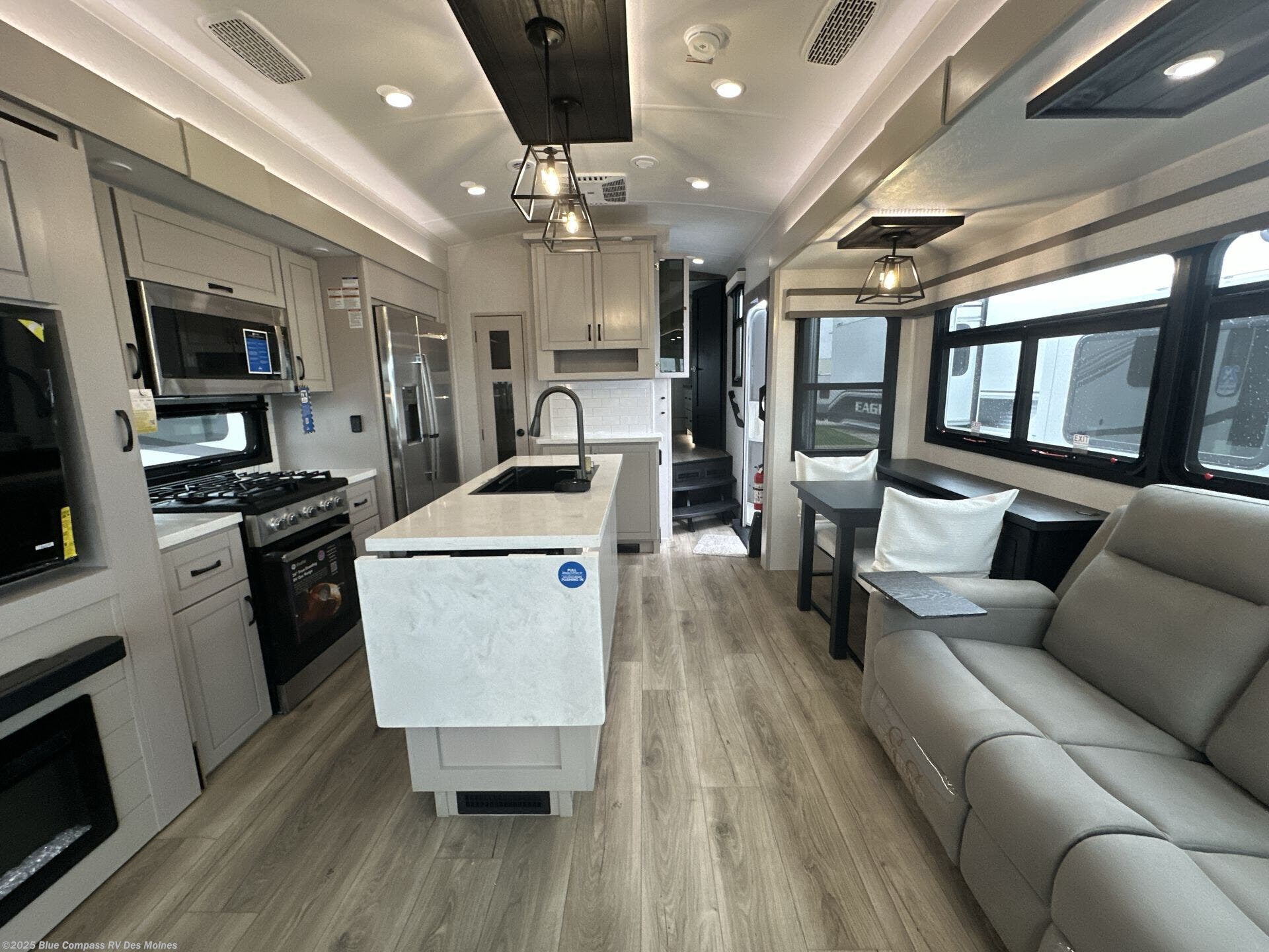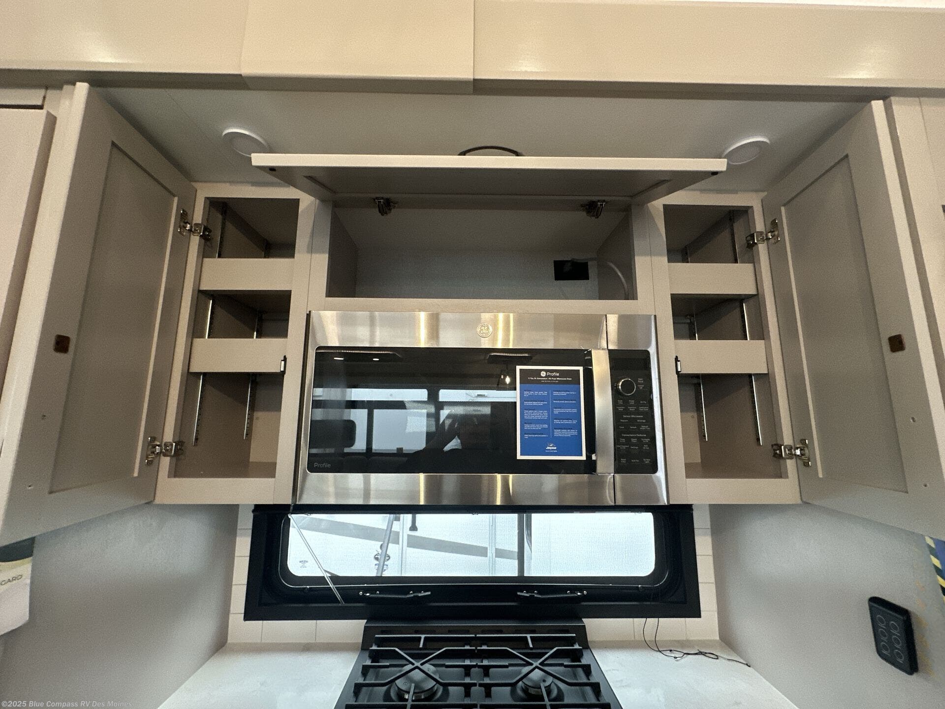 Whether you want to live in this fifth wheel or travel for long periods at a time, you will enjoy the spacious main living and kitchen area with dual slide outs as well as the bedroom with a slide out king bed. You will also find a walk-in closet with hamper and prepped space for a washer/dryer option, and a flip-top dresser with 32" TV. Easily get cleaned up in the full bathroom which also has linen storage. The cook will have a residential refrigerator to store all the cold items and beverages, a kitchen island, a pantry and a residential 24" stove. The 50" Smart LED HDTV with fully digital HDMI output and home entertainment system with subwoofer and fireplace below will provide a cozy place to watch your shows while relaxing on the theater seats, the tri-fold sofa, or the roll-top dinette table.