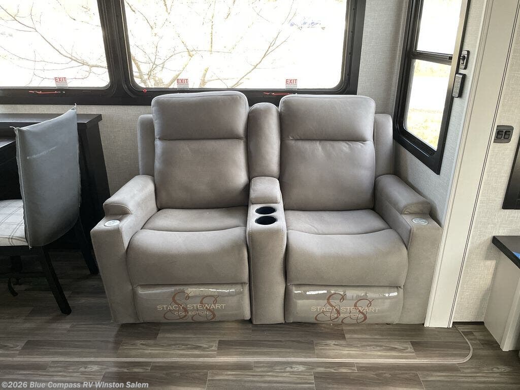 Whether you want to live in this fifth wheel or travel for long periods at a time, you will enjoy the spacious main living and kitchen area with dual slide outs as well as the bedroom with a slide out king bed. You will also find drawers with hamper and prepped space for a washer/dryer option, and a flip-top dresser with 32" TV. Easily get cleaned up in the full bathroom which also has linen storage. The cook will have a residential refrigerator to store all the cold items and beverages, a kitchen island, a pantry and a residential 24" stove. The 4K Smart LED HDTV with fully digital HDMI output and home entertainment system with subwoofer and fireplace below will provide a cozy place to watch your shows while relaxing on the theater seats, the tri-fold sofa, or the roll-top dinette table.