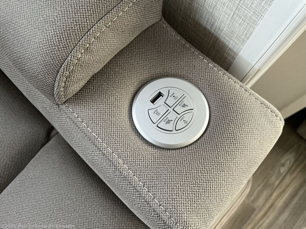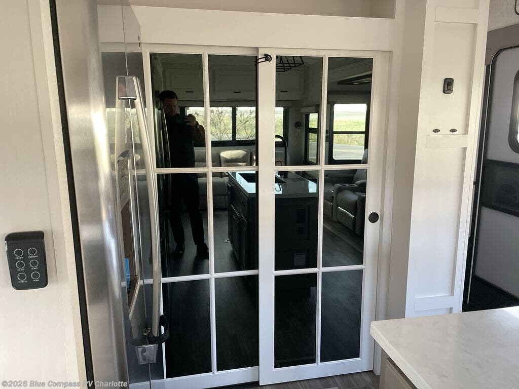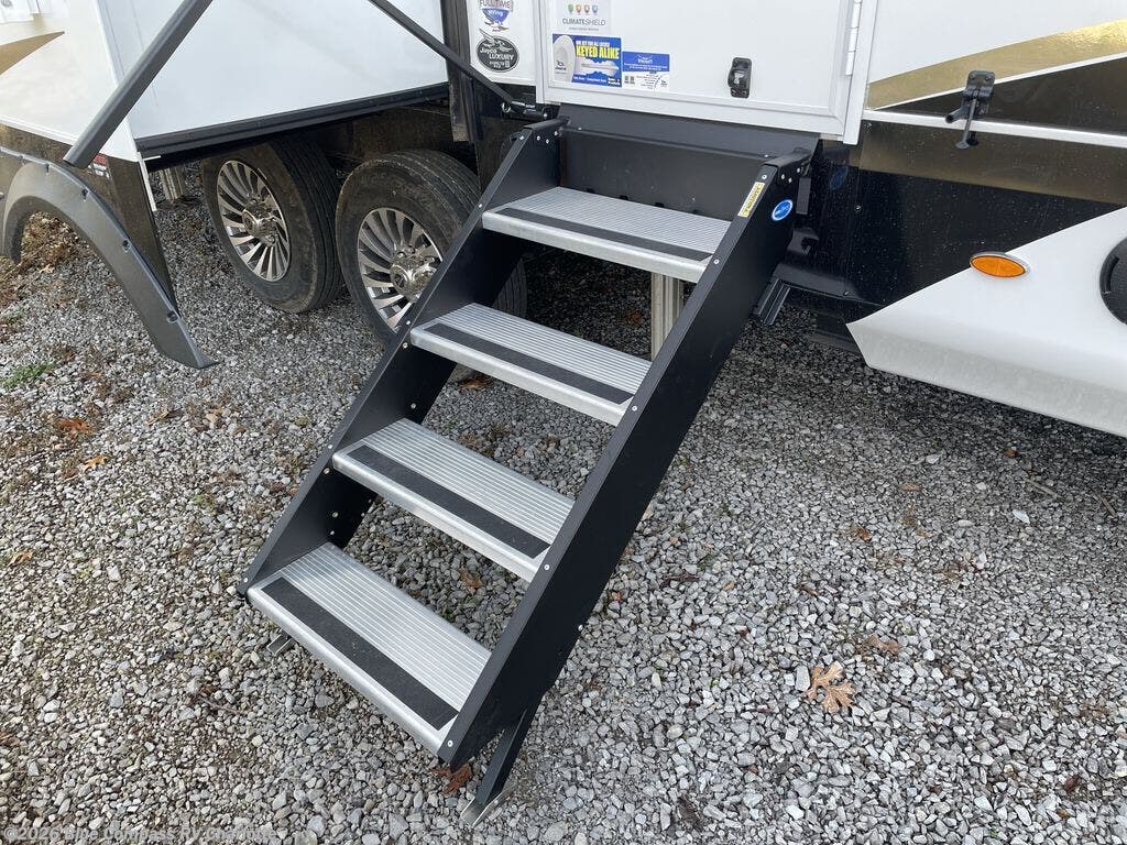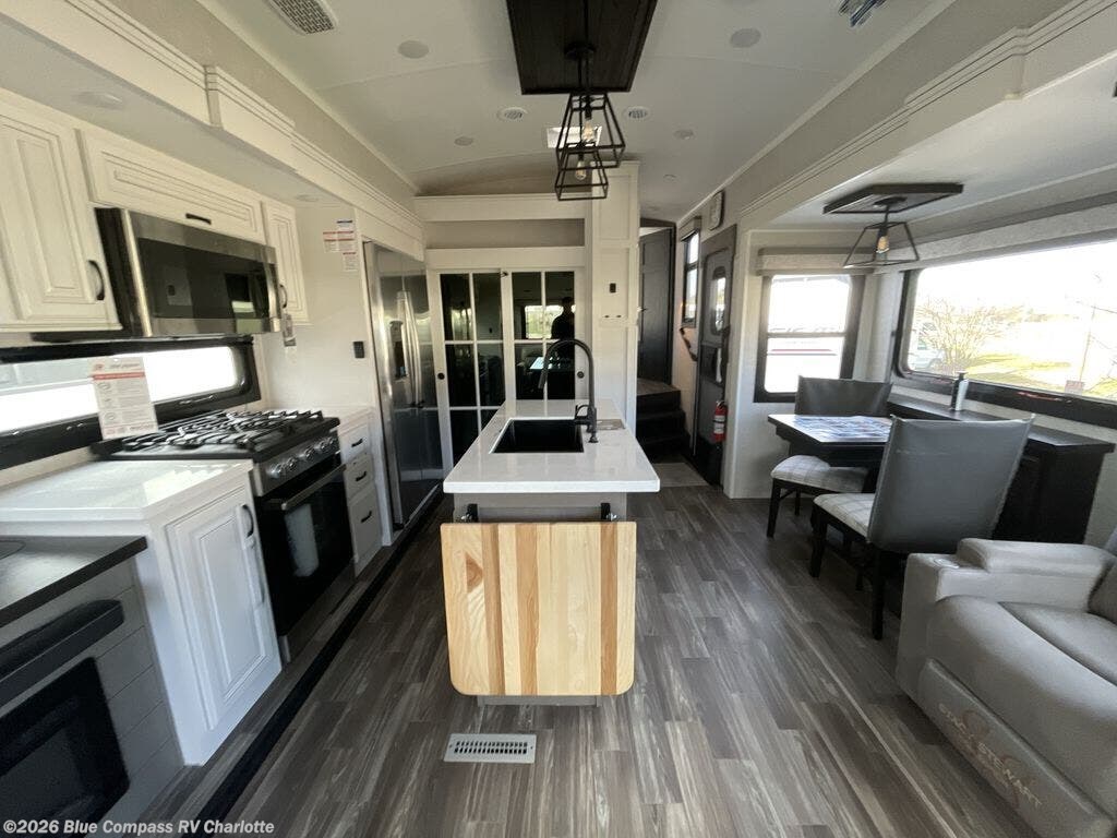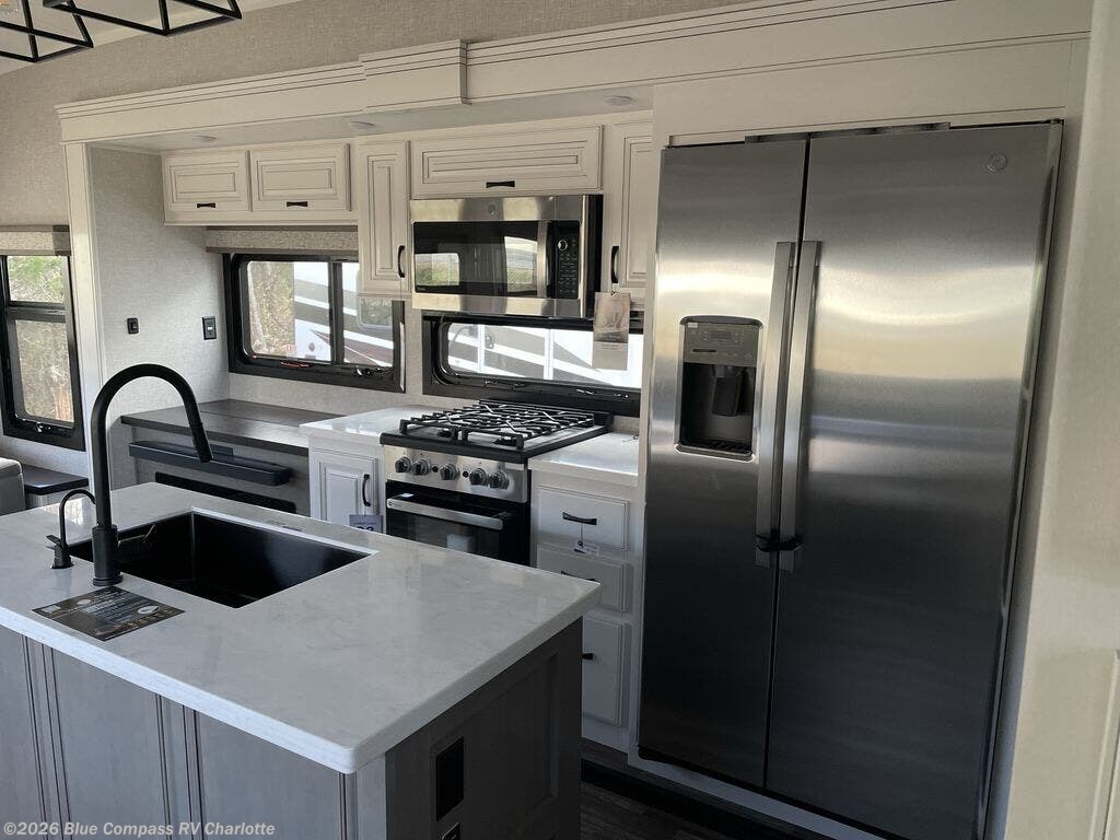 Whether you want to live in this fifth wheel or travel for long periods at a time, you will enjoy the spacious main living and kitchen area with dual slide outs as well as the bedroom with a slide out king bed. You will also find drawers with hamper and prepped space for a washer/dryer option, and a flip-top dresser with 32" TV. Easily get cleaned up in the full bathroom which also has linen storage. The cook will have a residential refrigerator to store all the cold items and beverages, a kitchen island, a pantry and a residential 24" stove. The 4K Smart LED HDTV with fully digital HDMI output and home entertainment system with subwoofer and fireplace below will provide a cozy place to watch your shows while relaxing on the theater seats, the tri-fold sofa, or the roll-top dinette table.