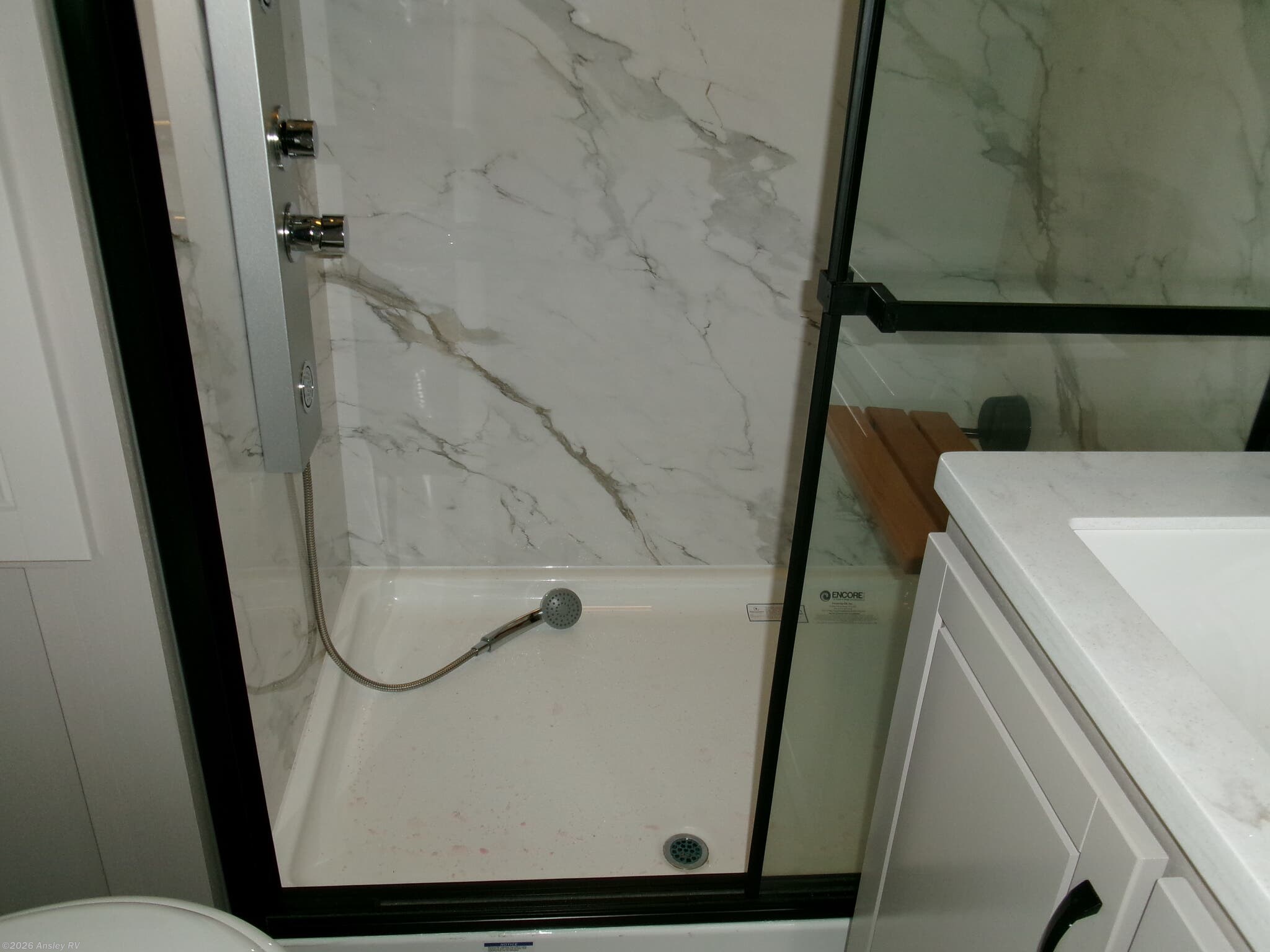 - Residential walk-in shower with shampoo/soap holder and teak seat