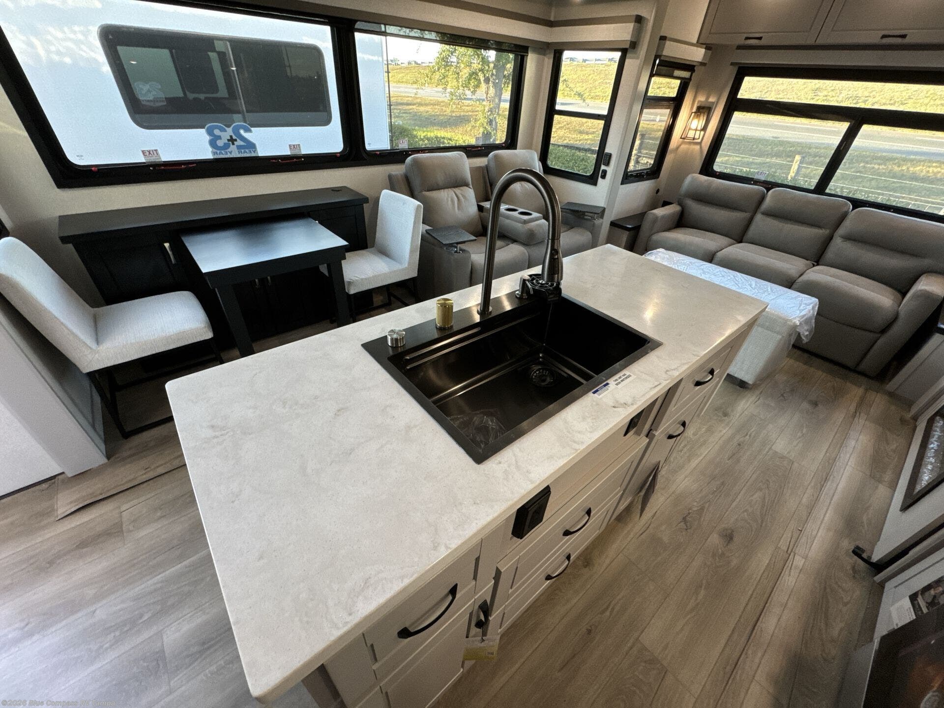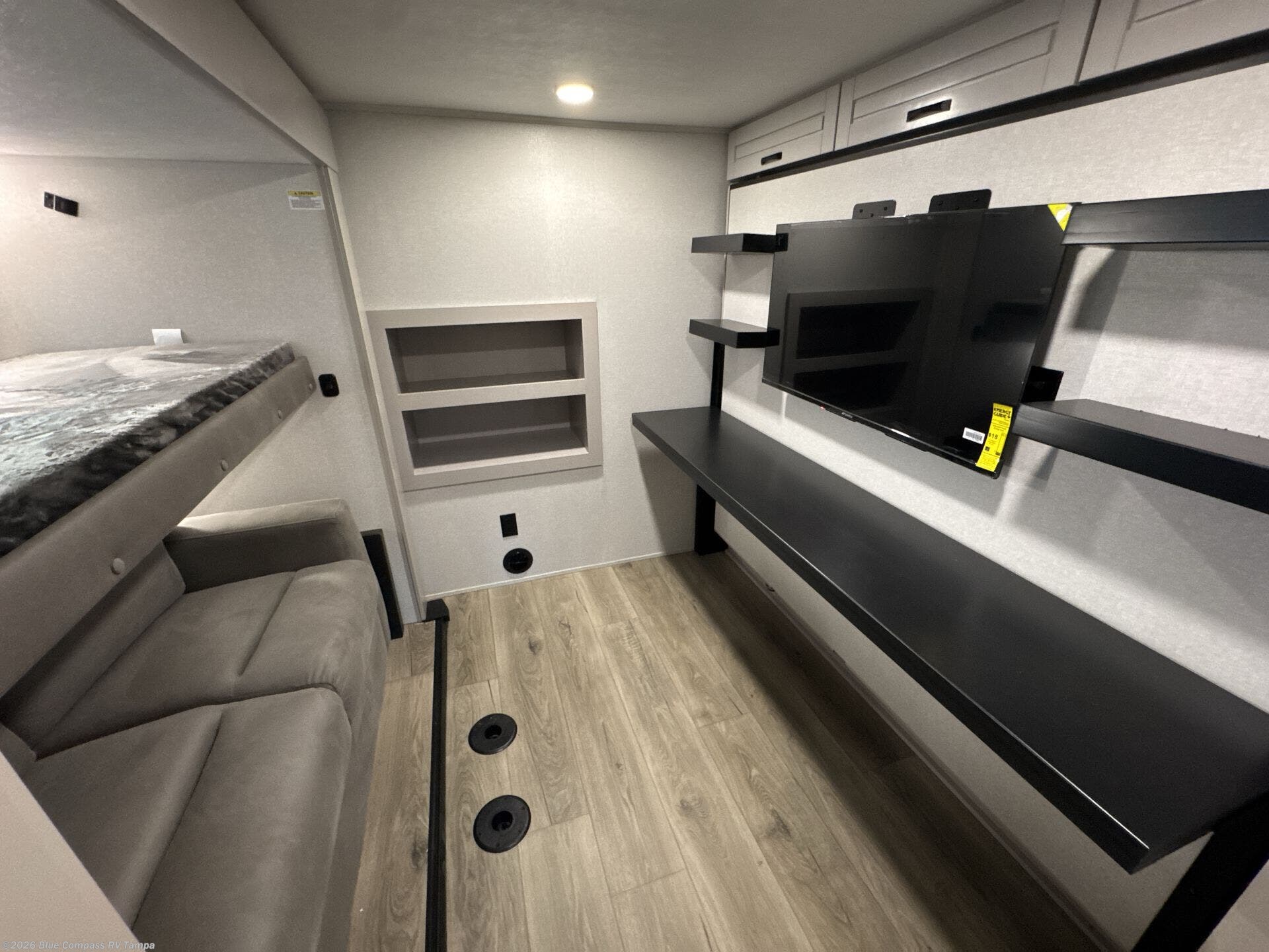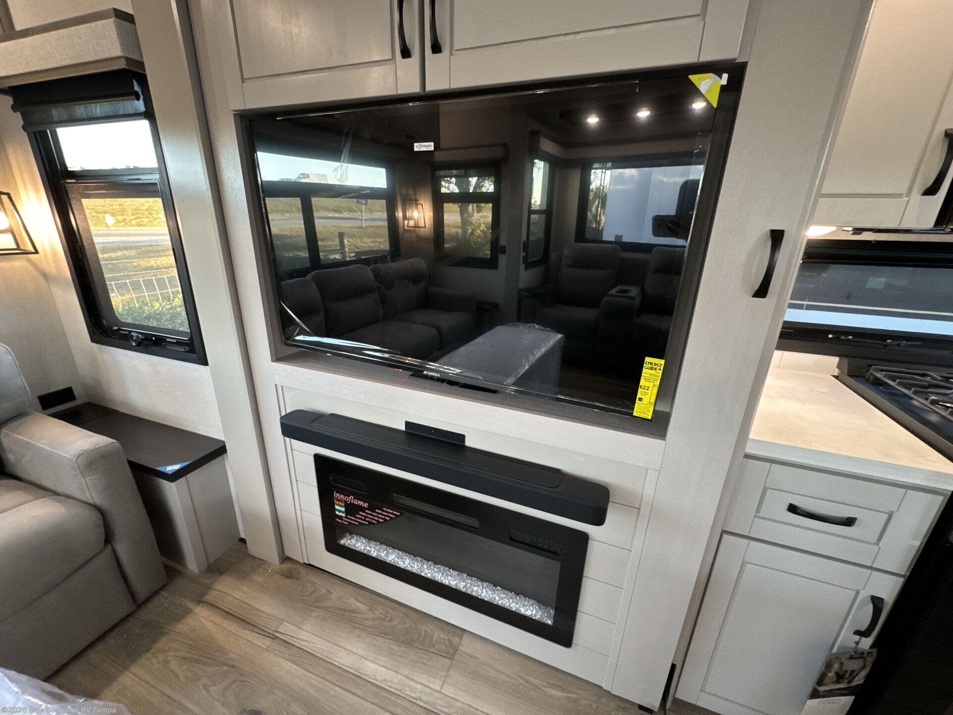 You can work from anywhere with this fifth wheel thanks to the middle bonus room that offers a desk with TV above, a tri-fold sofa with removable table, a flip-up bunk and a closet. This multi-use room works for just about anything including an extra living area and bunkhouse. The shoe storage under the interior steps, the linen cabinet in the full bathroom, the walk-in closet in the bedroom, and the overhead cabinets plus exterior storage allows you to bring whatever you want. Enjoy cooking in the kitchen that provides an island with a flip-up butcher block, a residential refrigerator, a pantry, and everything you need to keep everyone fed. The theater seats, the tri-fold sofa and the free standing table without a pedestal are great places to sit while watching the 50" Smart LED HDTV with fully digital HDMI output and home entertainment system with subwoofer, plus there is a fireplace below for those chilly evenings.