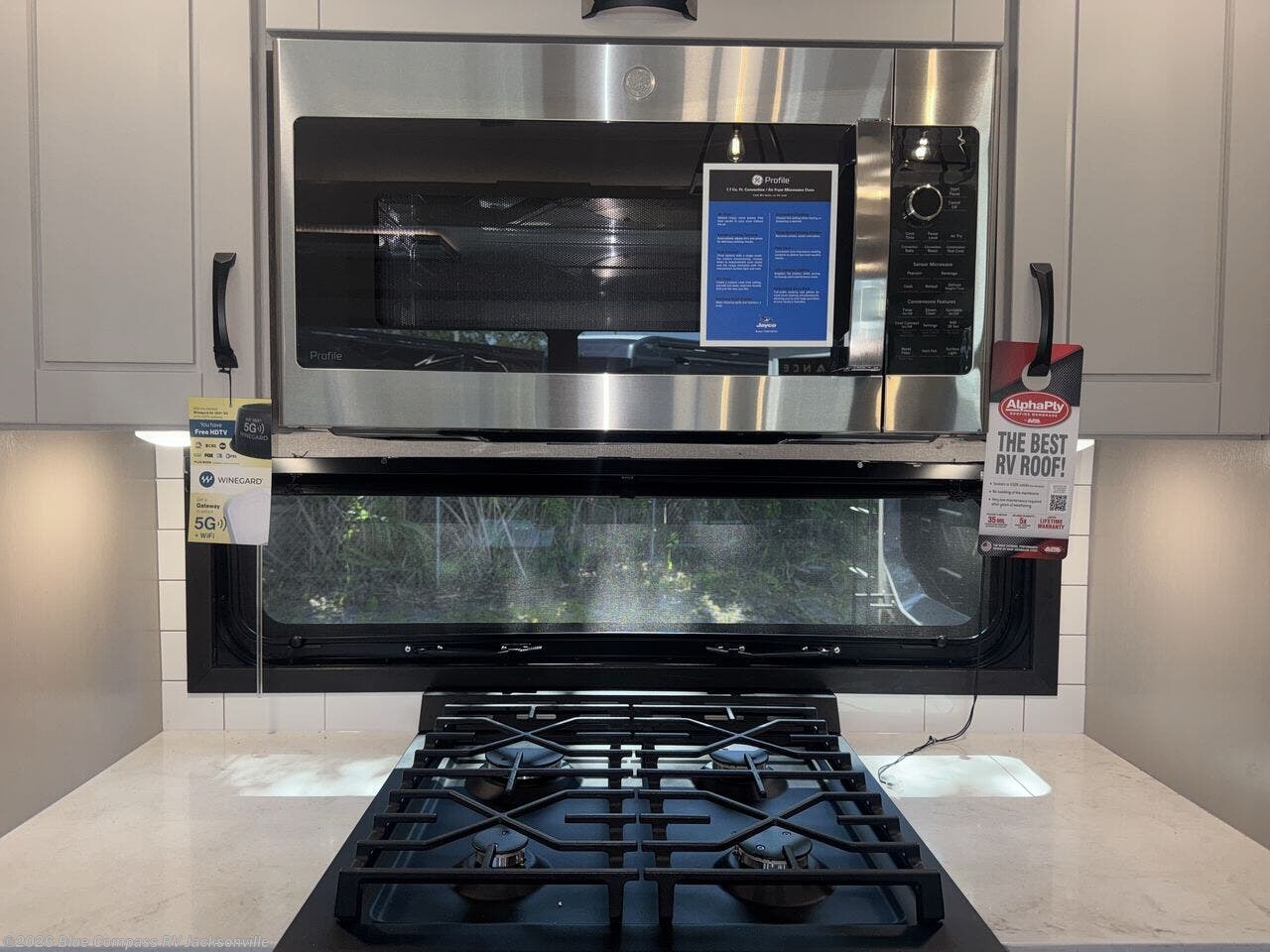 You can work from anywhere with this fifth wheel thanks to the middle bonus room that offers a desk with TV above, a tri-fold sofa with removable table, a flip-up bunk and a closet. This multi-use room works for just about anything including an extra living area and bunkhouse. The shoe storage under the interior steps, the linen cabinet in the full bathroom, the walk-in closet in the bedroom, and the overhead cabinets plus exterior storage allows you to bring whatever you want. Enjoy cooking in the kitchen that provides an island with a flip-up butcher block, a residential refrigerator, a pantry, and everything you need to keep everyone fed. The theater seats, the tri-fold sofa and the free standing table without a pedestal are great places to sit while watching the 50" Smart LED HDTV with fully digital HDMI output and home entertainment system with subwoofer, plus there is a fireplace below for those chilly evenings.