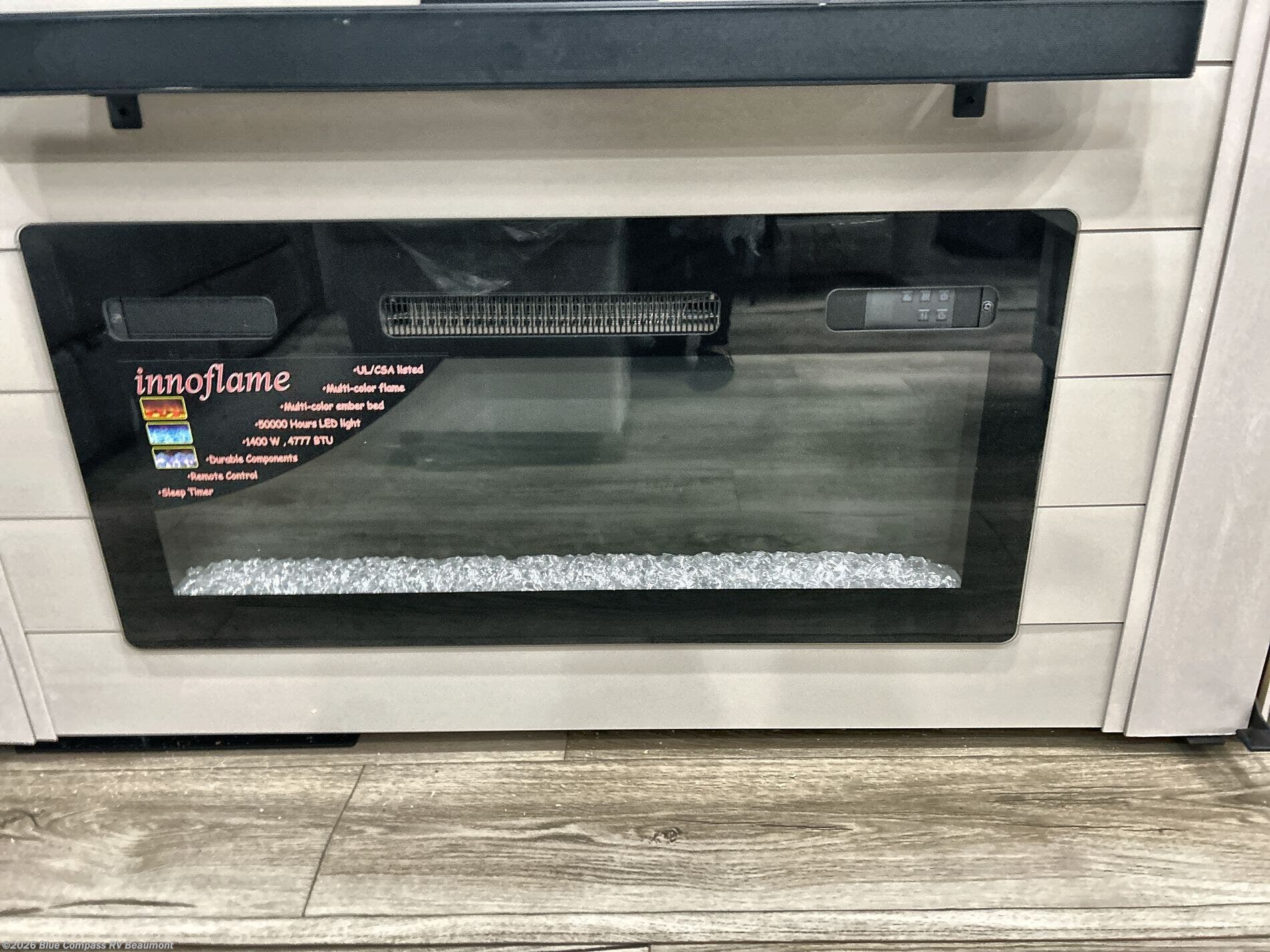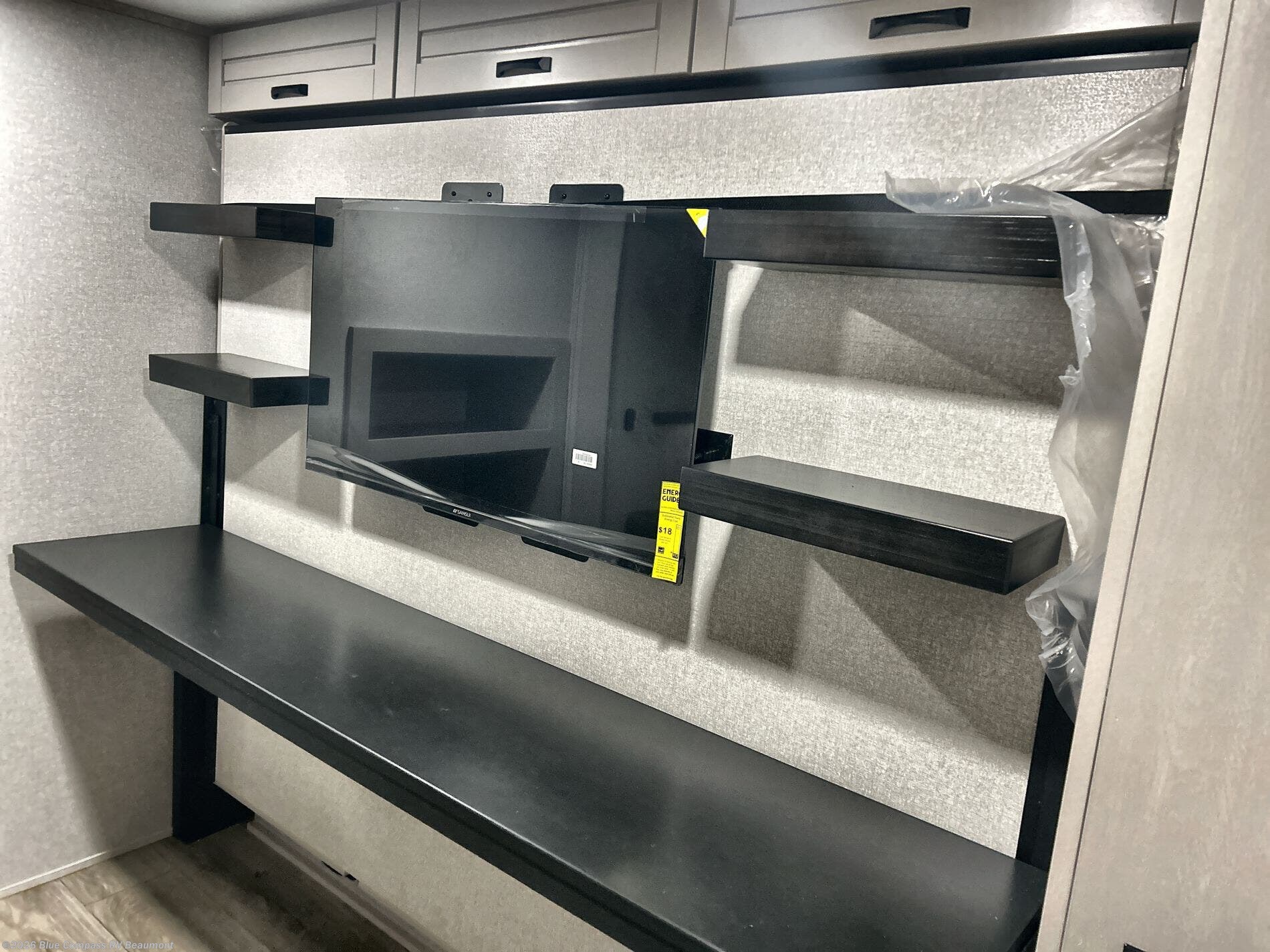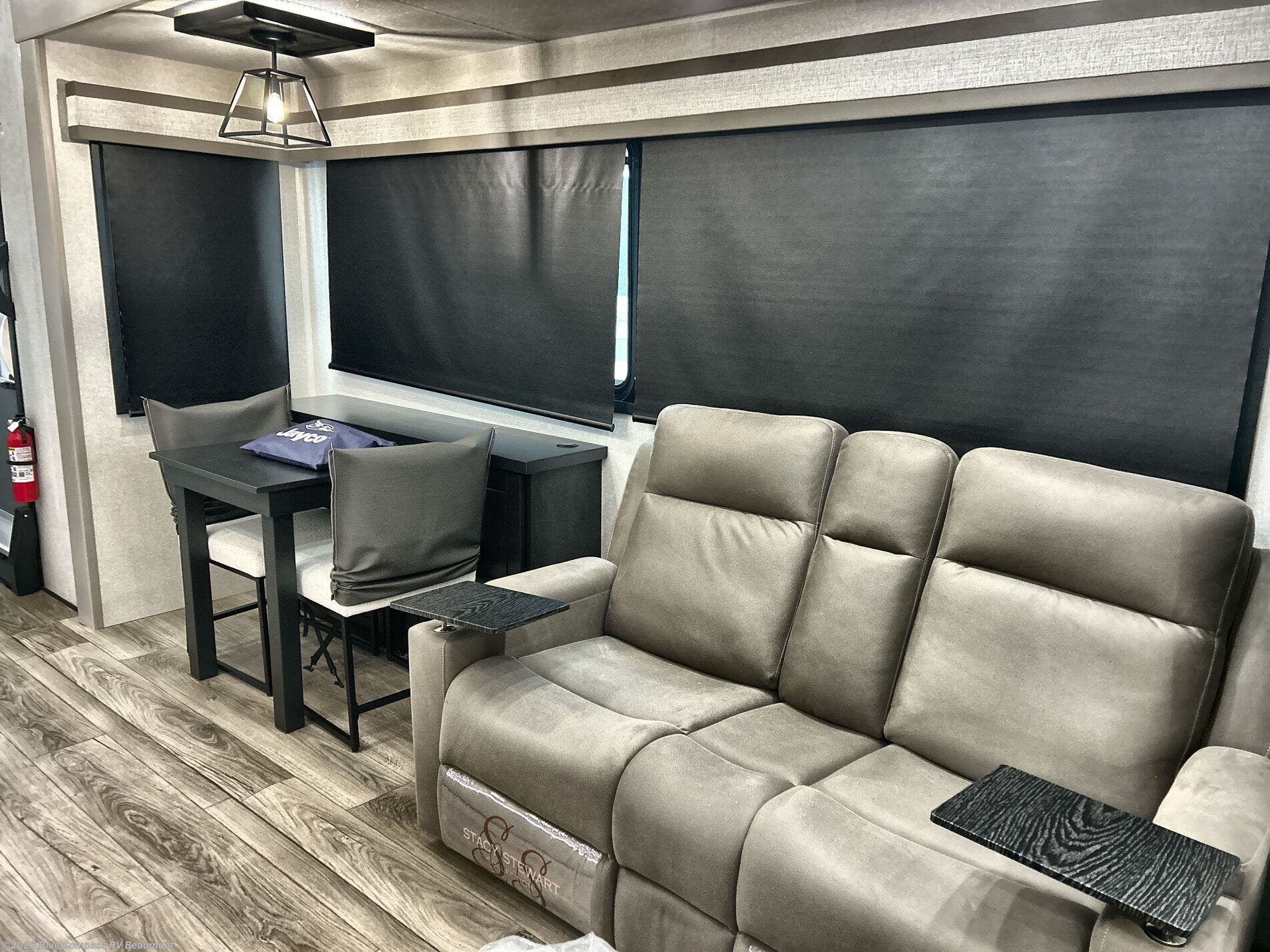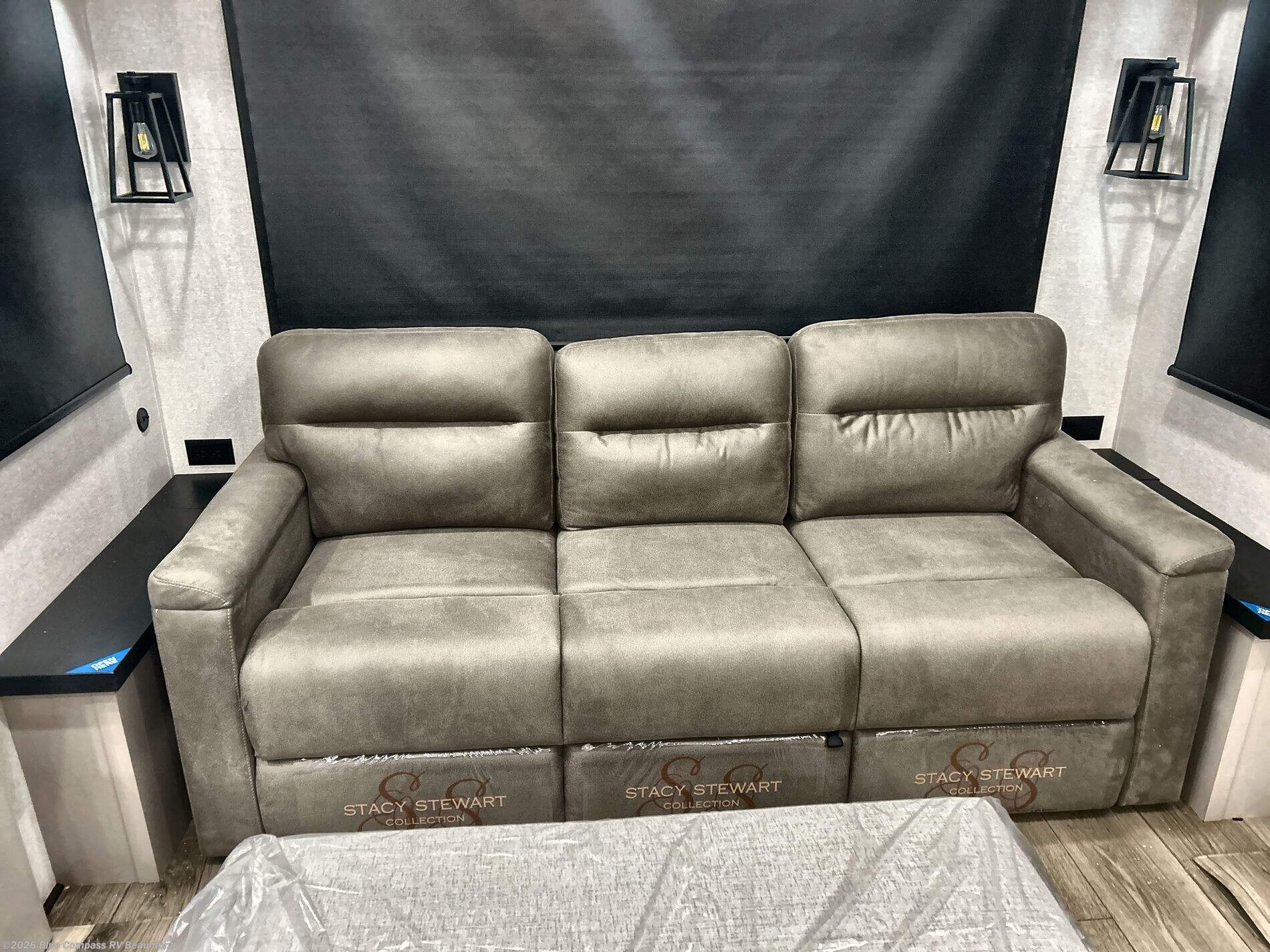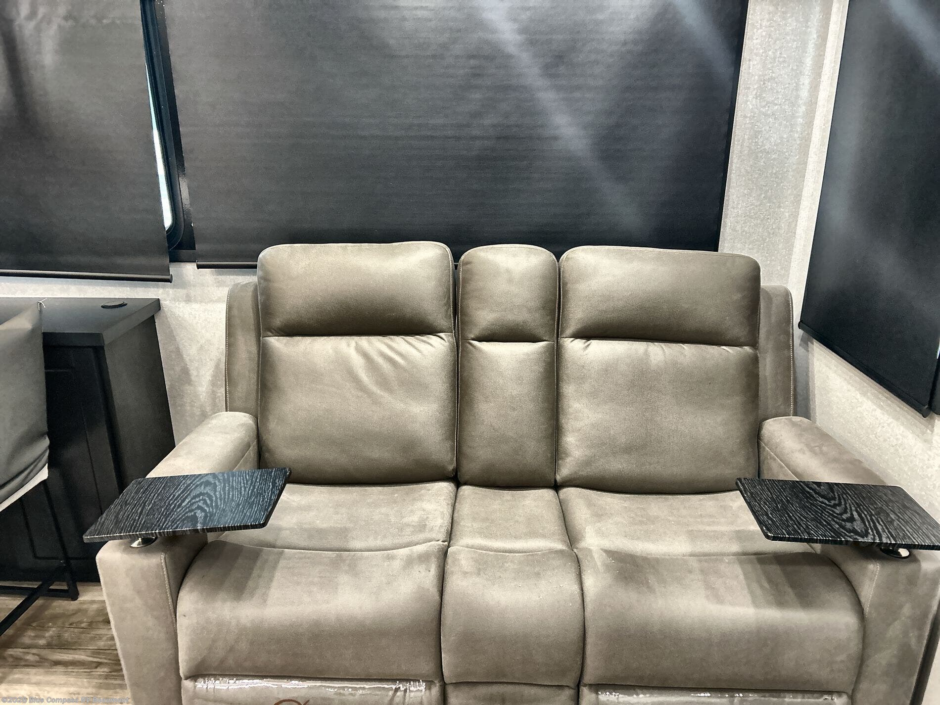 You can work from anywhere with this fifth wheel thanks to the middle bonus room that offers a desk with TV above, a tri-fold sofa with removable table, a flip-up bunk and a closet. This multi-use room works for just about anything including an extra living area and bunkhouse. The shoe storage under the interior steps, the linen cabinet in the full bathroom, the walk-in closet in the bedroom, and the overhead cabinets plus exterior storage allows you to bring whatever you want. Enjoy cooking in the kitchen that provides an island with a flip-up butcher block, a residential refrigerator, a pantry, and everything you need to keep everyone fed. The theater seats, the tri-fold sofa and the free standing table without a pedestal are great places to sit while watching the 50" Smart LED HDTV with fully digital HDMI output and home entertainment system with subwoofer, plus there is a fireplace below for those chilly evenings.