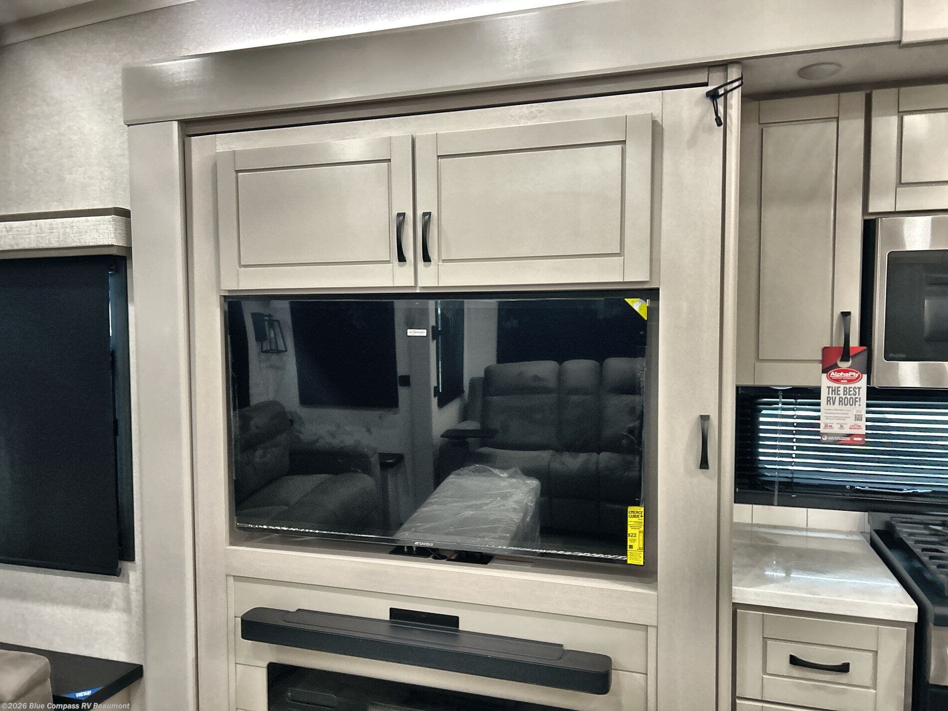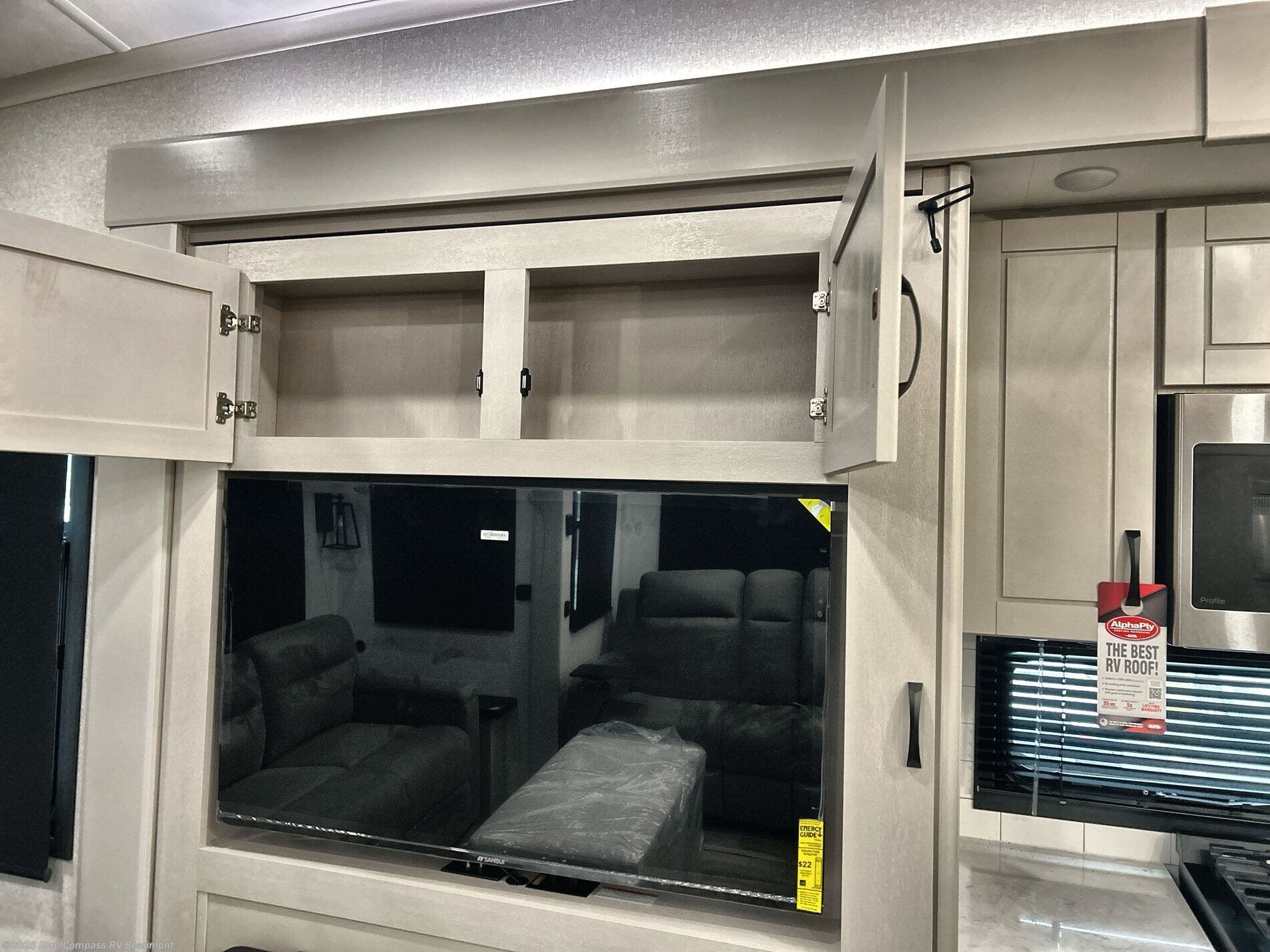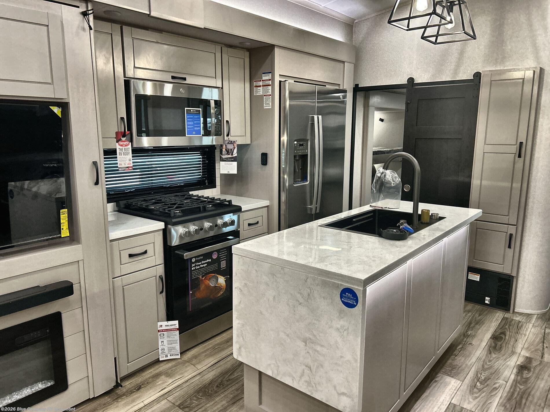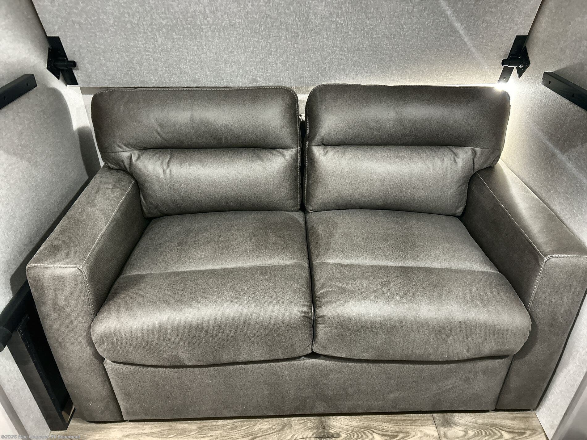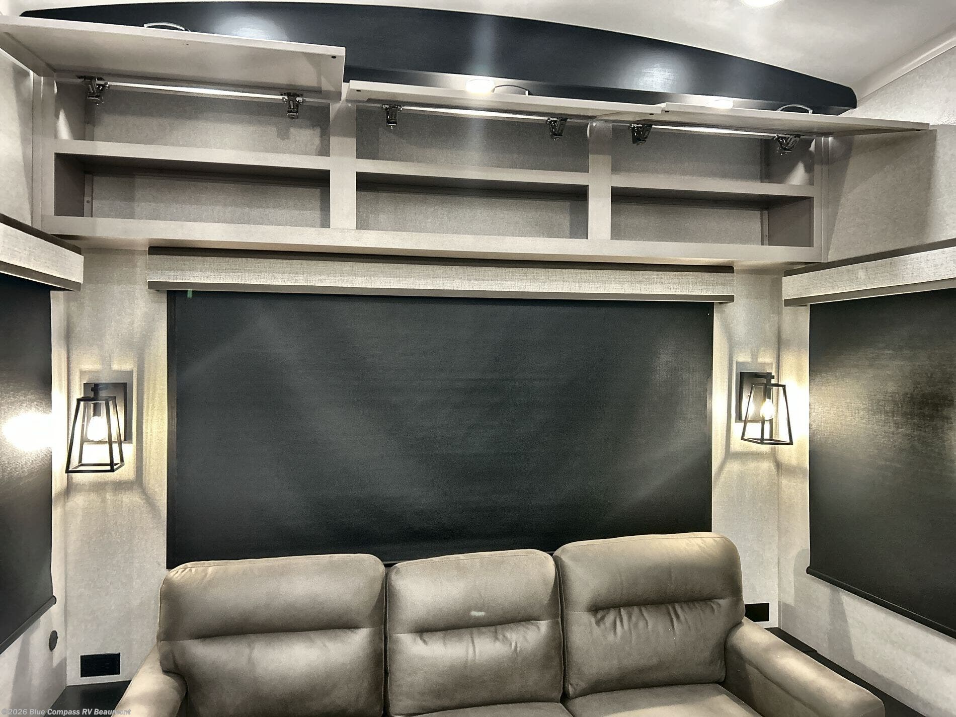 You can work from anywhere with this fifth wheel thanks to the middle bonus room that offers a desk with TV above, a tri-fold sofa with removable table, a flip-up bunk and a closet. This multi-use room works for just about anything including an extra living area and bunkhouse. The shoe storage under the interior steps, the linen cabinet in the full bathroom, the walk-in closet in the bedroom, and the overhead cabinets plus exterior storage allows you to bring whatever you want. Enjoy cooking in the kitchen that provides an island with a flip-up butcher block, a residential refrigerator, a pantry, and everything you need to keep everyone fed. The theater seats, the tri-fold sofa and the free standing table without a pedestal are great places to sit while watching the 50" Smart LED HDTV with fully digital HDMI output and home entertainment system with subwoofer, plus there is a fireplace below for those chilly evenings.