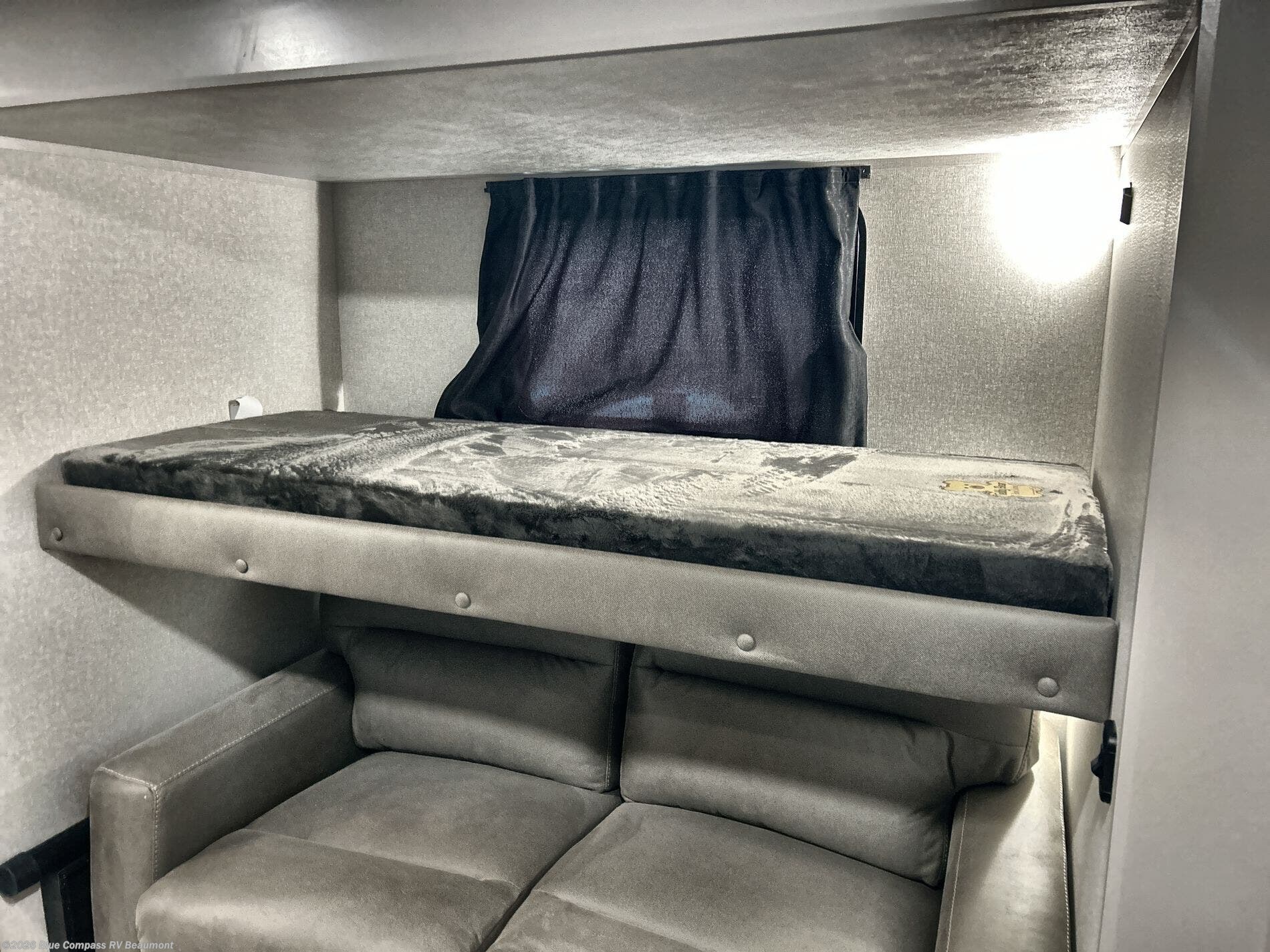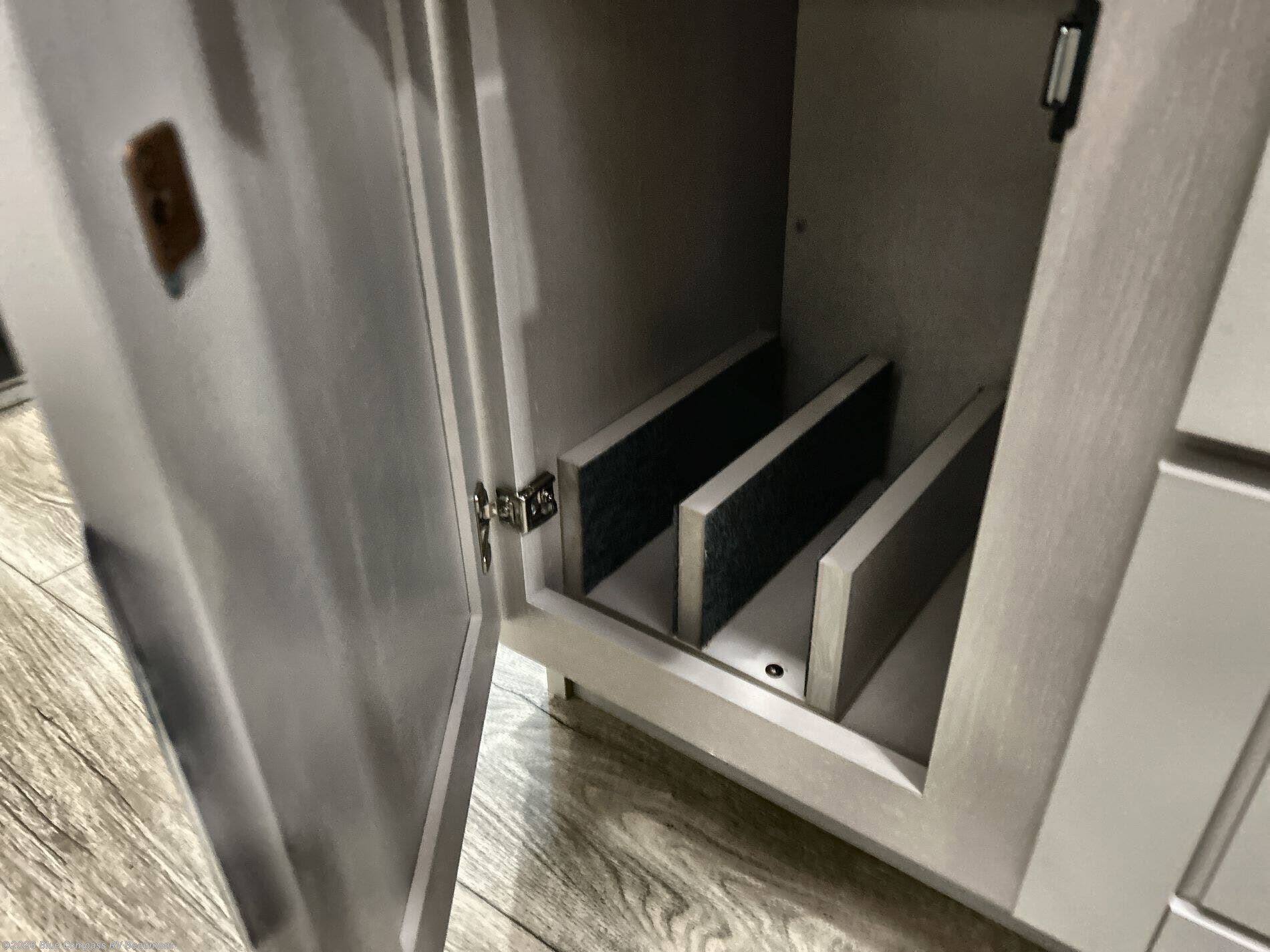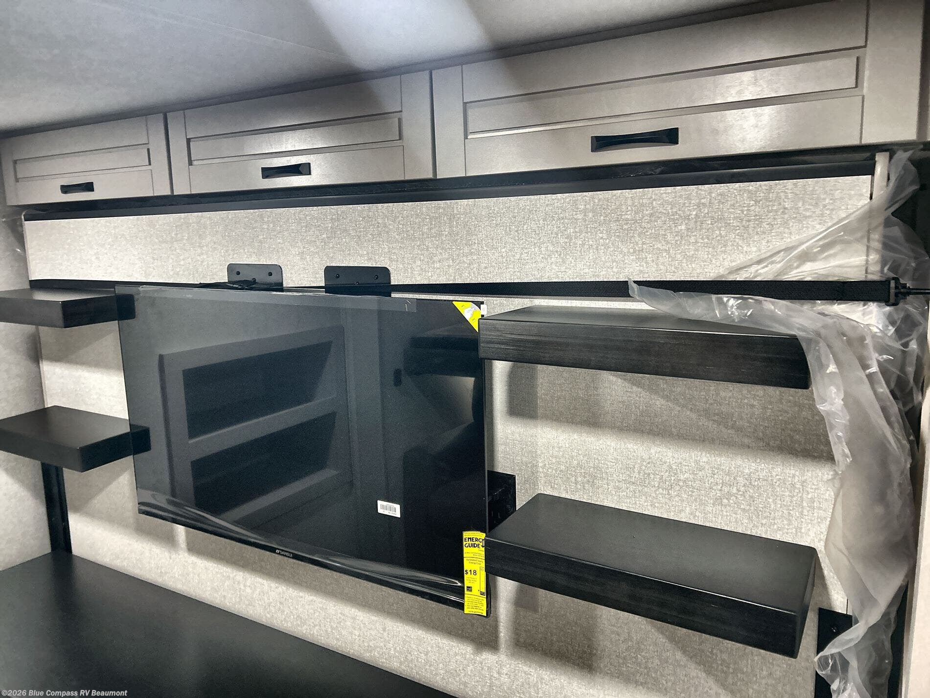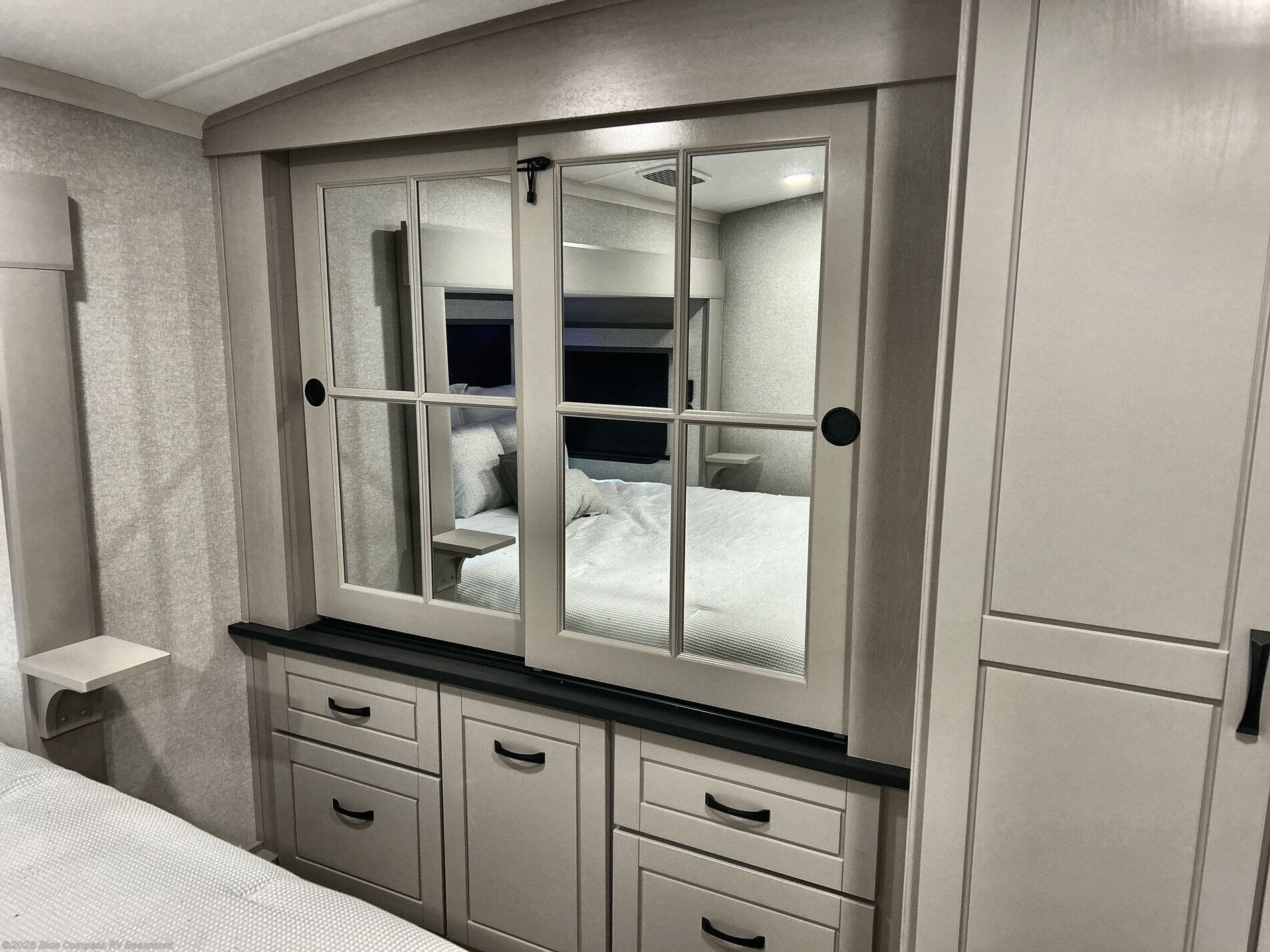You can work from anywhere with this fifth wheel thanks to the middle bonus room that offers a desk with TV above, a tri-fold sofa with removable table, a flip-up bunk and a closet. This multi-use room works for just about anything including an extra living area and bunkhouse. The shoe storage under the interior steps, the linen cabinet in the full bathroom, the walk-in closet in the bedroom, and the overhead cabinets plus exterior storage allows you to bring whatever you want. Enjoy cooking in the kitchen that provides an island with a flip-up butcher block, a residential refrigerator, a pantry, and everything you need to keep everyone fed. The theater seats, the tri-fold sofa and the free standing table without a pedestal are great places to sit while watching the 50" Smart LED HDTV with fully digital HDMI output and home entertainment system with subwoofer, plus there is a fireplace below for those chilly evenings.