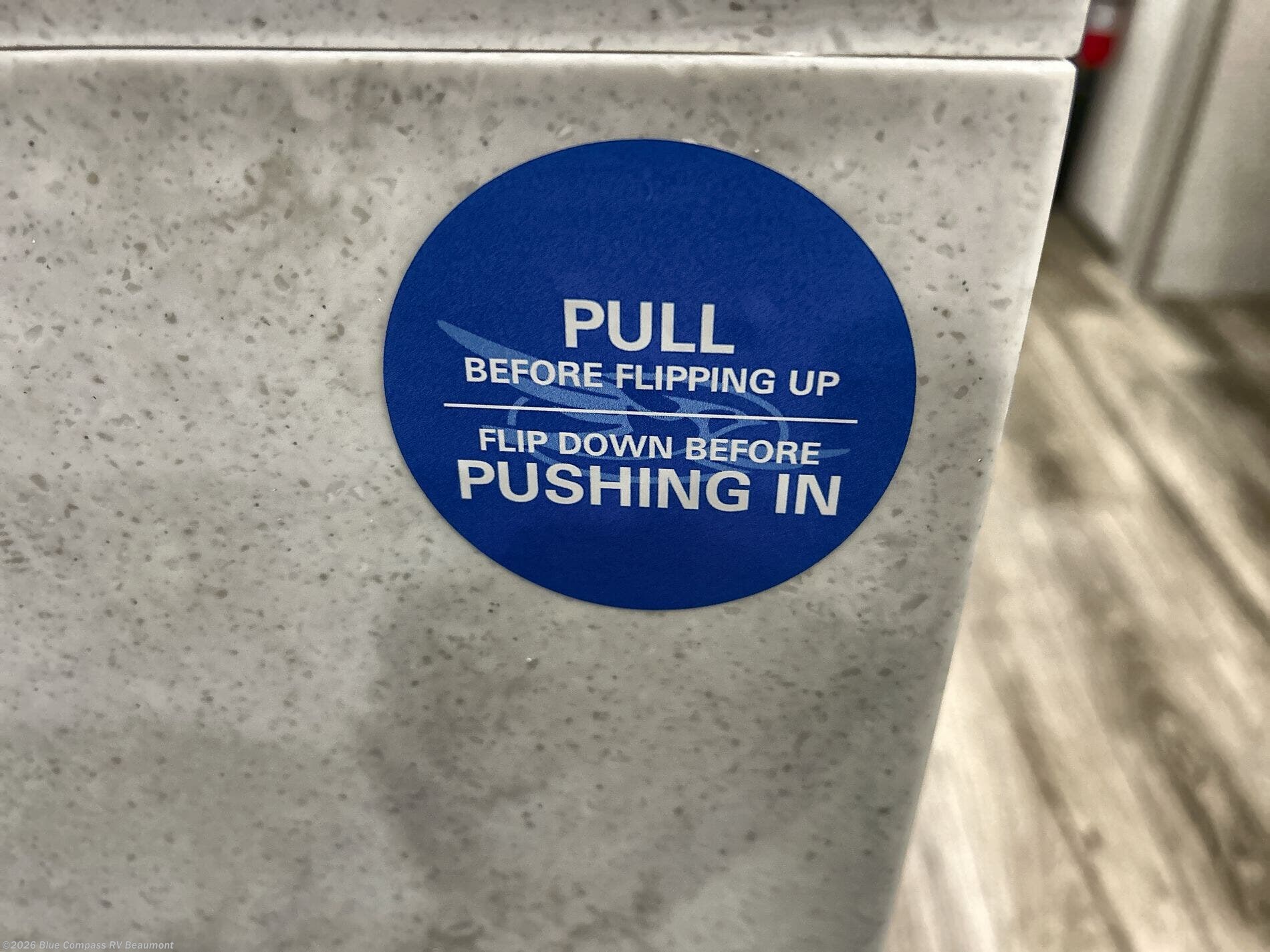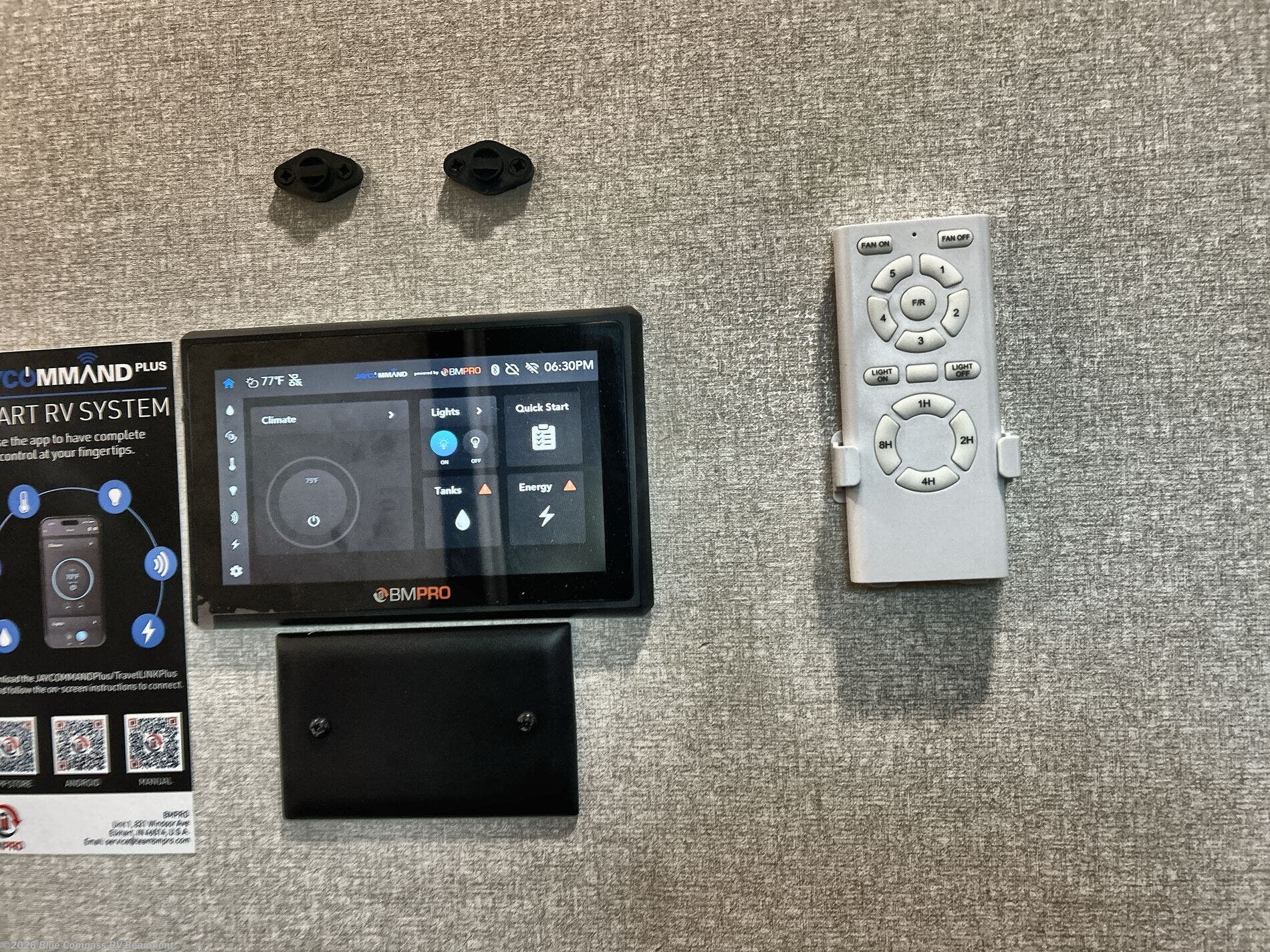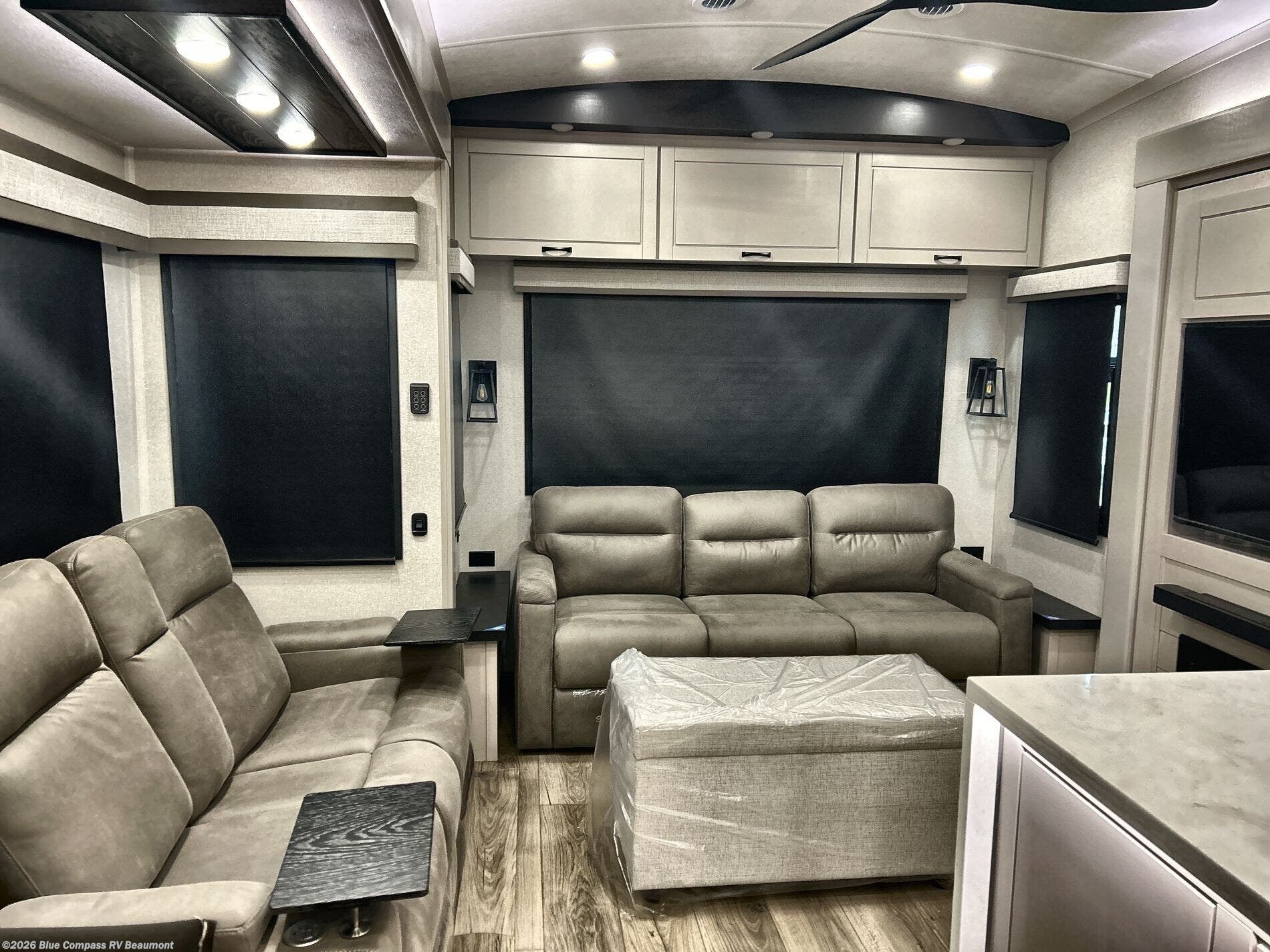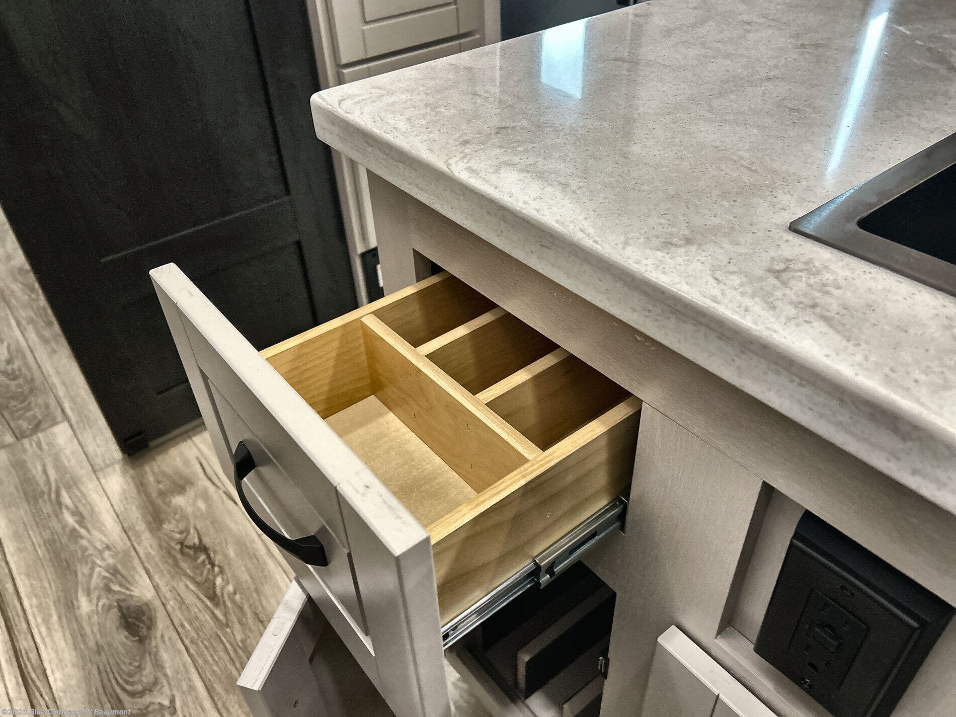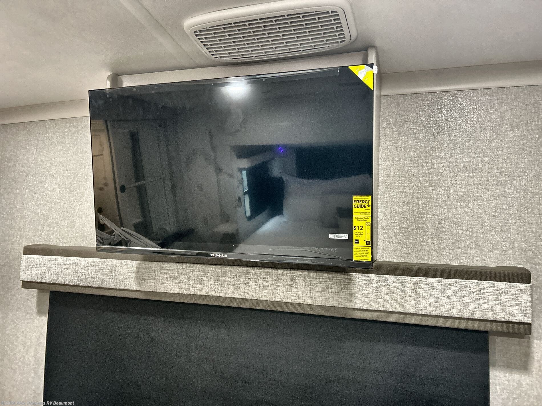 You can work from anywhere with this fifth wheel thanks to the middle bonus room that offers a desk with TV above, a tri-fold sofa with removable table, a flip-up bunk and a closet. This multi-use room works for just about anything including an extra living area and bunkhouse. The shoe storage under the interior steps, the linen cabinet in the full bathroom, the walk-in closet in the bedroom, and the overhead cabinets plus exterior storage allows you to bring whatever you want. Enjoy cooking in the kitchen that provides an island with a flip-up butcher block, a residential refrigerator, a pantry, and everything you need to keep everyone fed. The theater seats, the tri-fold sofa and the free standing table without a pedestal are great places to sit while watching the 50" Smart LED HDTV with fully digital HDMI output and home entertainment system with subwoofer, plus there is a fireplace below for those chilly evenings.