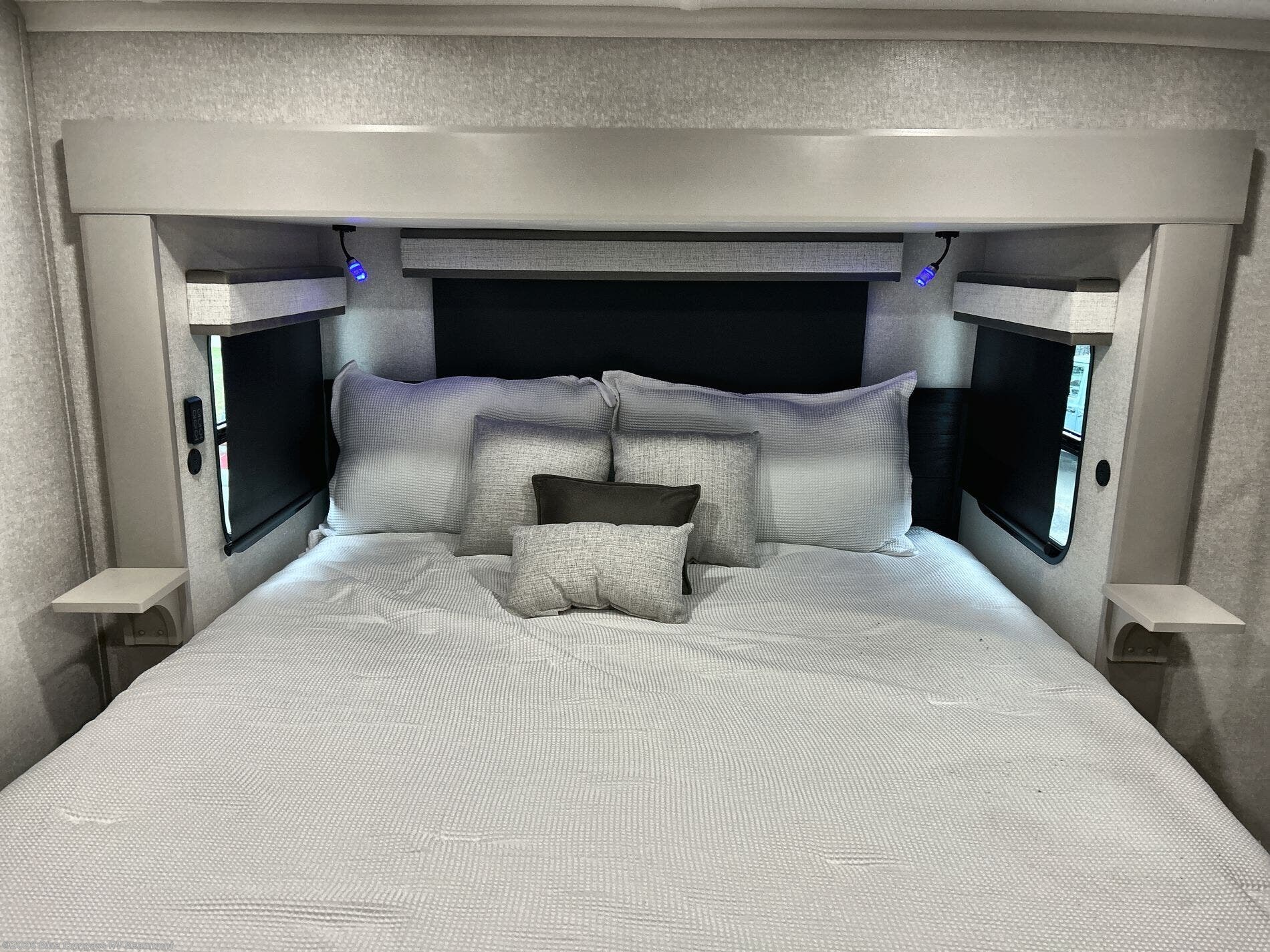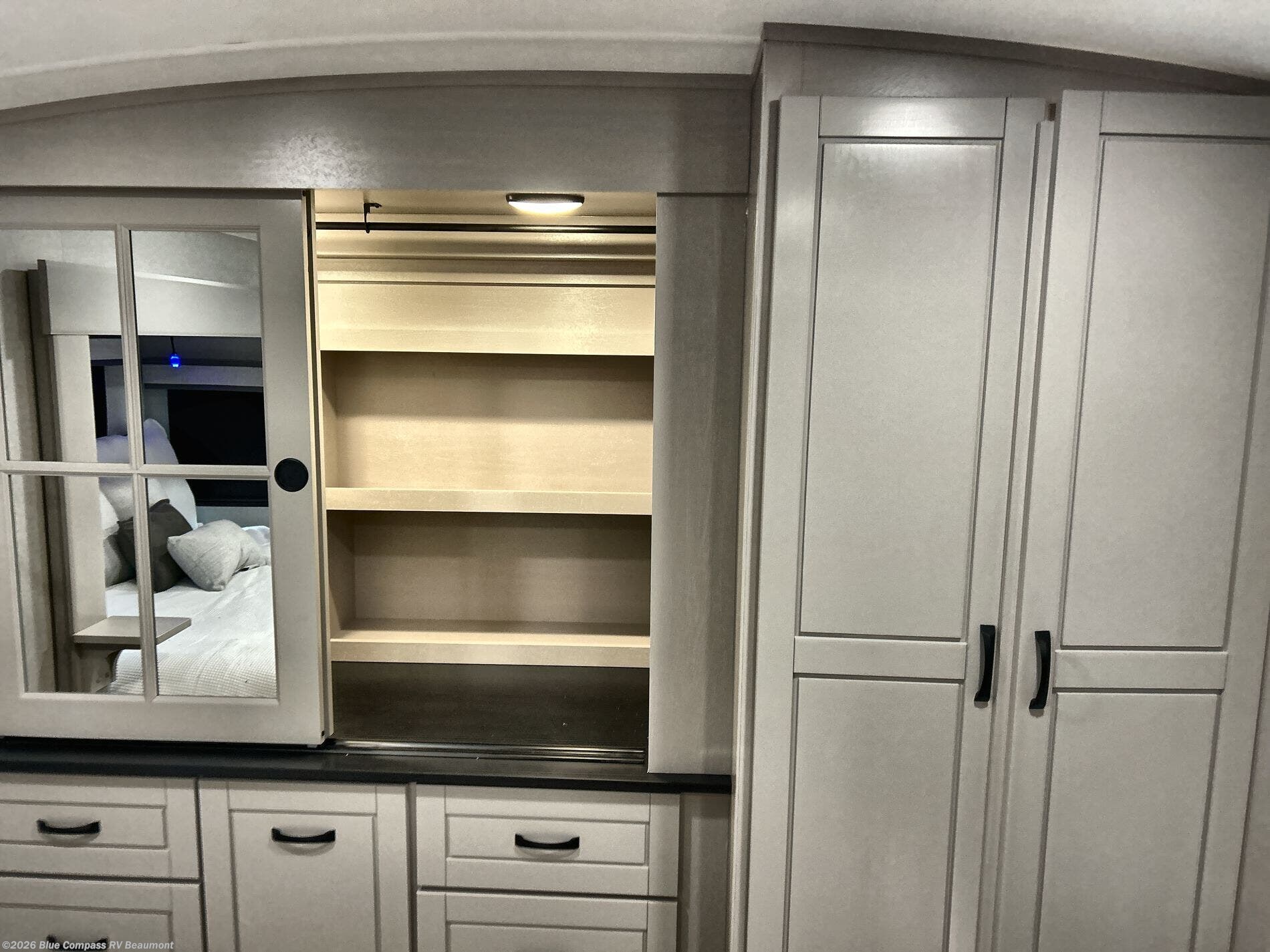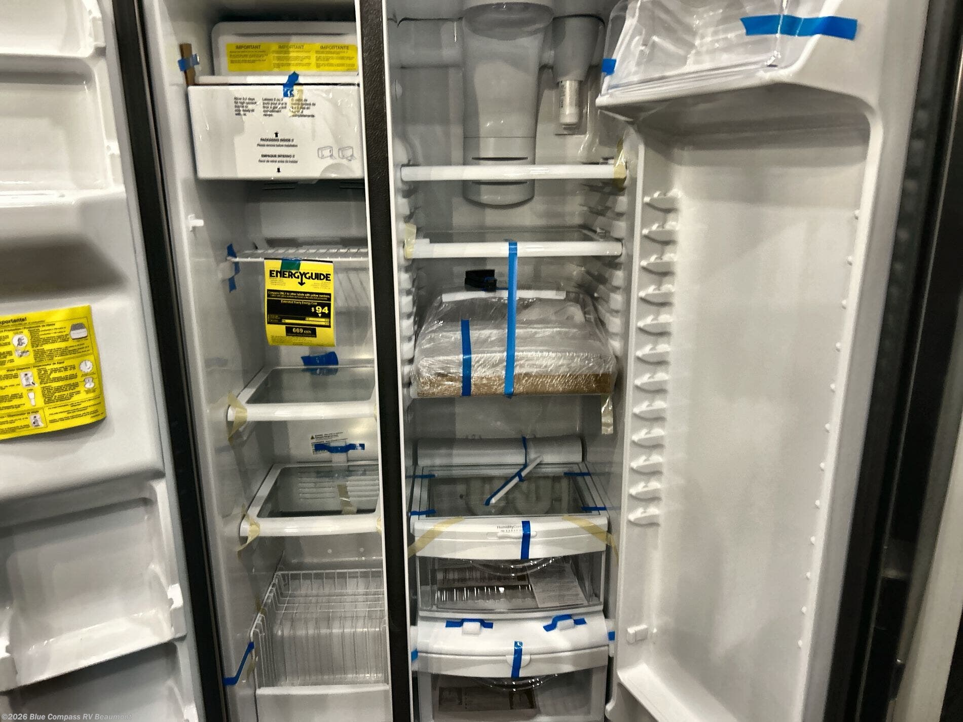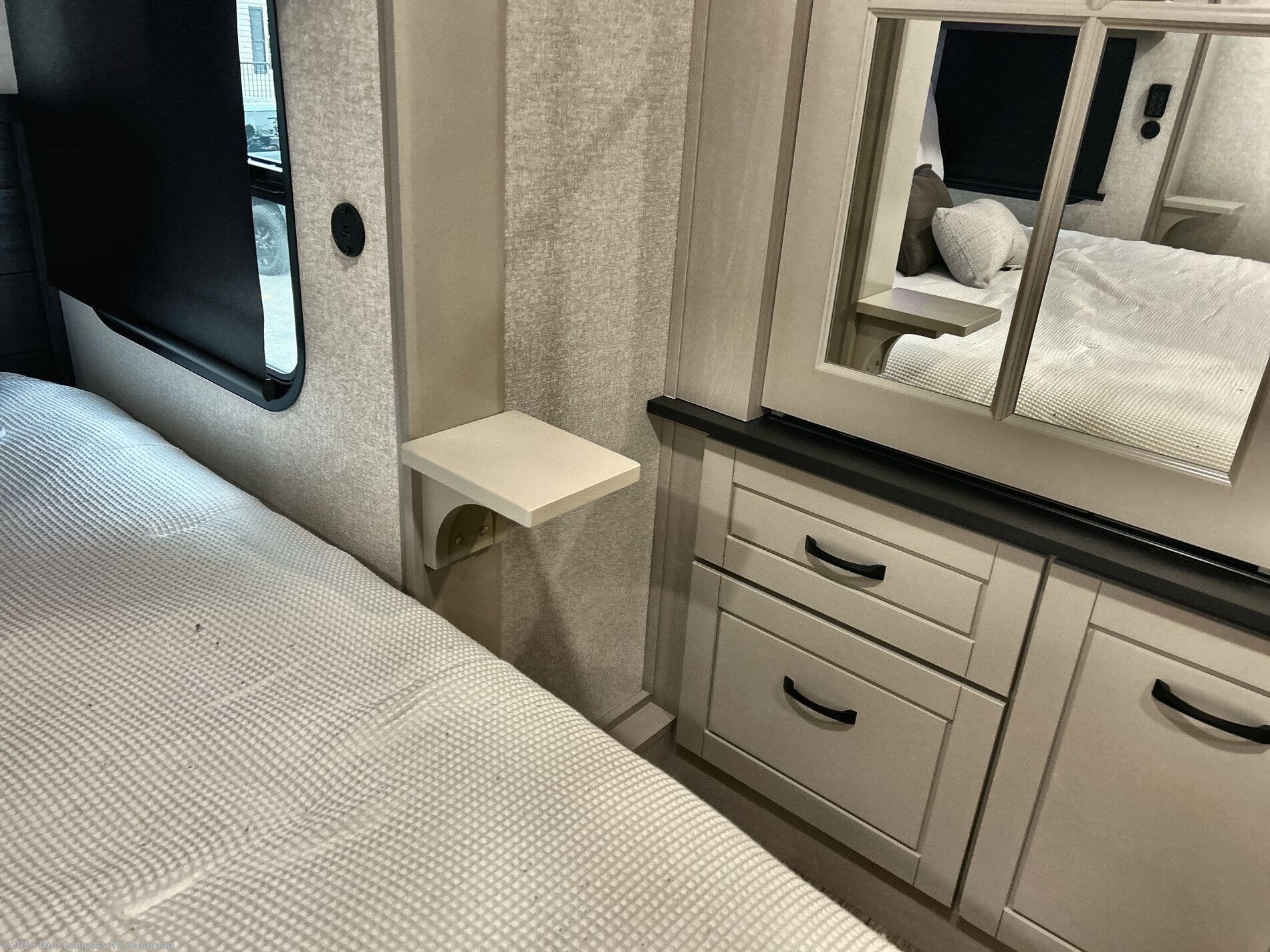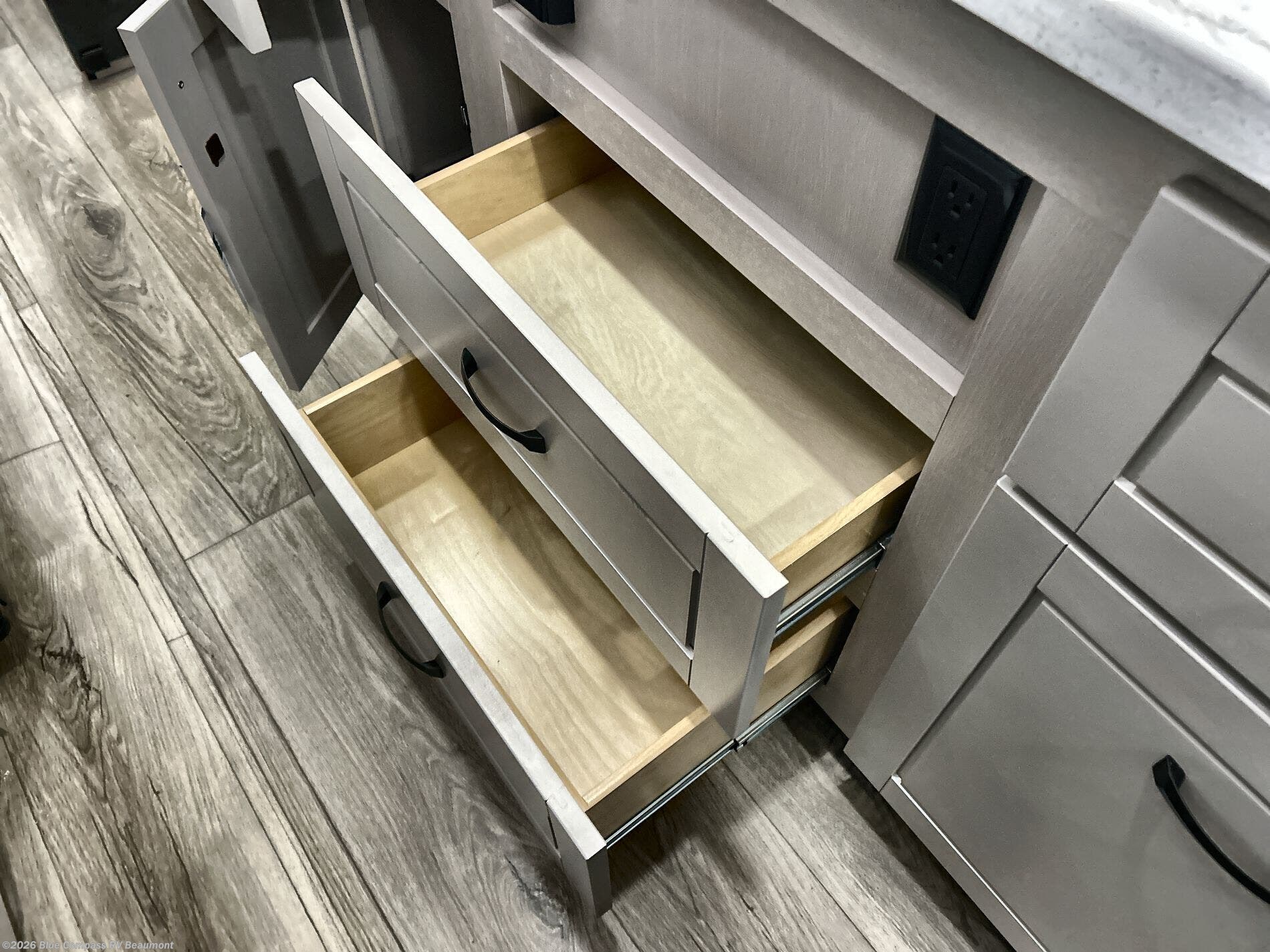 You can work from anywhere with this fifth wheel thanks to the middle bonus room that offers a desk with TV above, a tri-fold sofa with removable table, a flip-up bunk and a closet. This multi-use room works for just about anything including an extra living area and bunkhouse. The shoe storage under the interior steps, the linen cabinet in the full bathroom, the walk-in closet in the bedroom, and the overhead cabinets plus exterior storage allows you to bring whatever you want. Enjoy cooking in the kitchen that provides an island with a flip-up butcher block, a residential refrigerator, a pantry, and everything you need to keep everyone fed. The theater seats, the tri-fold sofa and the free standing table without a pedestal are great places to sit while watching the 50" Smart LED HDTV with fully digital HDMI output and home entertainment system with subwoofer, plus there is a fireplace below for those chilly evenings.