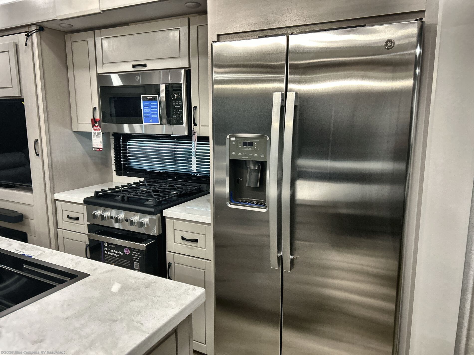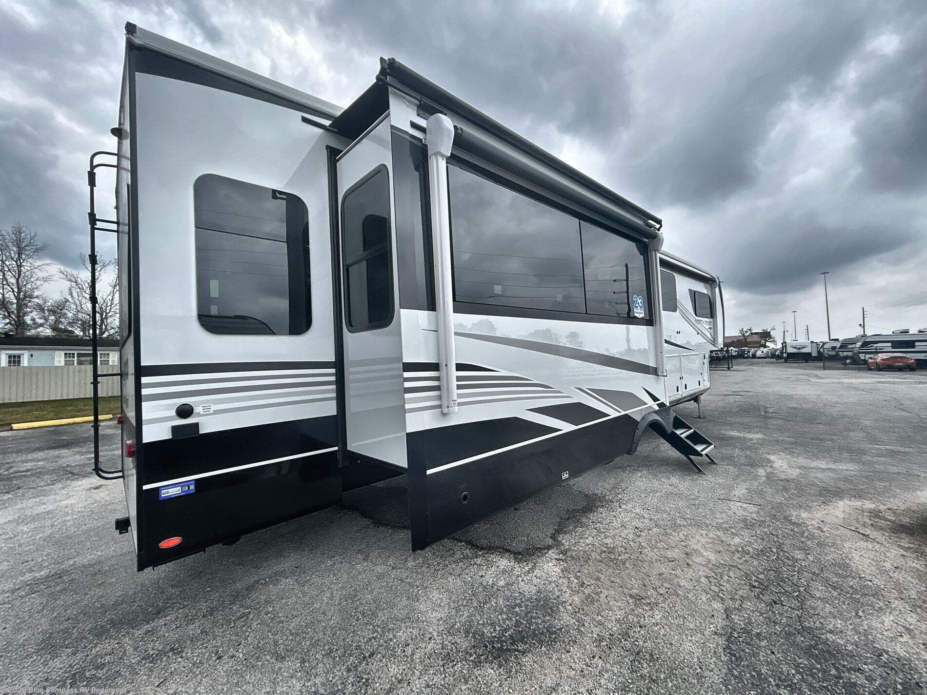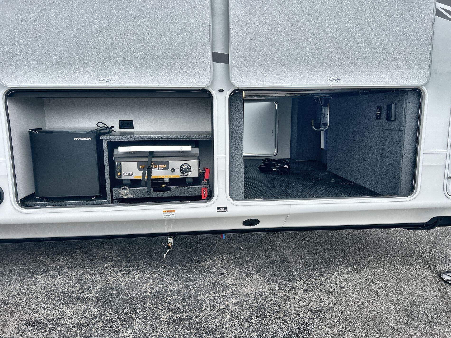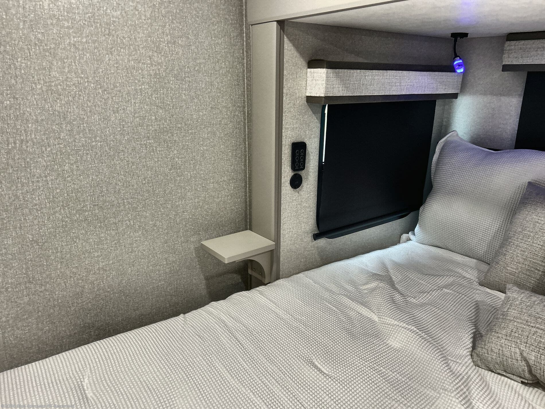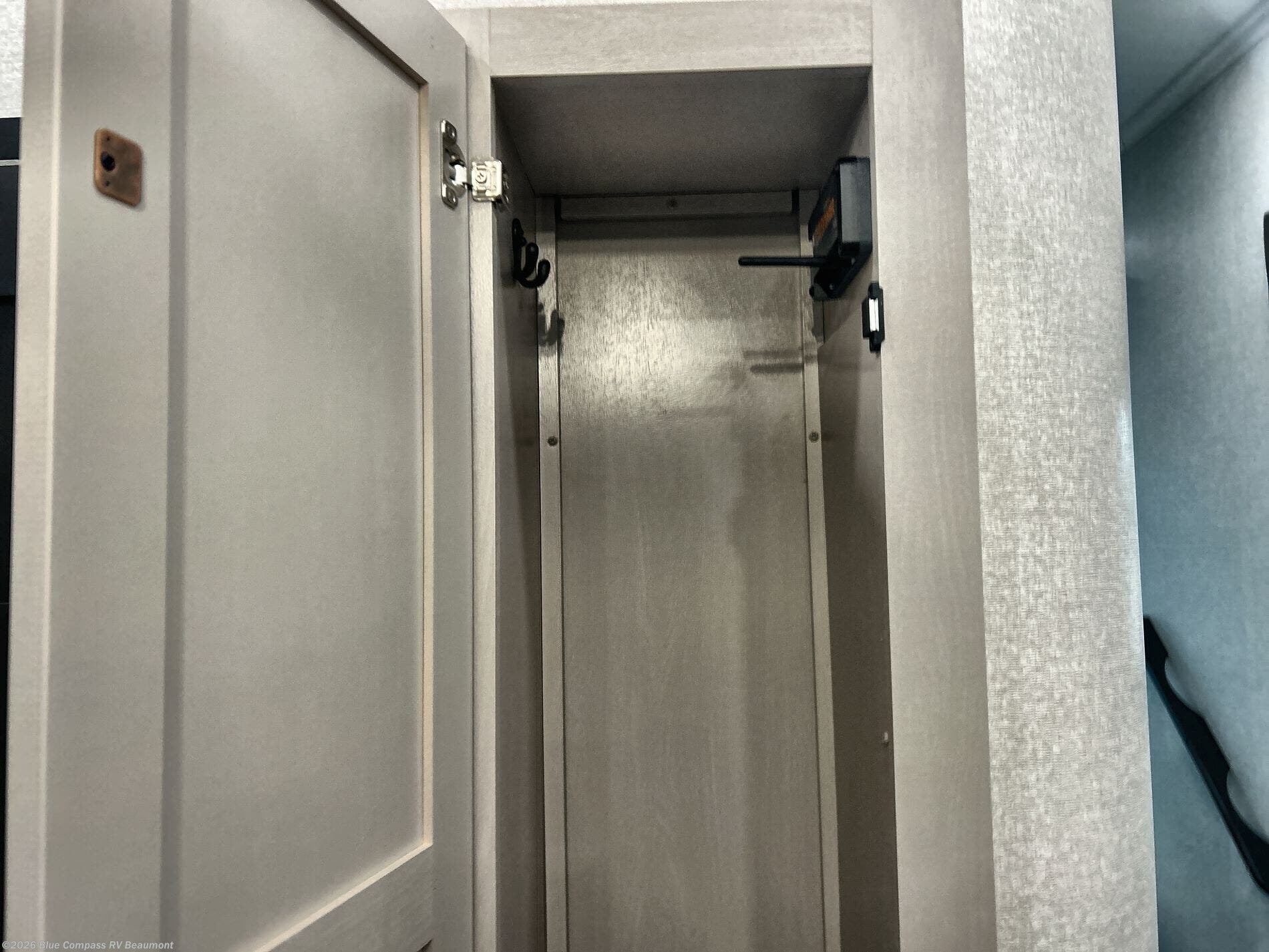 You can work from anywhere with this fifth wheel thanks to the middle bonus room that offers a desk with TV above, a tri-fold sofa with removable table, a flip-up bunk and a closet. This multi-use room works for just about anything including an extra living area and bunkhouse. The shoe storage under the interior steps, the linen cabinet in the full bathroom, the walk-in closet in the bedroom, and the overhead cabinets plus exterior storage allows you to bring whatever you want. Enjoy cooking in the kitchen that provides an island with a flip-up butcher block, a residential refrigerator, a pantry, and everything you need to keep everyone fed. The theater seats, the tri-fold sofa and the free standing table without a pedestal are great places to sit while watching the 50" Smart LED HDTV with fully digital HDMI output and home entertainment system with subwoofer, plus there is a fireplace below for those chilly evenings.