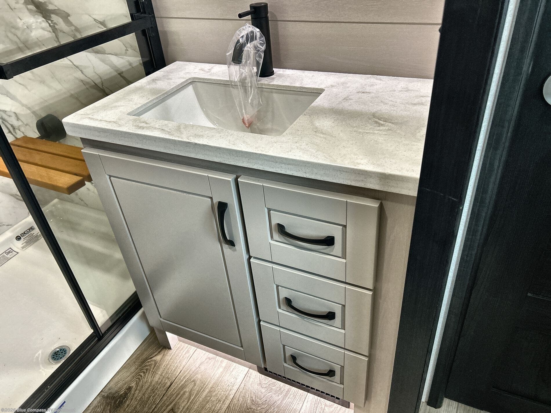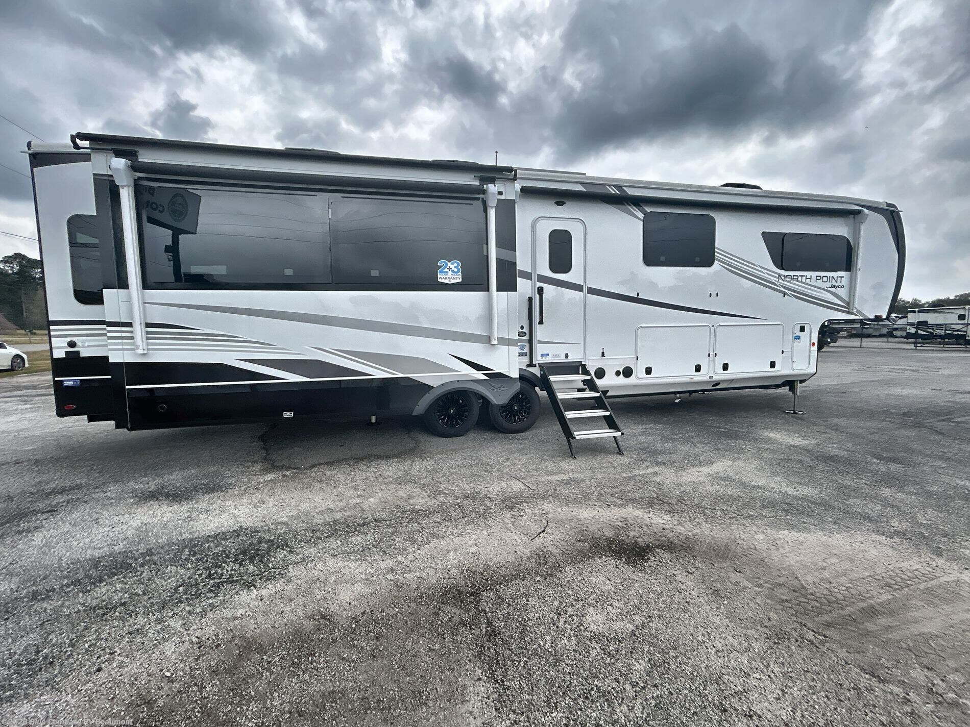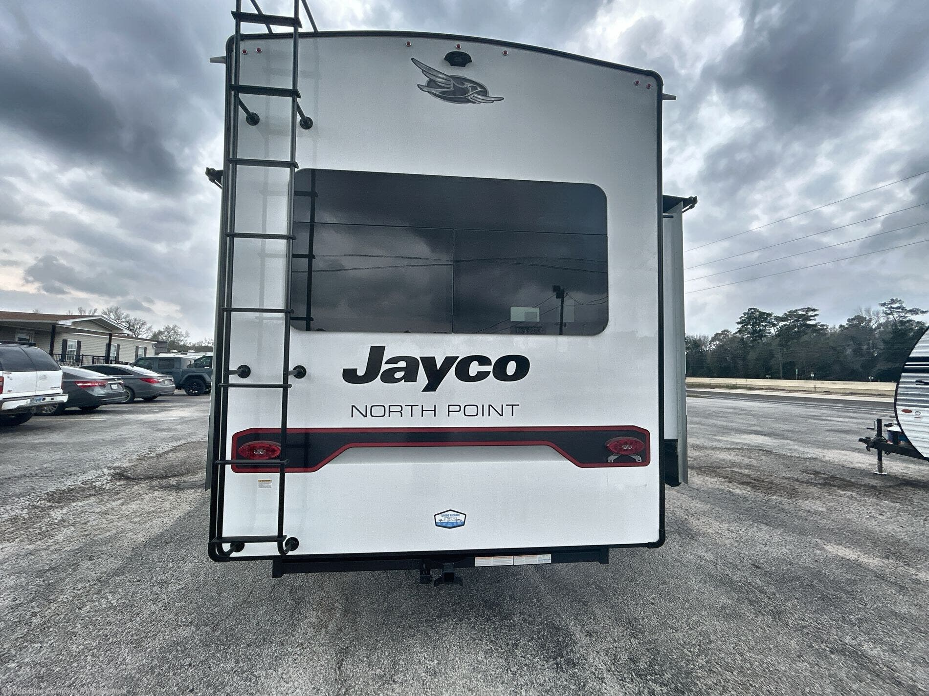 With any North Point fifth wheel by Jayco you begin with a strong foundation with a custom frame, designed and sized specifically to best support each unit. Constructed with Stronghold VBL™ aluminum framed, vacuum bond laminated walls and the Magnum Truss™ XL6™ roof system with an Alpha roof membrane system, which is the strongest tested roof in the industry. The 5-Star Handling package is included with Uniroyal tires, a MORryde rubber pin box, Dexter axles with Nev-R-Adjust brakes, MORryde CRE-3000 rubberized suspension and wet bolt fasteners and bronze bushings. The interior has handcrafted hardwood glazed doors and drawers, vinyl flooring throughout, an integrated under-mount sink in the main bathroom, plus so much more you just have to see one to believe it all!