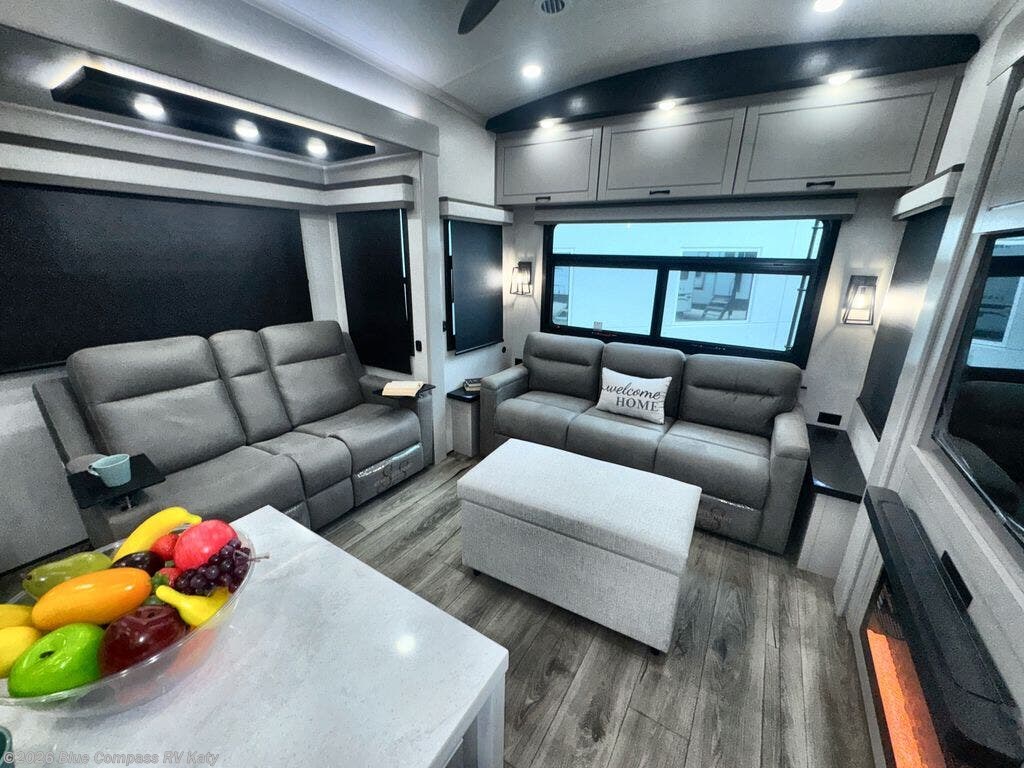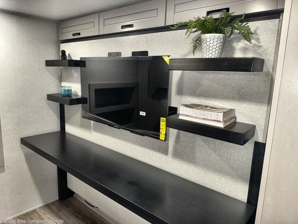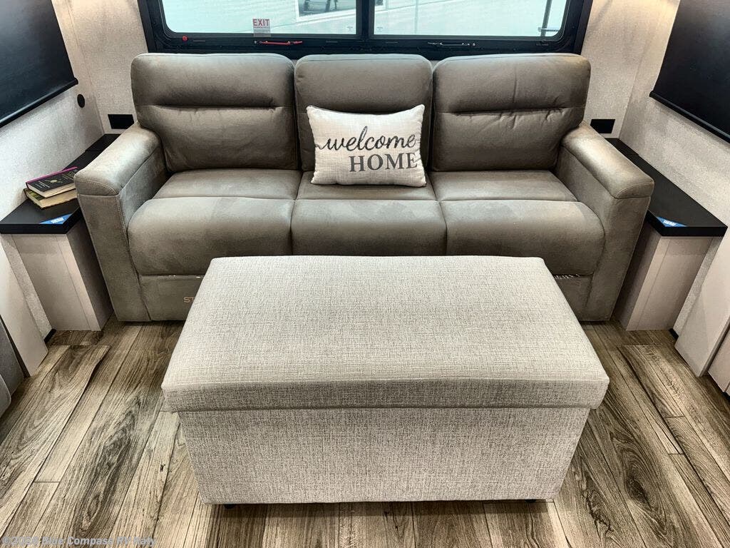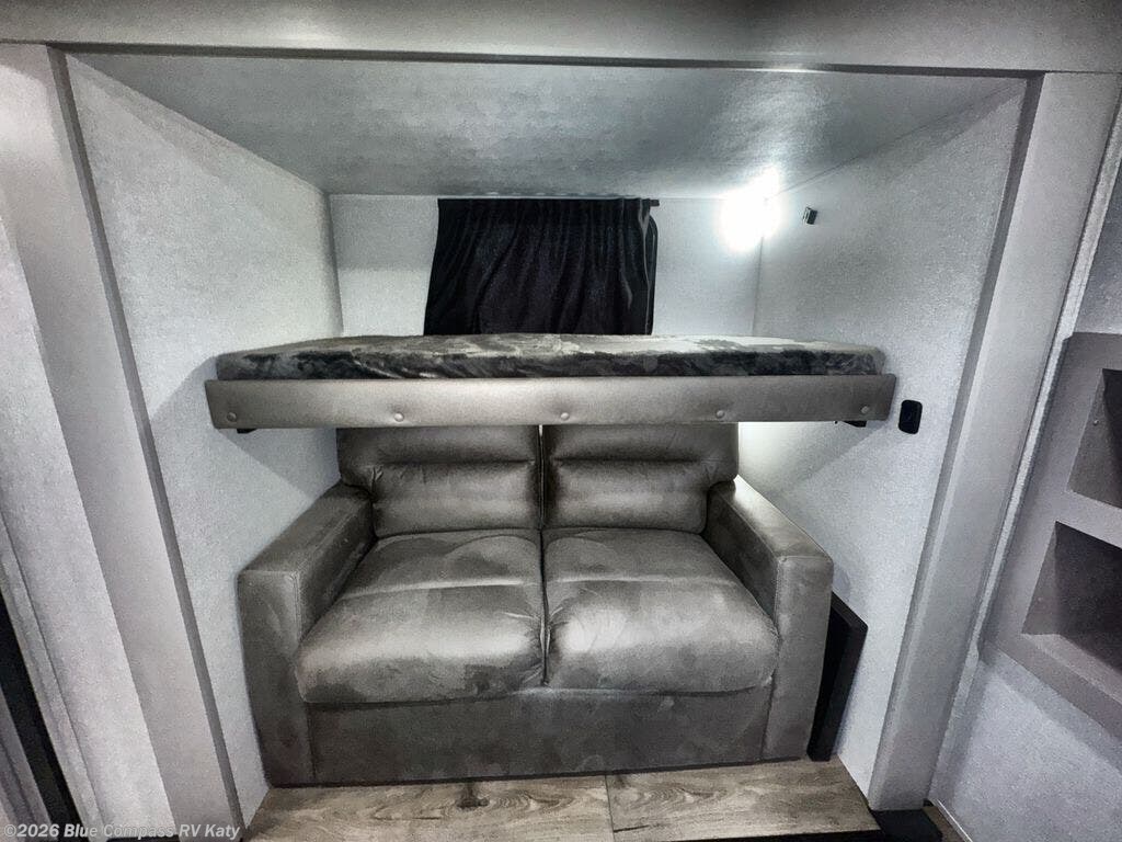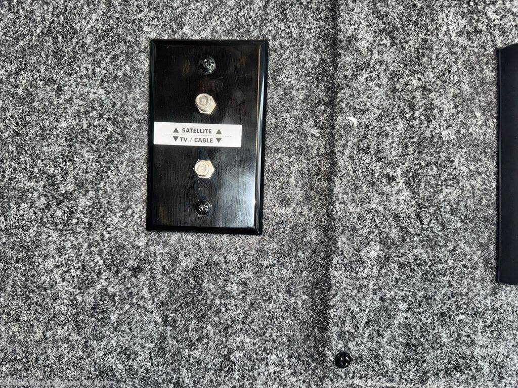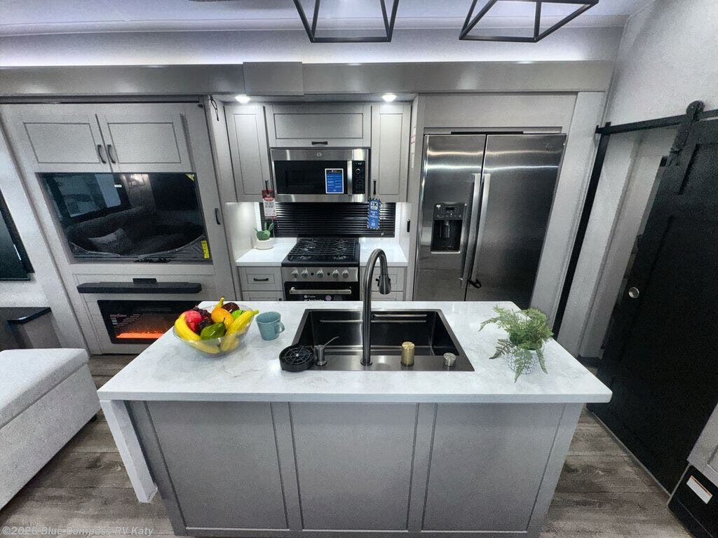 You can work from anywhere with this fifth wheel thanks to the middle bonus room that offers a desk with TV above, a tri-fold sofa with removable table, a flip-up bunk and a closet. This multi-use room works for just about anything including an extra living area and bunkhouse. The shoe storage under the interior steps, the linen cabinet in the full bathroom, the walk-in closet in the bedroom, and the overhead cabinets plus exterior storage allows you to bring whatever you want. Enjoy cooking in the kitchen that provides an island with a flip-up butcher block, a residential refrigerator, a pantry, and everything you need to keep everyone fed. The theater seats, the tri-fold sofa and the free standing table without a pedestal are great places to sit while watching the 50" Smart LED HDTV with fully digital HDMI output and home entertainment system with subwoofer, plus there is a fireplace below for those chilly evenings.