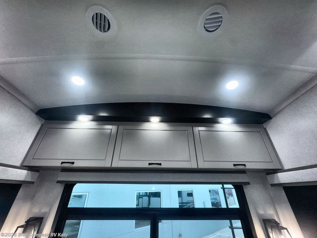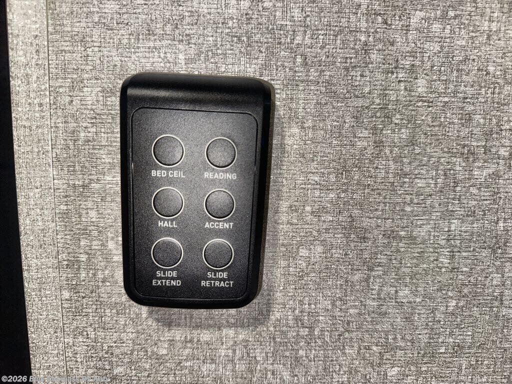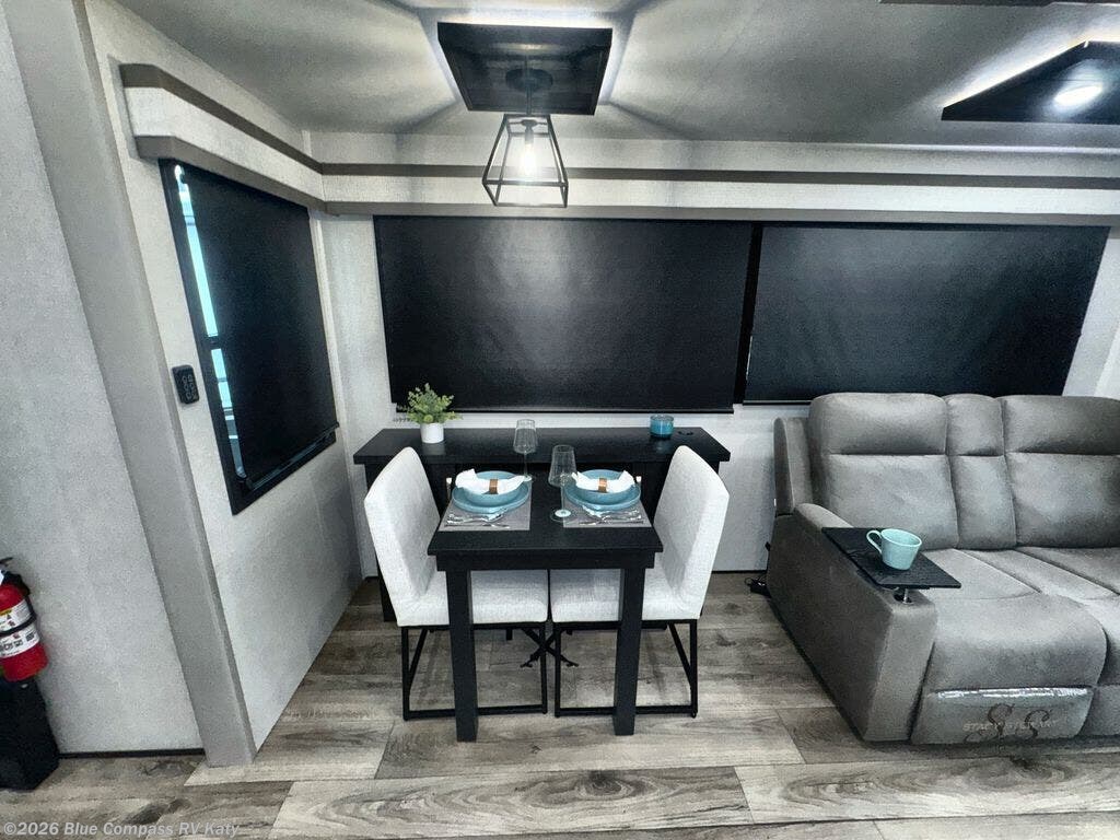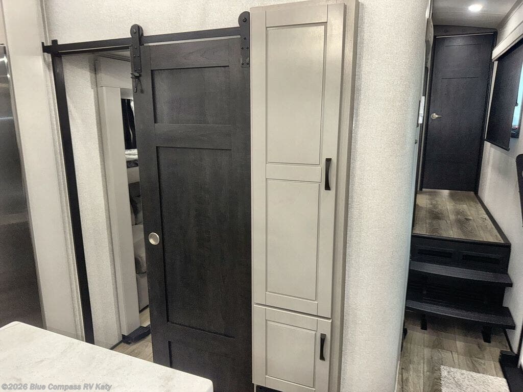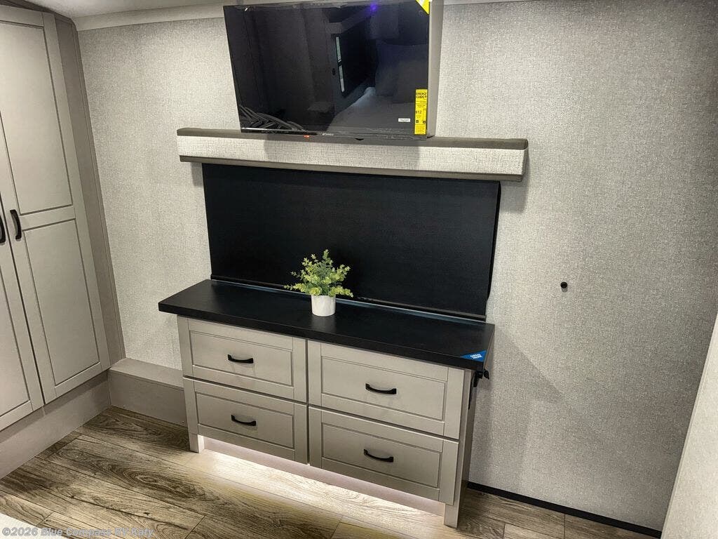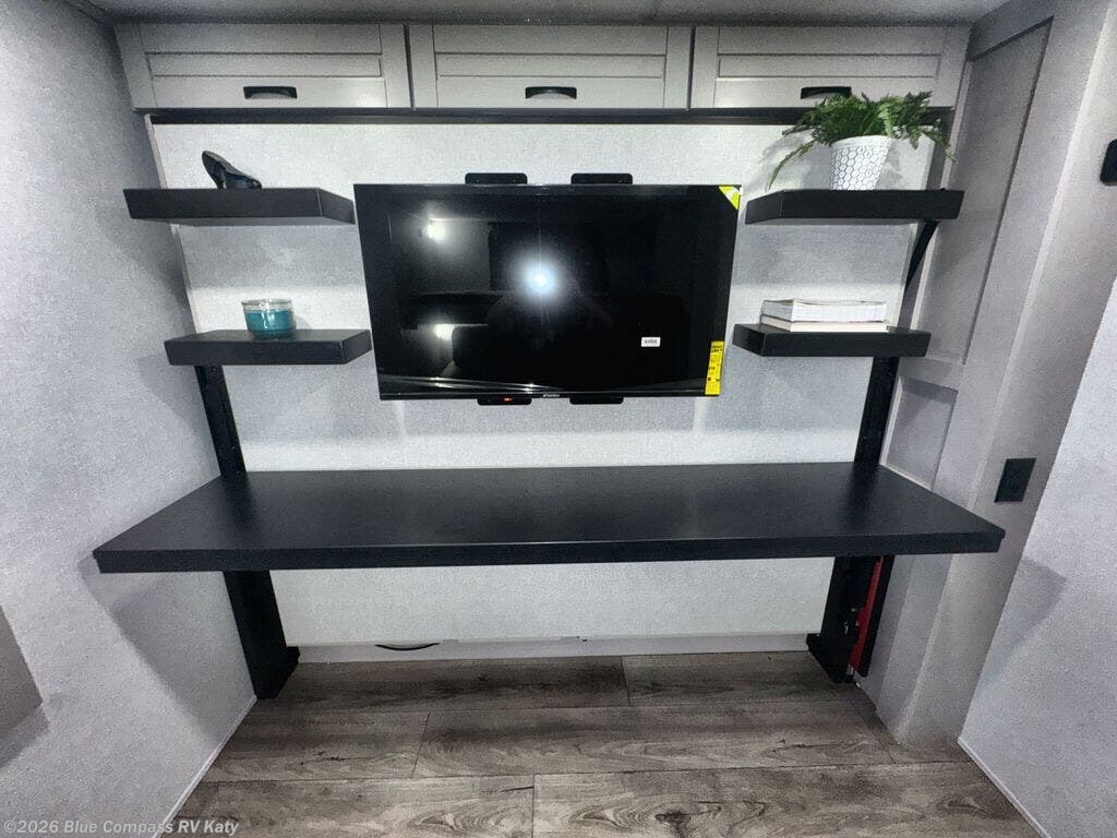 You can work from anywhere with this fifth wheel thanks to the middle bonus room that offers a desk with TV above, a tri-fold sofa with removable table, a flip-up bunk and a closet. This multi-use room works for just about anything including an extra living area and bunkhouse. The shoe storage under the interior steps, the linen cabinet in the full bathroom, the walk-in closet in the bedroom, and the overhead cabinets plus exterior storage allows you to bring whatever you want. Enjoy cooking in the kitchen that provides an island with a flip-up butcher block, a residential refrigerator, a pantry, and everything you need to keep everyone fed. The theater seats, the tri-fold sofa and the free standing table without a pedestal are great places to sit while watching the 50" Smart LED HDTV with fully digital HDMI output and home entertainment system with subwoofer, plus there is a fireplace below for those chilly evenings.