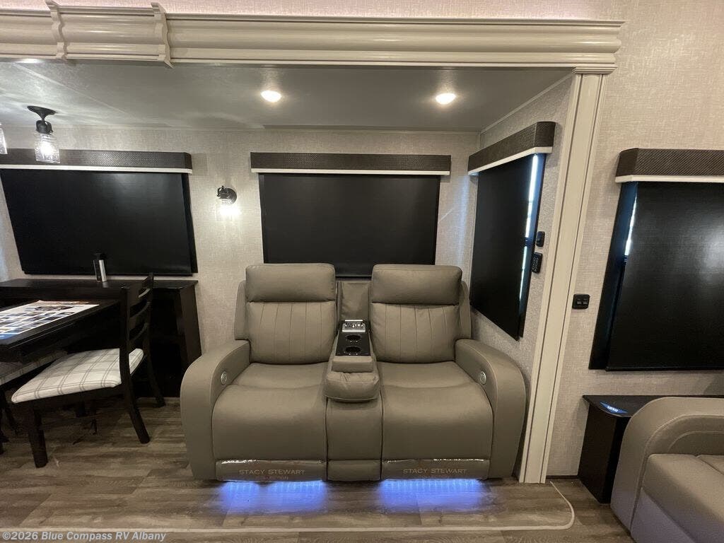 You can work from anywhere with this fifth wheel thanks to the middle bonus room that offers a desk with TV above, a tri-fold sofa with removable table, a flip-up bunk and a murphy bed. This multi-use room works for just about anything including an extra living area and bunkhouse. The linen cabinet in the full bathroom, the drawers / hamper in the bedroom, and the overhead cabinets plus multiple shelves throughout the floorplan allows you to bring whatever you want. Enjoy cooking in the kitchen that provides an island with a flip-up butcher block, a residential refrigerator, a pantry, and everything you need to keep everyone fed. The theater seats and the tri-fold sofa are great places to sit while watching the 4K Smart LED HDTV with fully digital HDMI output and home entertainment system with subwoofer.